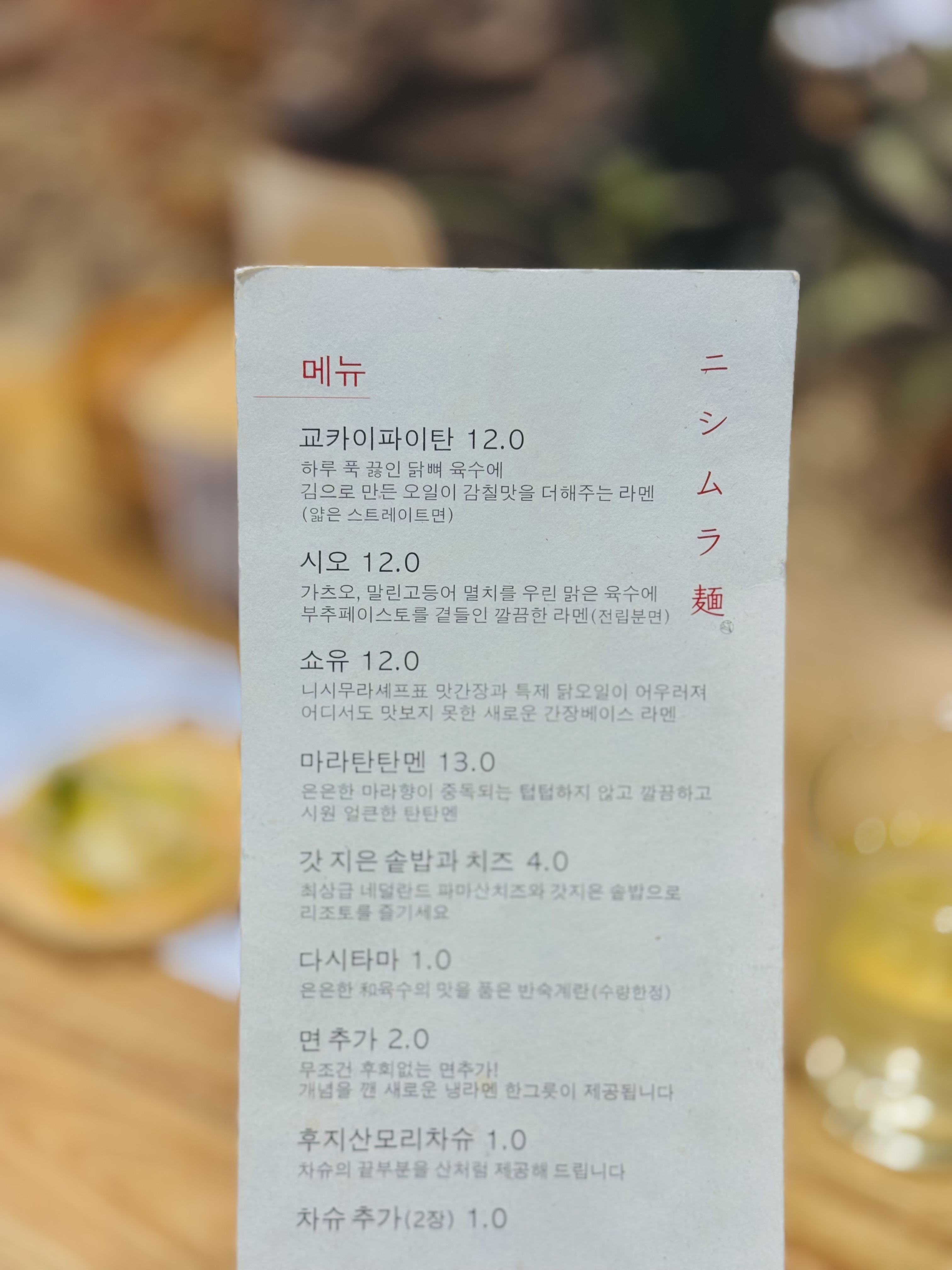 메뉴는 네 종류의 라멘 그리고 사이드 메뉴. 첫 방문 때는 대표 메뉴인 교카이파이탄을 먹었습니다. 그 맛에 감동해 한 달동안 세 번을 방문했어요. 그 때 시오, 쇼유를 추가로 먹었습니다. 가격은 12000원으로 이 동네 평균가(?)지만 양이 좀 적습니다. 교자나 치킨 가라아게같은 사이드 메뉴 대신 닭날개 튀김, 춘권 튀김을 판매하고 면 추가 없이 솥밥을 판매하는 것이 새롭습니다. 사이드 메뉴는 제 취향이 아니지만 솥밥은 조합도 좋고 개성도 있습니다.