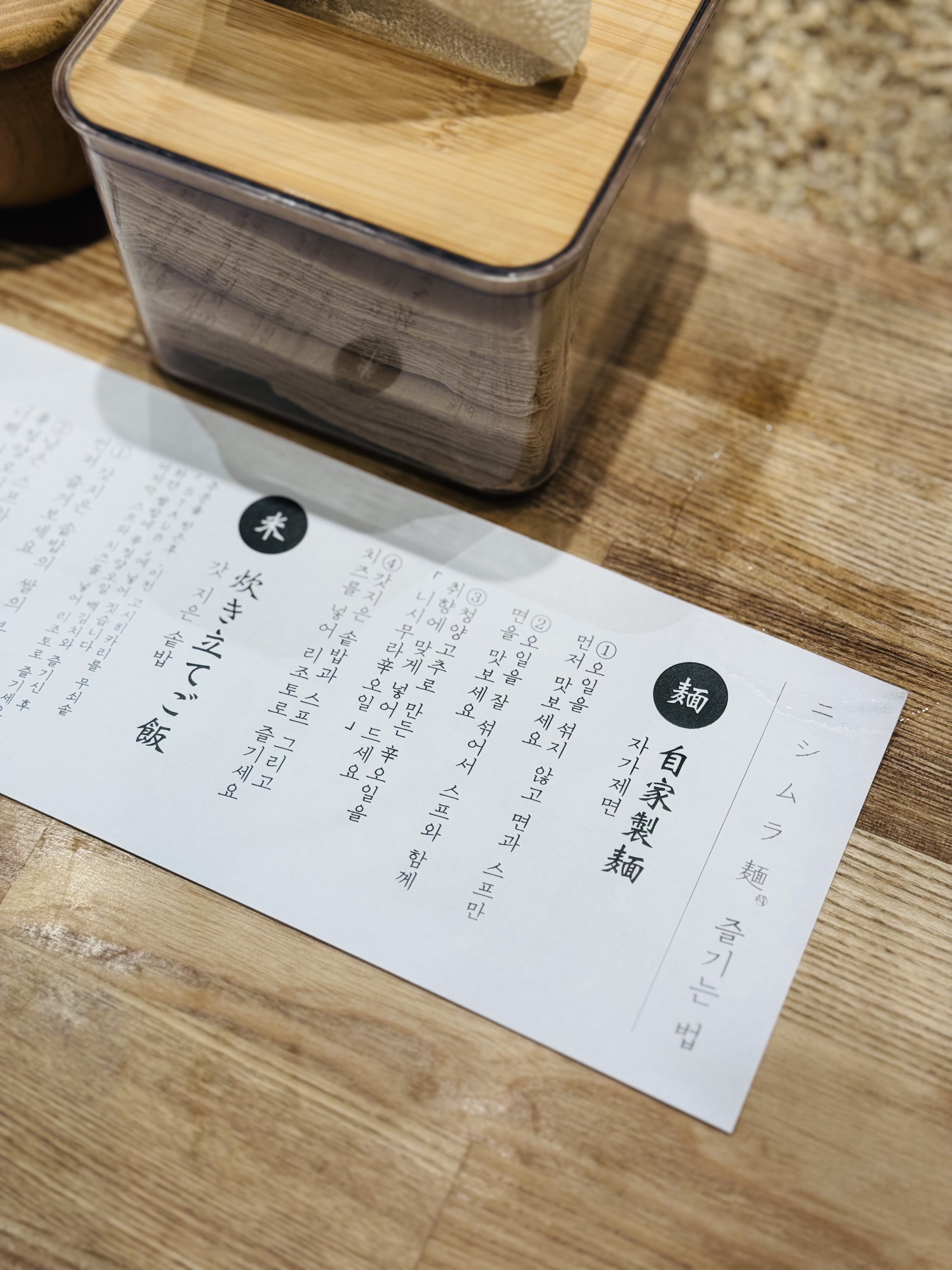 각 테이블에는 메뉴와 음식 즐기는 법이 있습니다. 라멘 먹는 법이야 크게 다른 것 없지만 솥밥을 먹는 방식이 신선했습니다.