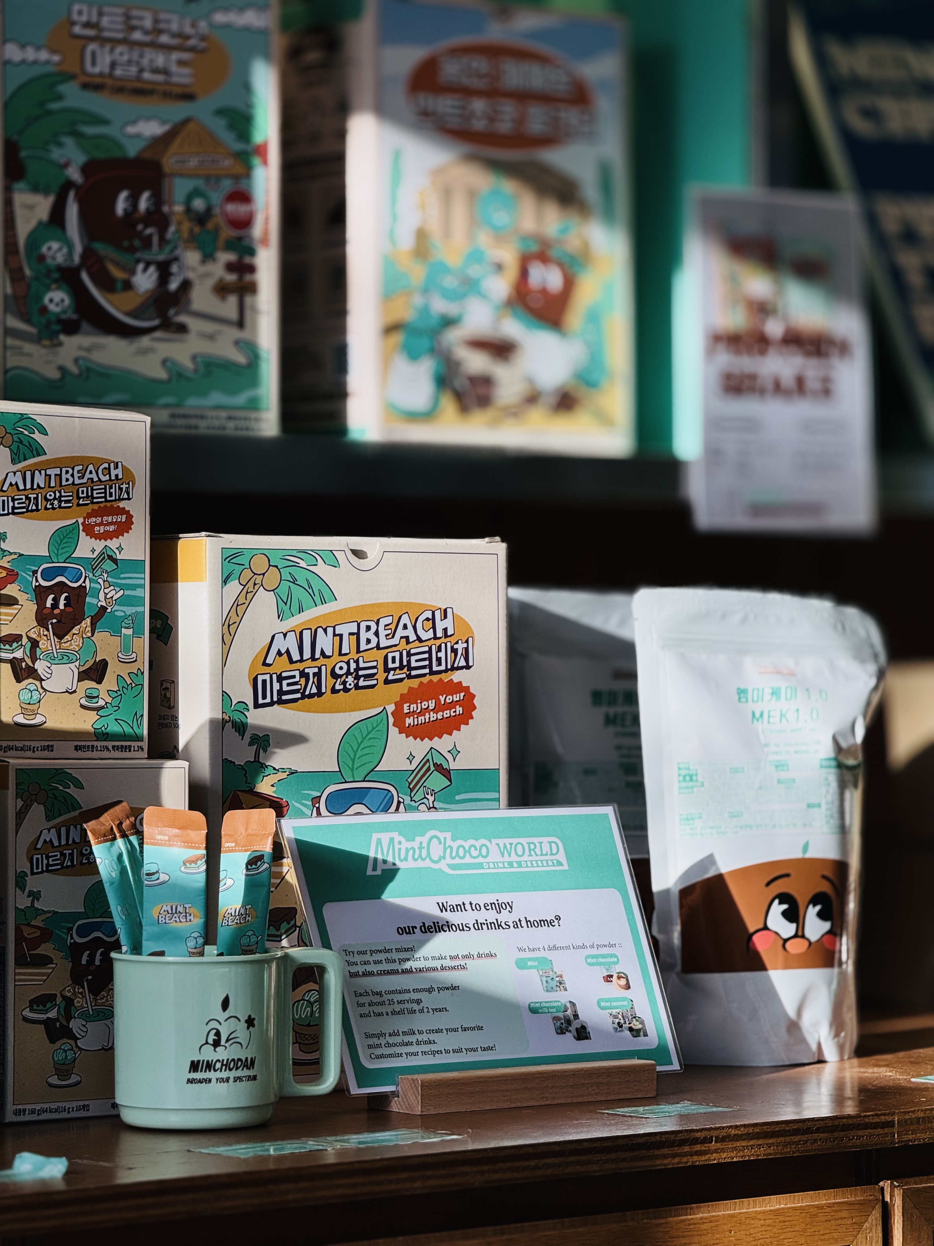 카페 내부가 큰 편은 아니었는데 음료, 디저트 외에도 민초 관련 상품들이 꽤 많이 전시돼 있었습니다. '민초단' 브랜드에서 만든 간식류와 머그컵 등의 상품들까지. 제가 민트색은 그럭저럭 좋아해서 그런지 보는 즐거움은 있었어요.