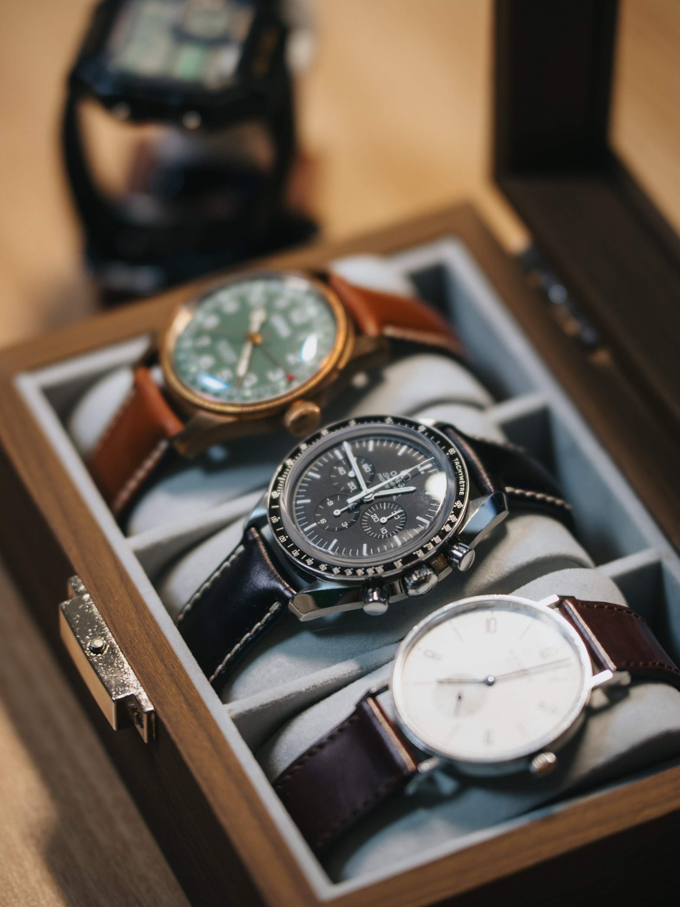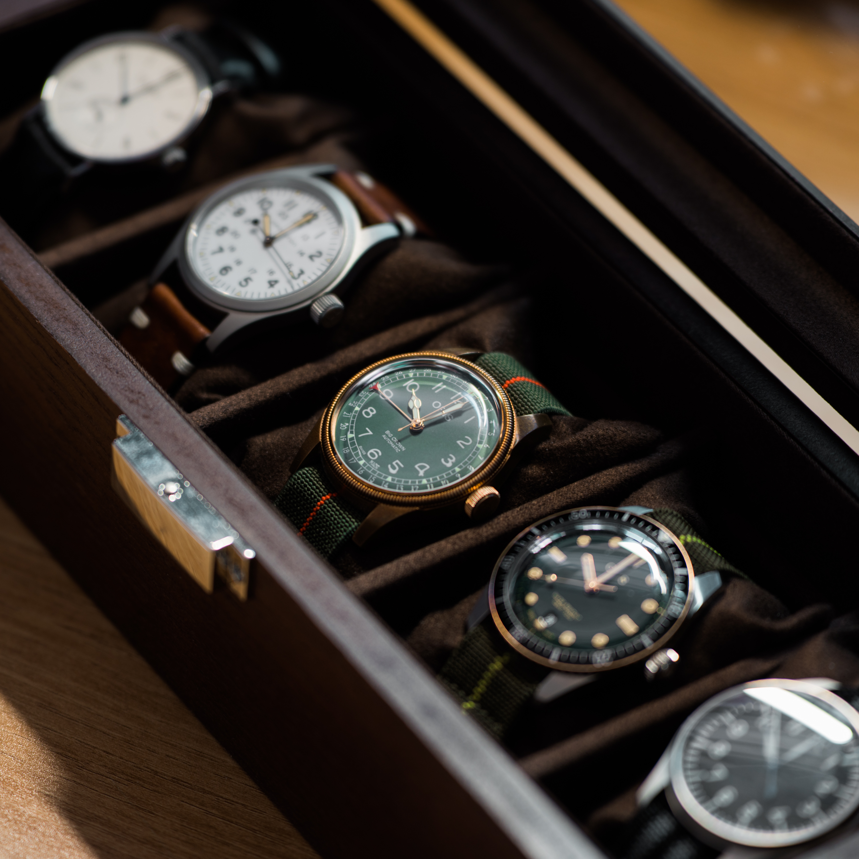 얼굴이라면 어떤 시계에도 밀리지 않는다고 생각합니다. 클래식 디자인과 녹색 다이얼, 브론즈 케이스까지 그시절 제 취향에 꼭 맞아서 구매했는데 여전히 즐겨 차고 있습니다. 땀 나는 여름만 빼고요. 문워치 영입을 위해 다섯 개의 컬렉션을 정리했을 때 예상을 깨고 살아 남은 시계입니다. 이 시계도 가죽, 나토 스트랩을 모두 잘 소화합니다.