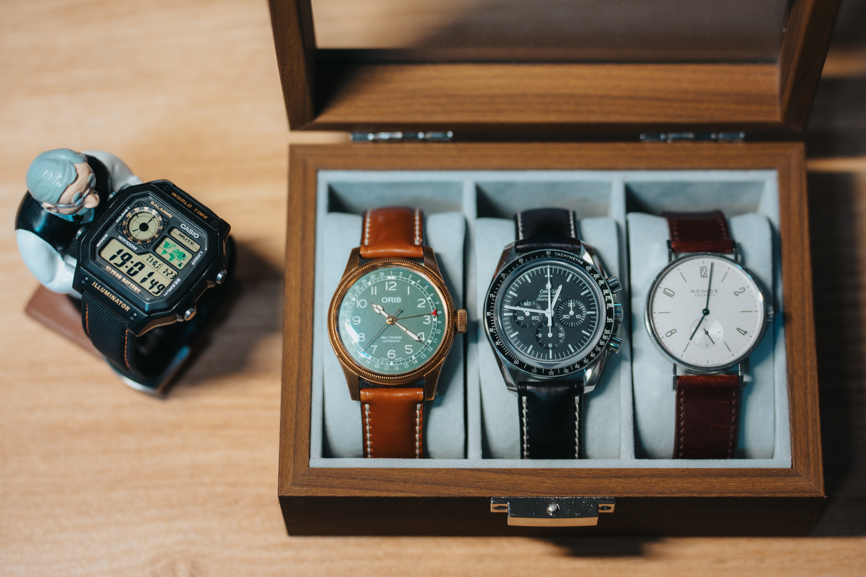 그렇게 완성된 새 라인업은 이렇습니다. 원톱 문워치, 얼굴만 보면 제 이상형인 오리스 빅크라운 포인터데이트 브론즈 그리고 오랜만에 재회한 노모스 탕겐테. 거기에 애플워치를 대신할 카시오 전자 시계도 있습니다. 한동안 욕심 없이 쓸 수 있을 것 같은 구성입니다.