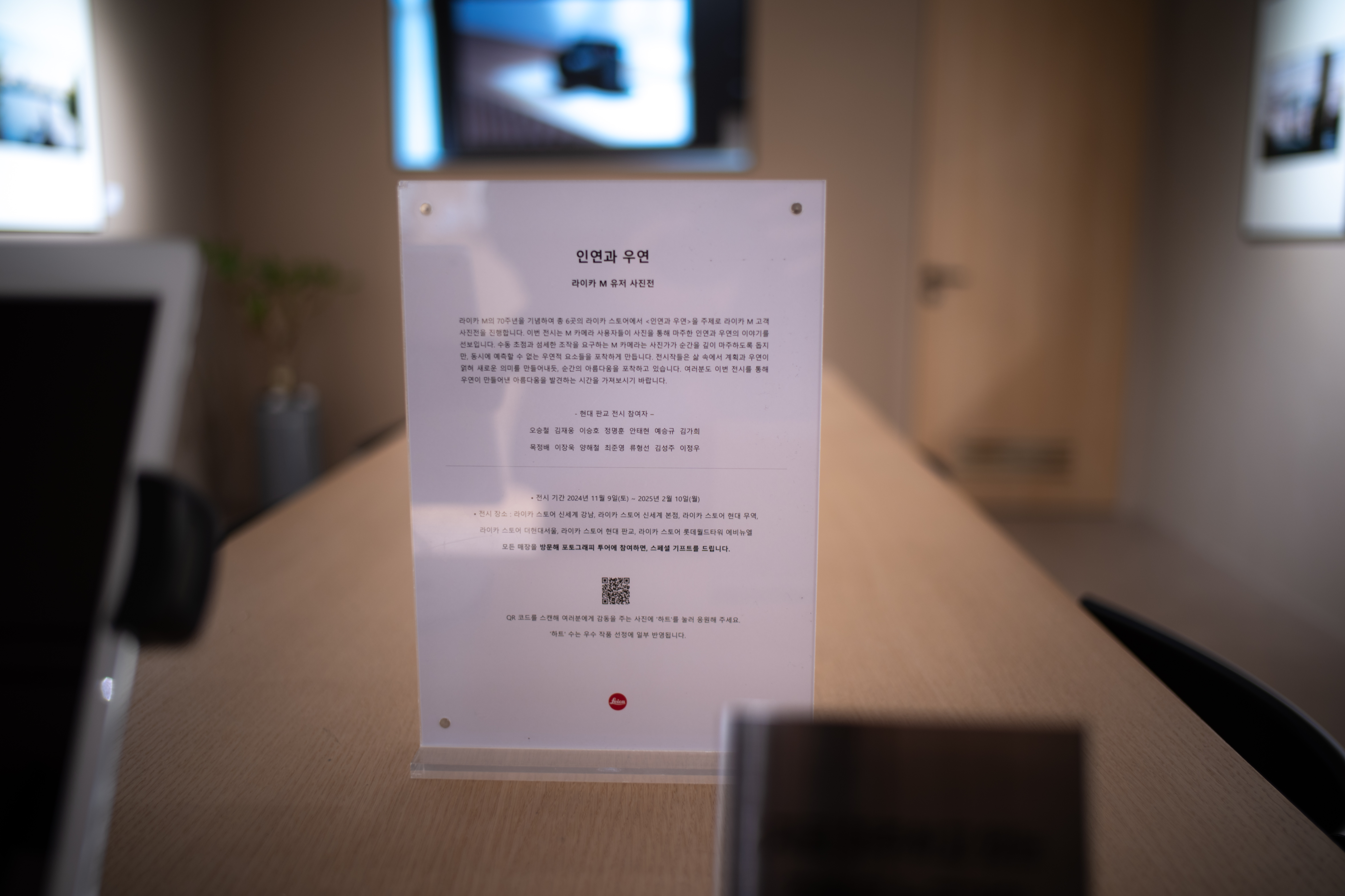 두 번째 이벤트인 M 유저 사진전은 지난해 11월부터 올해 2월 10일까지 진행됐습니다. 저는 늑장을 부리다 마지막 날 부랴부랴 스토어에 다녀왔어요. 제 사진은 판교 현대백화점 라이카 스토어에 걸려 있었습니다. 요즘 라이카 스토어는 볼 게 많습니다. M11-D, M11 글로시 블랙 그리고 100주년 기념 상품들까지.