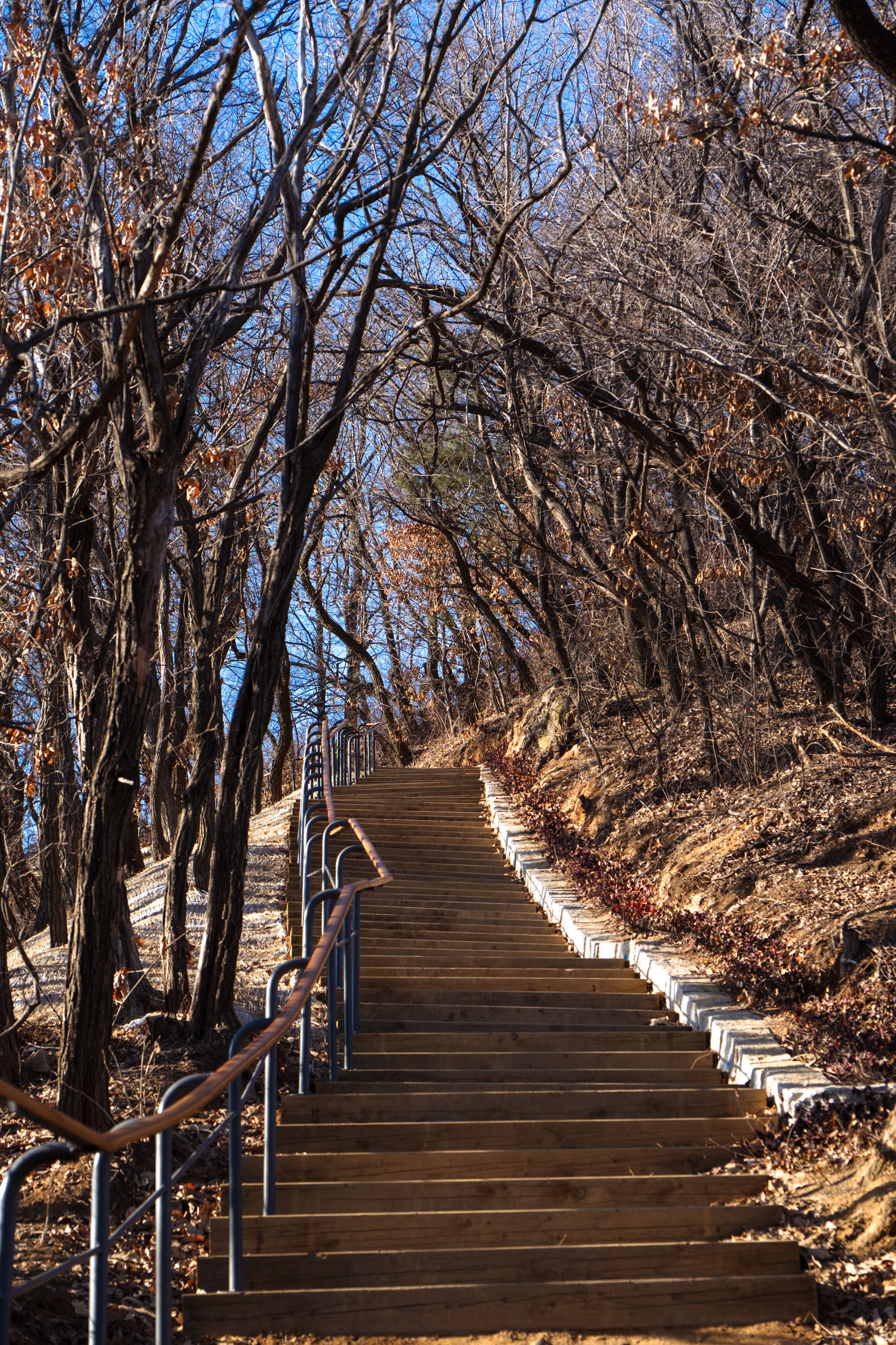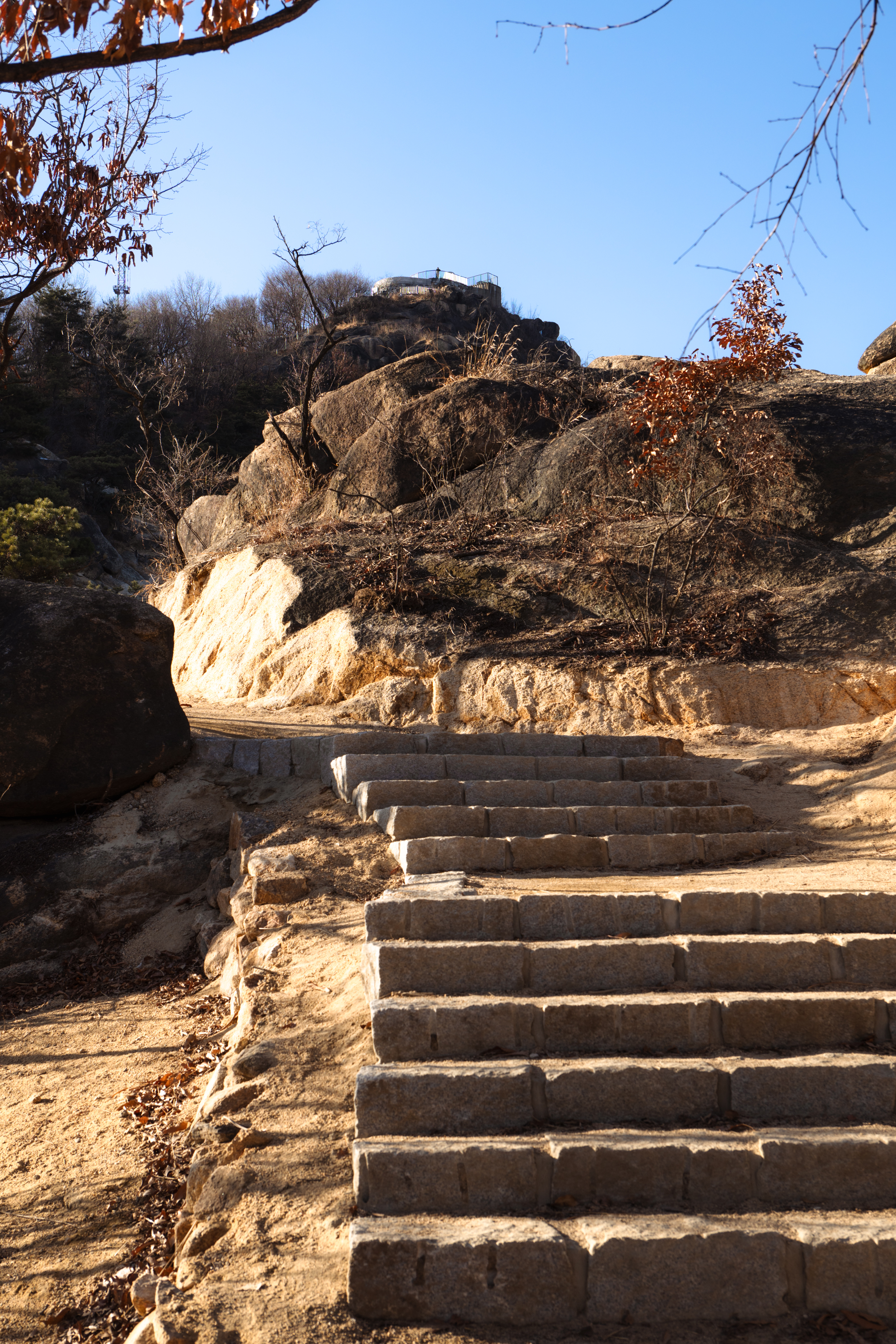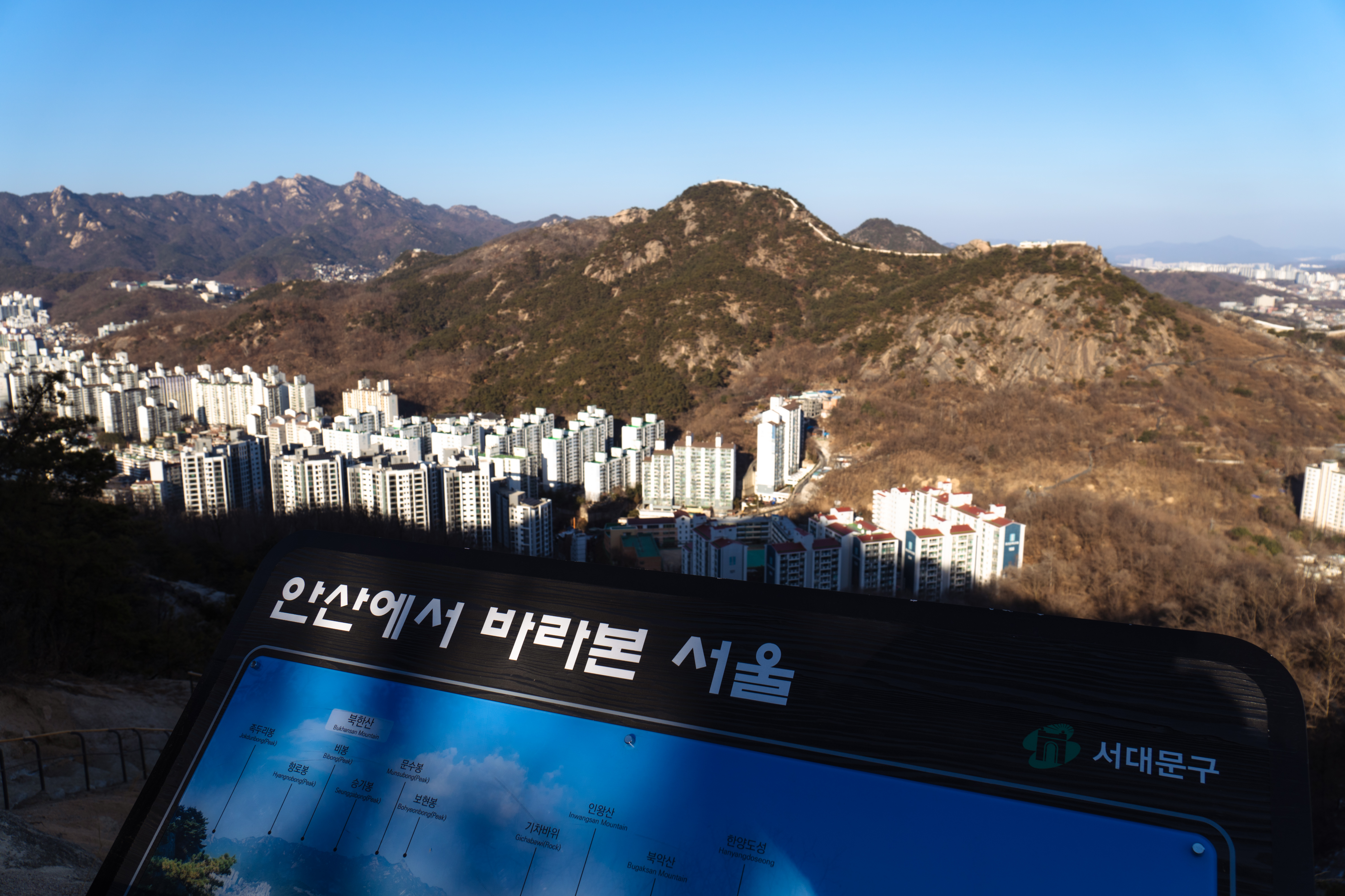 이날 목표는 안산 정상에 있는 봉수대. 해발 약 300m의 낮은 산입니다. 중간 중간 정비되지 않은 돌언덕들이 있지만 초반부 안산자락길부터 데크가 잘 되어 있는 편입니다. 그래서 가벼운 옷차림으로 산책 나온 주민들도 많았습니다. 기념관부터 봉수대까지 지도상으로는 40분쯤 걸린다고 나왔지만 실제로는 20분이 조금 넘게 걸렸습니다. 숨이 차서 두어 번 쉬었는데도 금방 도착했으니 서울 시내 전망 보이는 출사지로는 비교적 난이도 낮은 곳이 아닐까 싶어요. 응봉산보다 조금 더 힘이 드는 수준.