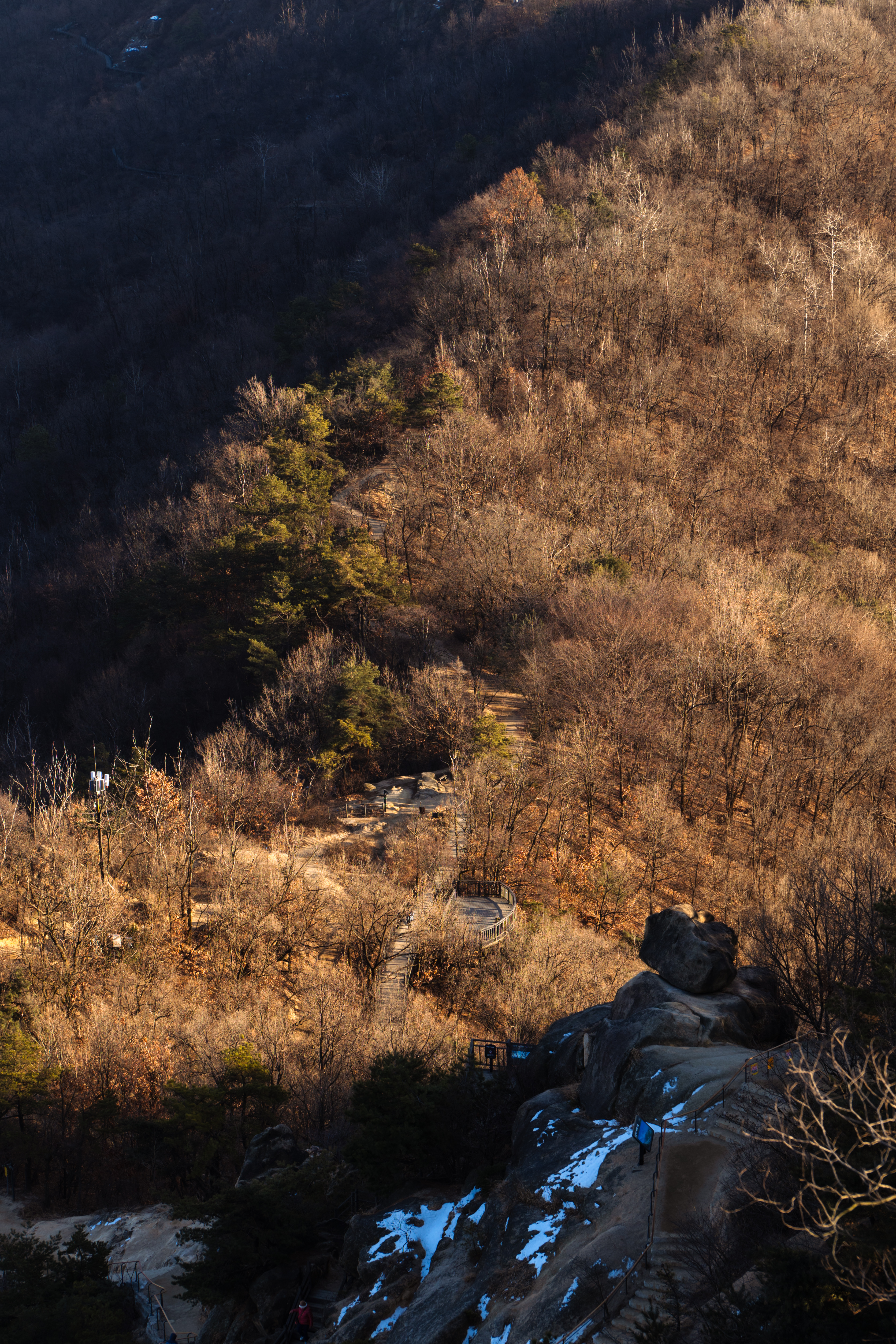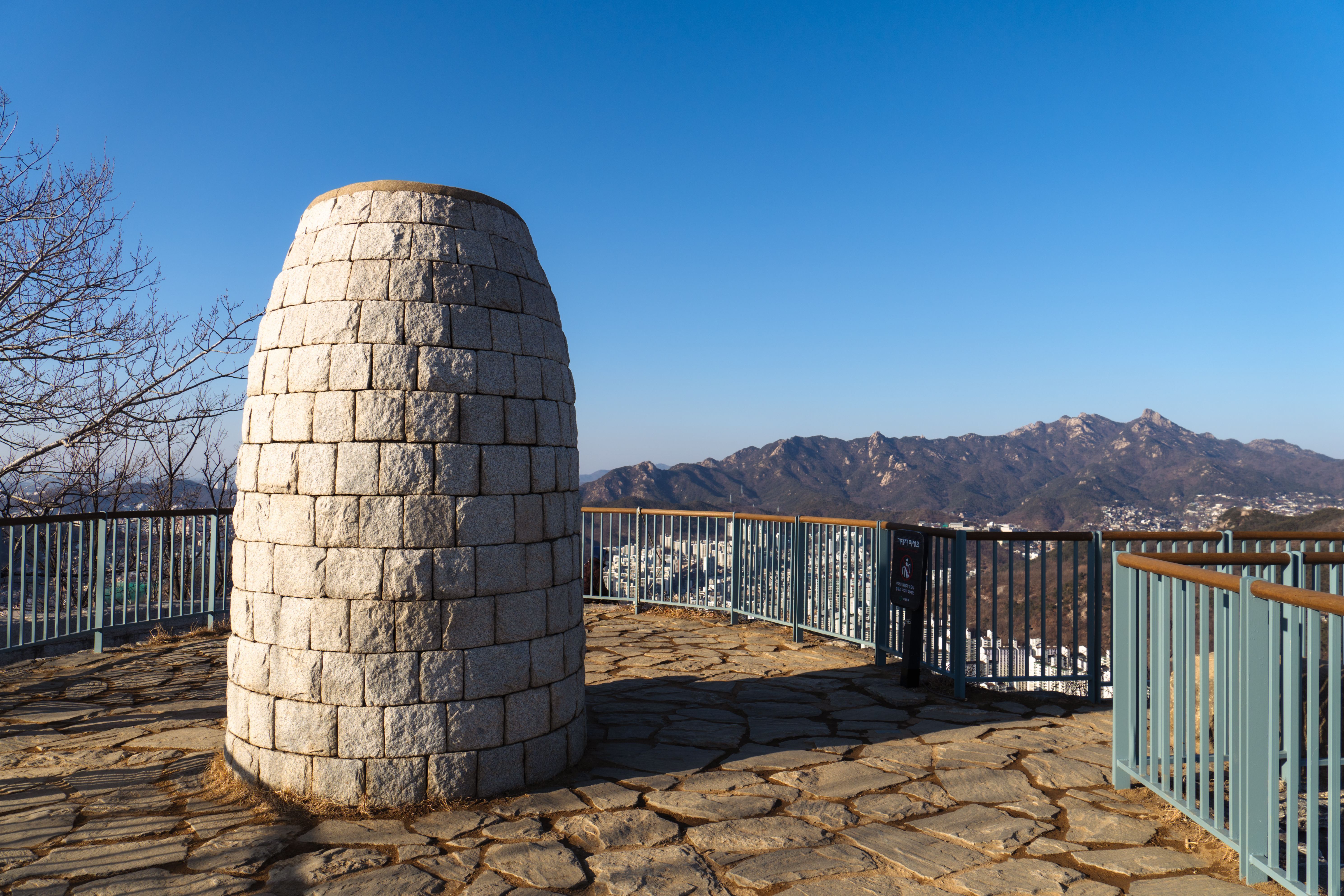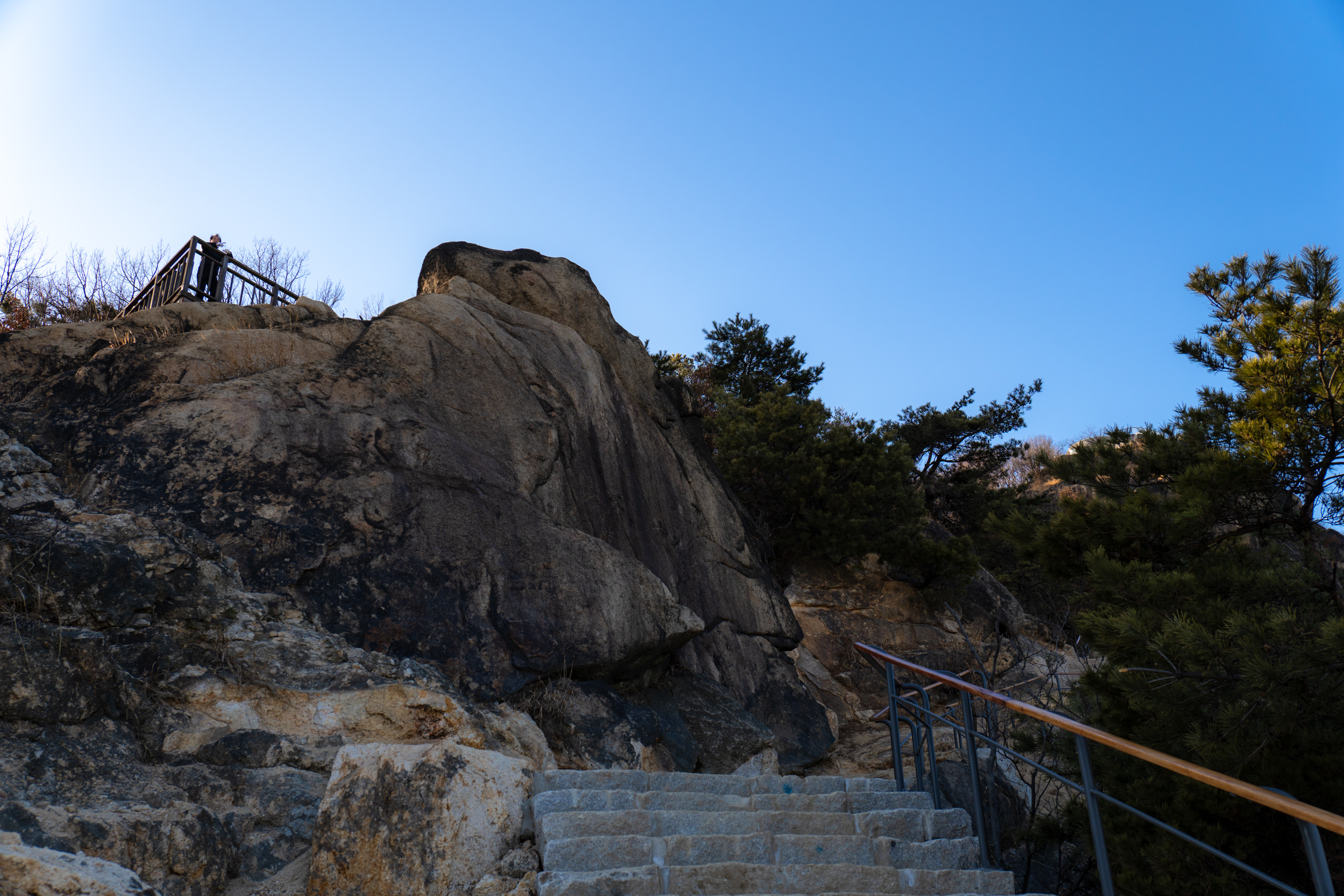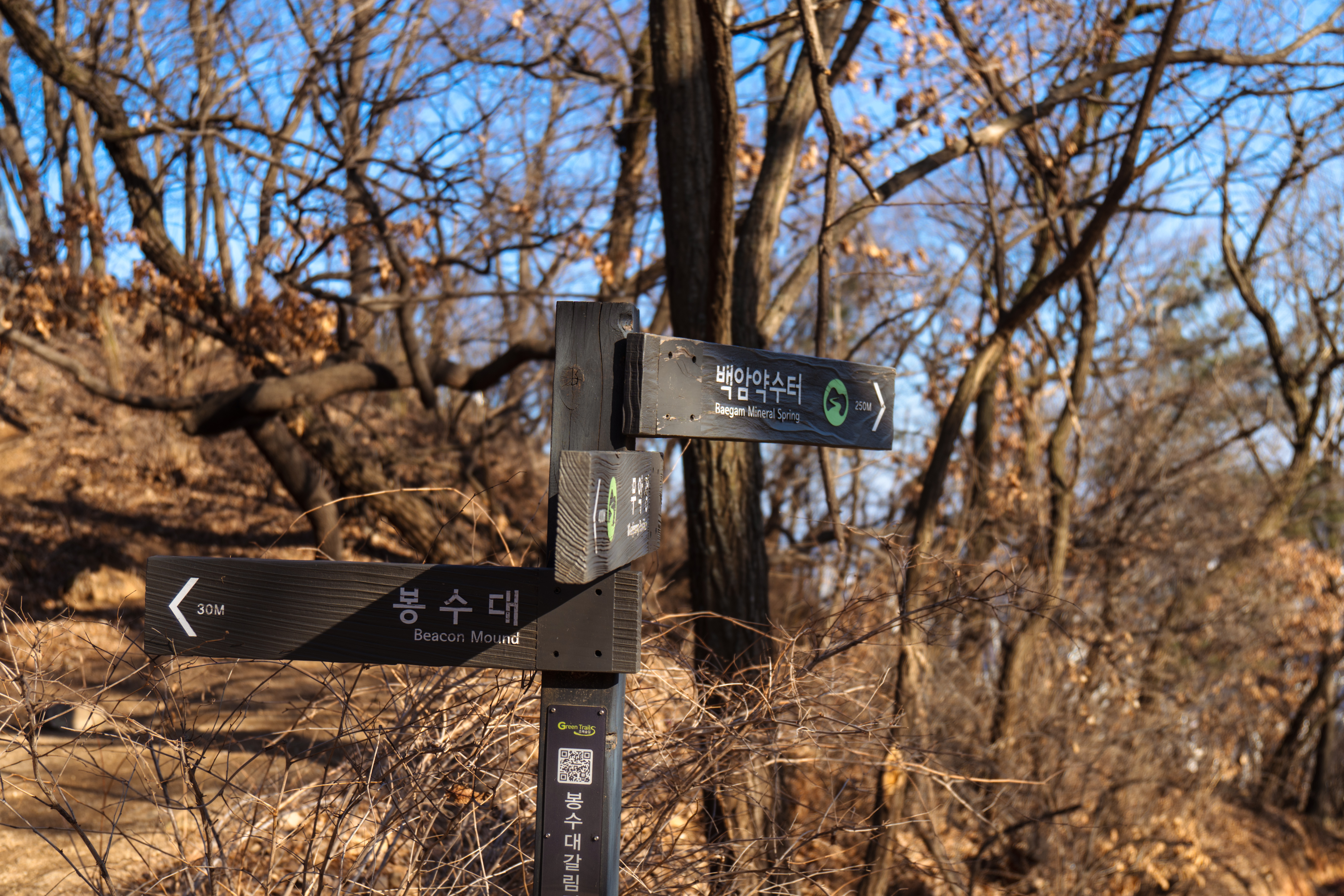 이날 목표는 안산 정상에 있는 봉수대. 해발 약 300m의 낮은 산입니다. 중간 중간 정비되지 않은 돌언덕들이 있지만 초반부 안산자락길부터 데크가 잘 되어 있는 편입니다. 그래서 가벼운 옷차림으로 산책 나온 주민들도 많았습니다. 기념관부터 봉수대까지 지도상으로는 40분쯤 걸린다고 나왔지만 실제로는 20분이 조금 넘게 걸렸습니다. 숨이 차서 두어 번 쉬었는데도 금방 도착했으니 서울 시내 전망 보이는 출사지로는 비교적 난이도 낮은 곳이 아닐까 싶어요. 응봉산보다 조금 더 힘이 드는 수준.