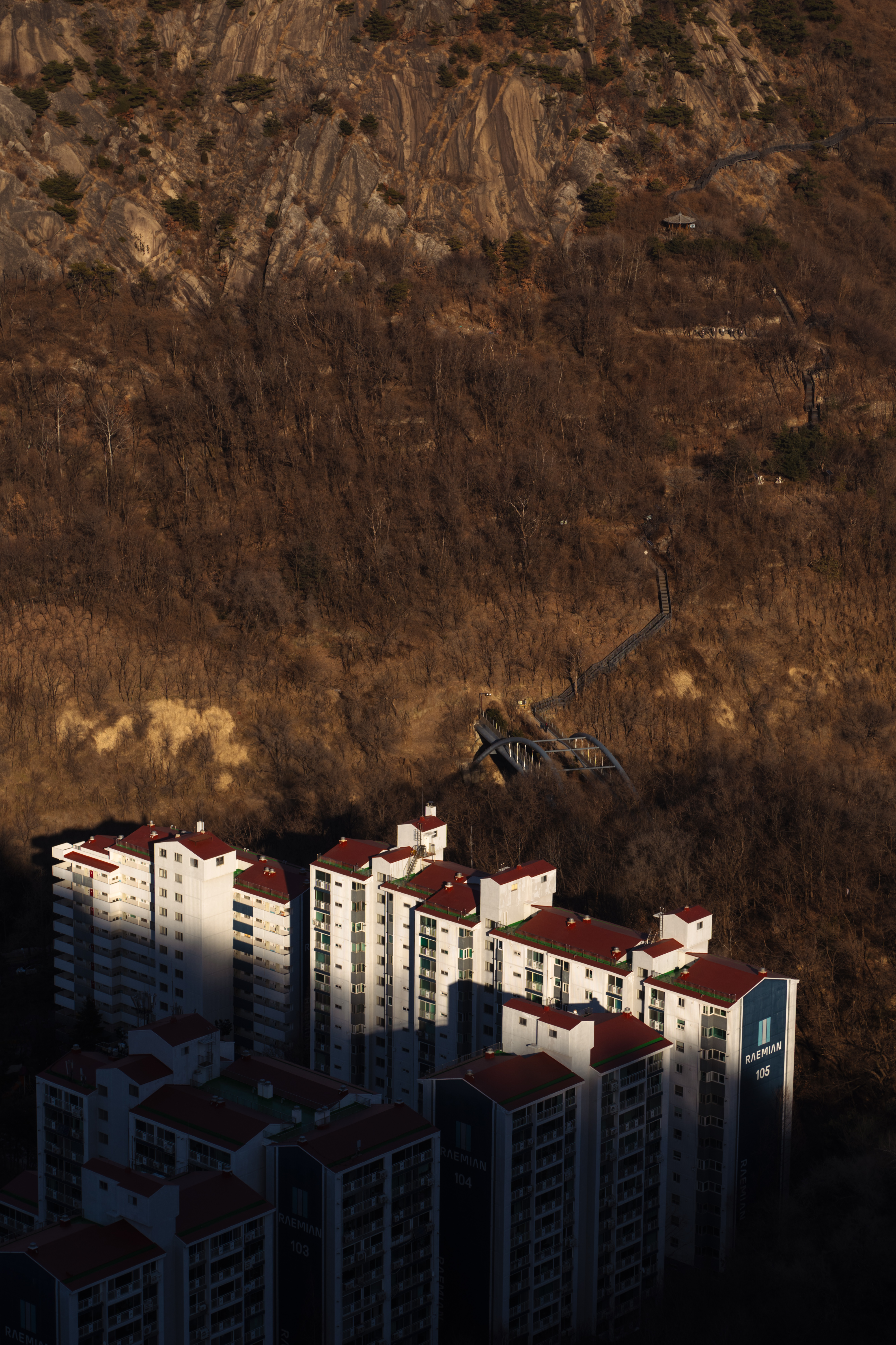 17-70mm의 초점거리는 35mm 환산 약 25-105mm입니다. 탁 트인 전망대에선 17mm가 부족하게 느껴지지 않았습니다. 위/아래를 자르면 파노라마 이미지로 연출할 수 있을 정도로 시원시원한 프레임을 즐길 수 있었어요. 예상보다 더 재미있었던 것은 70mm 망원의 활용입니다. 넓게 보이는 풍경의 일부분을 떼어서 촬영하는 것이 재미있더군요. 남산 주변, 한강과 더 현대 서울이 포함된 전망, 지난 산책길과 산 아래 자리 잡은 아파트 단지 등. 그 속에 있을 때는 느낄 수 없던 도시의 다양한 모습들을 보고 담을 수 있었습니다.