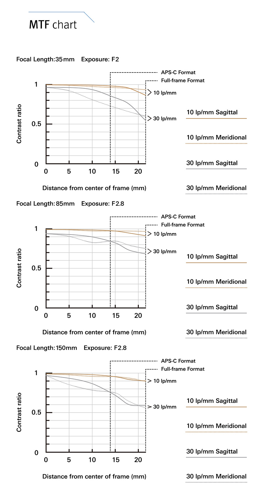 35-150mm 구간 모두 최대 개방에서 약간의 해상력 저하가 있지만 중심부는 F4에서 대부분 해소됩니다. 주변부 해상력은 F5.6-8구간에서 눈에 띄게 나아지지만 35mm 광각은 해상력과 광량 저하가 다른 구간보다 도드라집니다. 망원 구간은 F16 이상 조리개 값에서 회절 현상으로 인한 해상력 저하가 확연합니다. 앞서 언급했듯 이 렌즈는 밝은 조리개 값의 개방 촬영에 중점을 두고 설계된 것으로 보입니다. F4-5.6 내외의 조리개 값을 설정한다면 어떤 구간에서든 최상의 결과물을 얻을 수 있습니다.