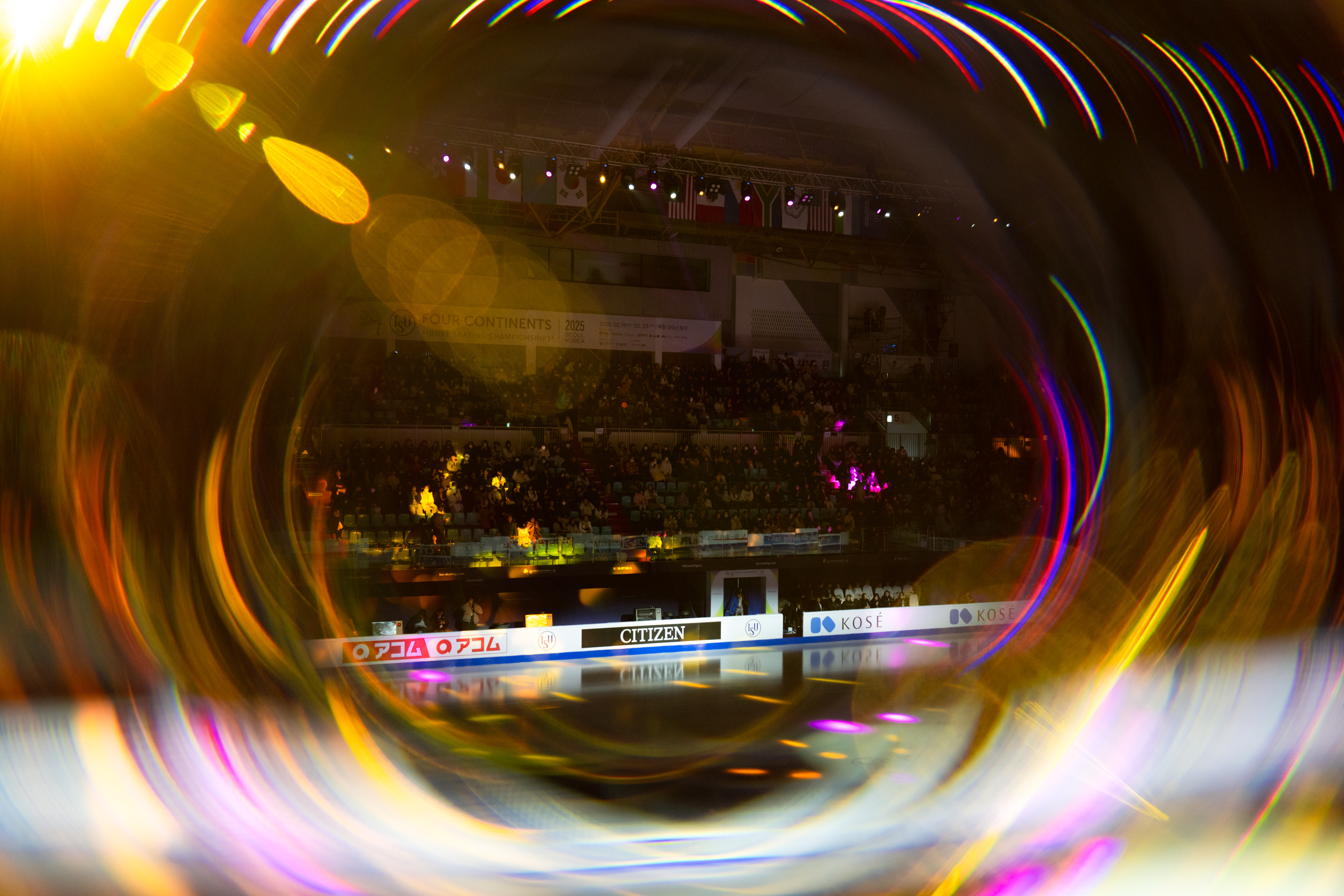 망원 촬영에서는 헤일로 효과가 광각 촬영과 사뭇 다른 느낌으로 나타납니다. 원형 또는 짧은 곡선으로 나타난 헤일로 효과가 초점 거리와 함께 크기가 커지면서 화면 전체를 덮을 정도가 되는데, 광원의 숫자와 색에 따라 굉장히 화려한 표현이 가능합니다. 이날은 실내 스포츠 촬영에 필터를 사용해 봤는데 화려한 조명들이 필터를 통해 크고 선명한 곡선들로 나타났어요. 일반 촬영보다 훨씬 더 화려한 장면이 되었습니다.