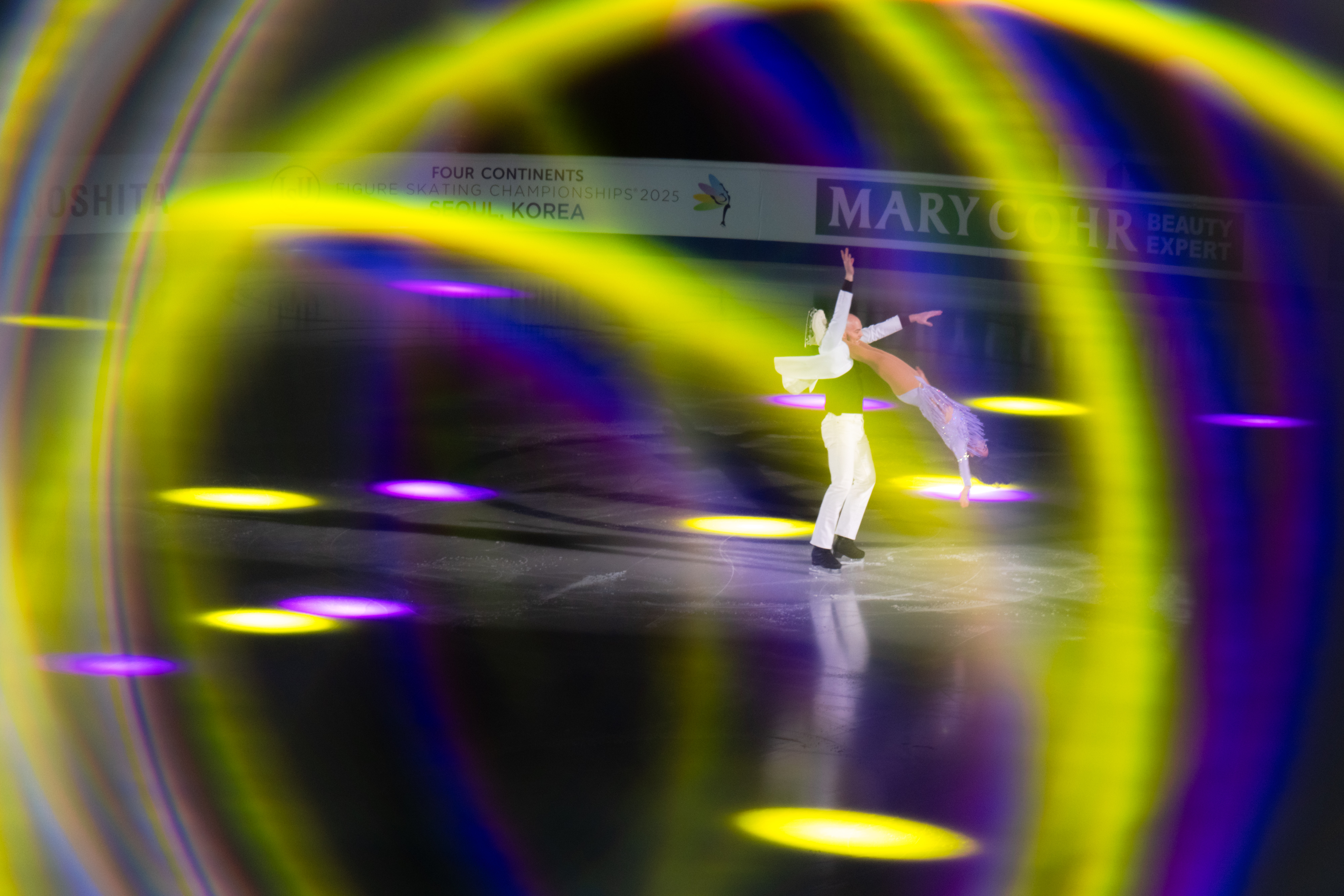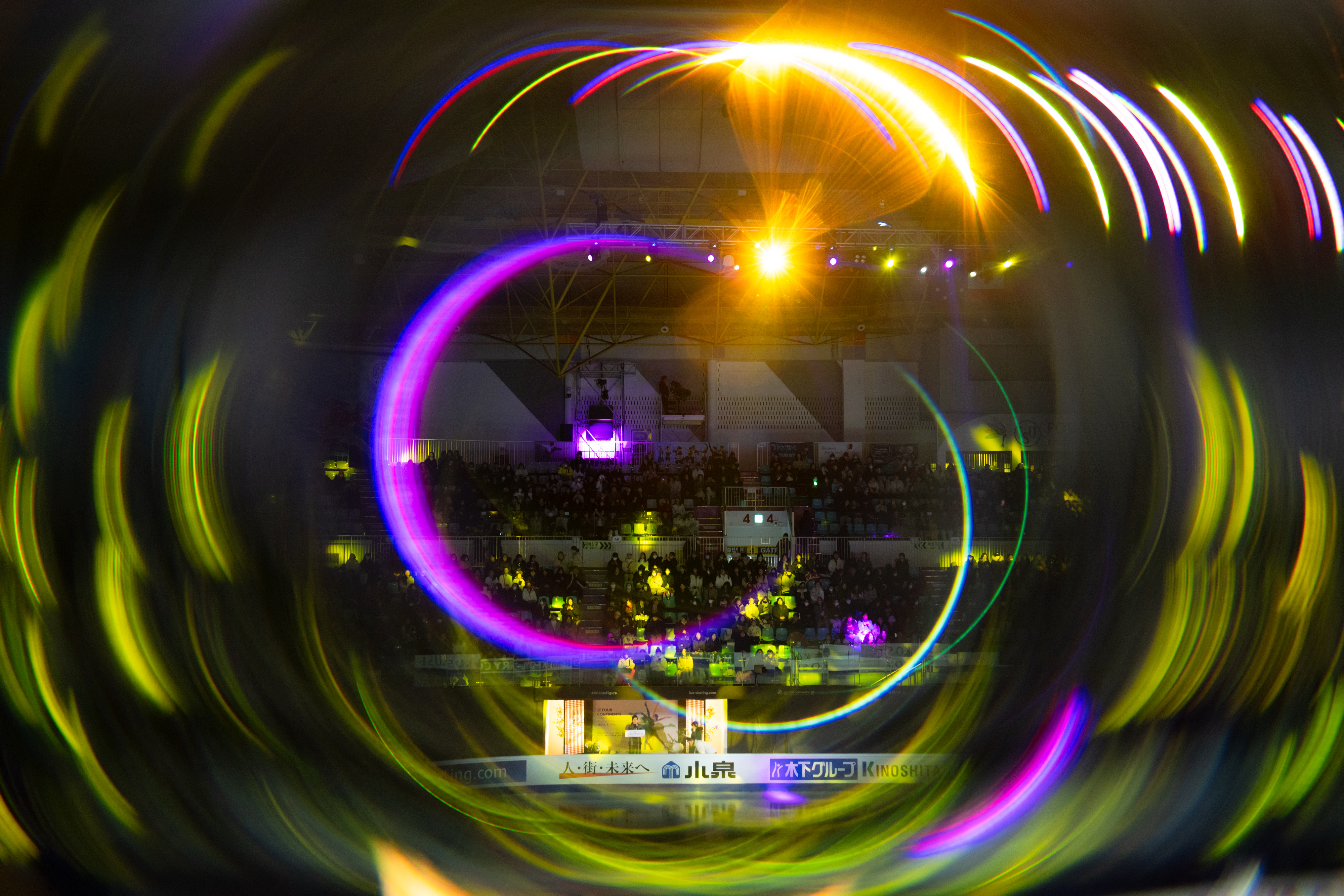 망원 촬영에서는 헤일로 효과가 광각 촬영과 사뭇 다른 느낌으로 나타납니다. 원형 또는 짧은 곡선으로 나타난 헤일로 효과가 초점 거리와 함께 크기가 커지면서 화면 전체를 덮을 정도가 되는데, 광원의 숫자와 색에 따라 굉장히 화려한 표현이 가능합니다. 이날은 실내 스포츠 촬영에 필터를 사용해 봤는데 화려한 조명들이 필터를 통해 크고 선명한 곡선들로 나타났어요. 일반 촬영보다 훨씬 더 화려한 장면이 되었습니다.