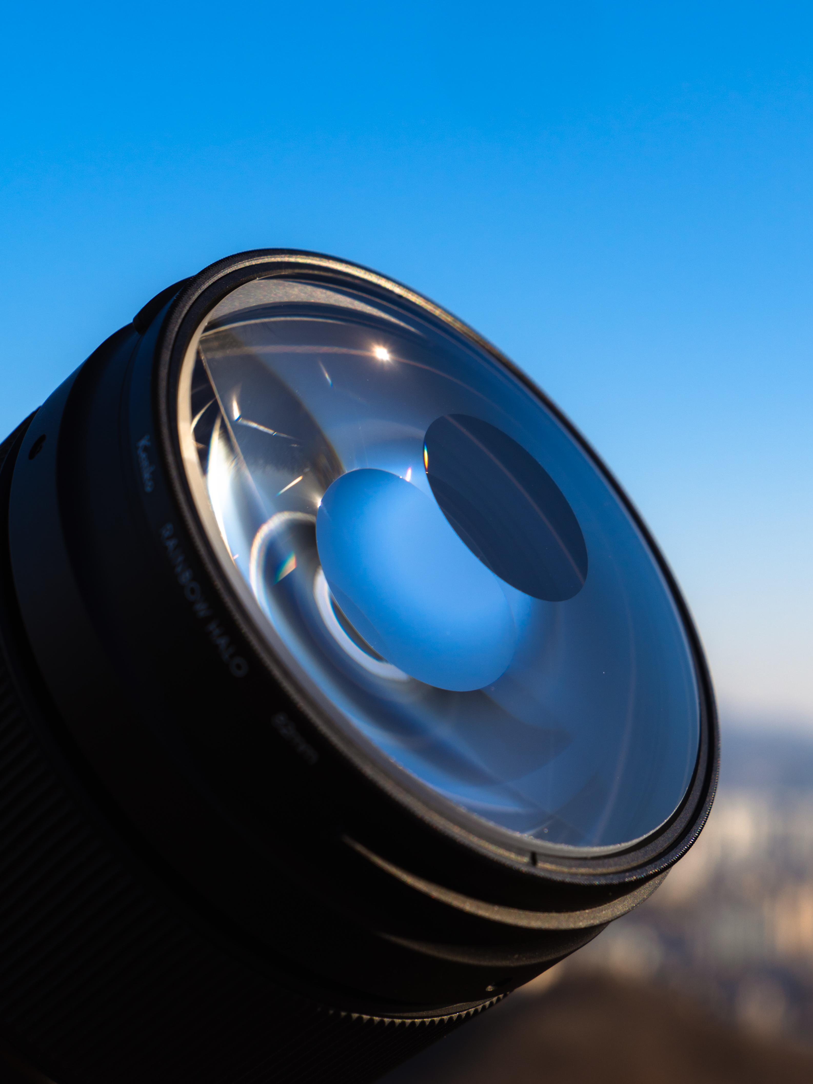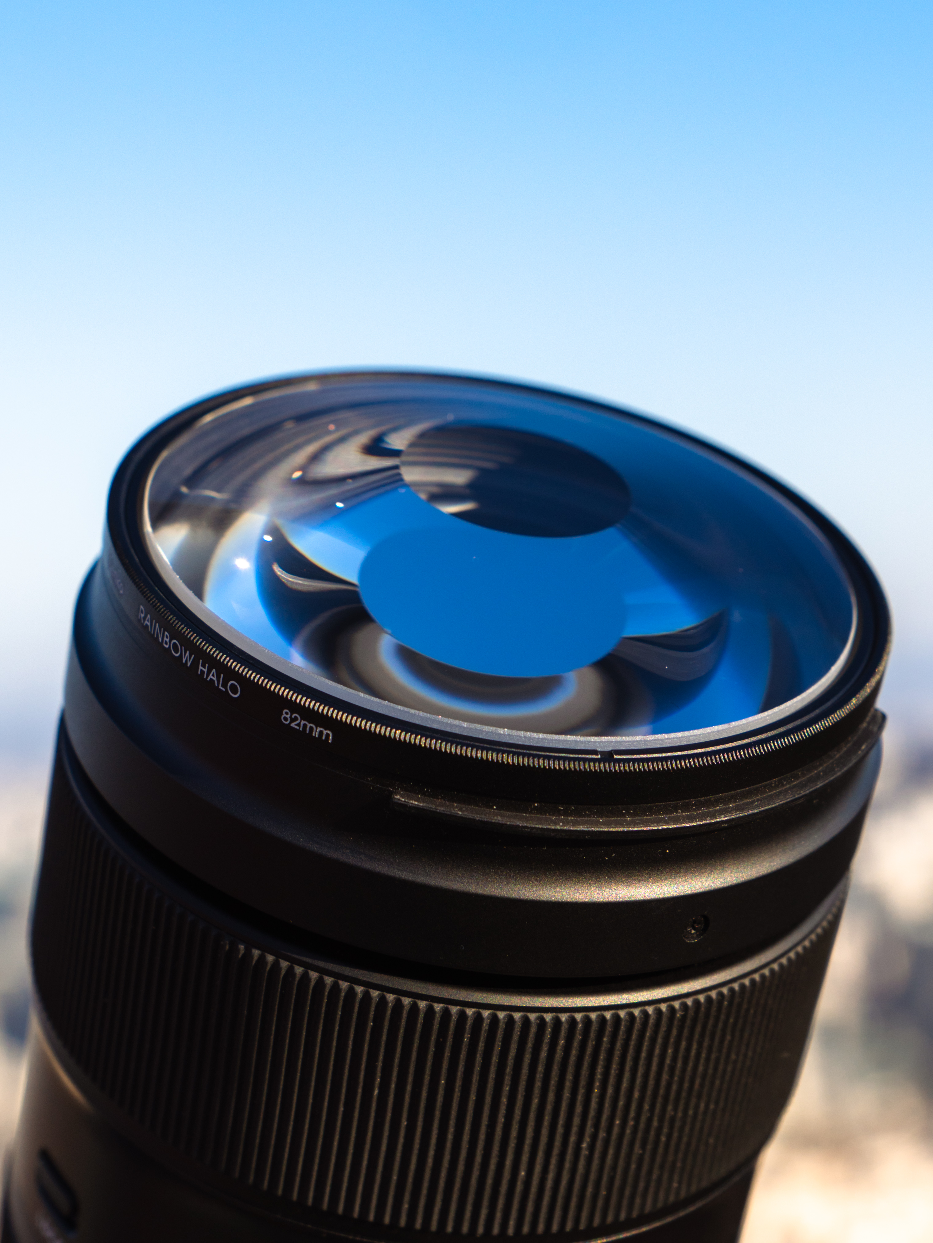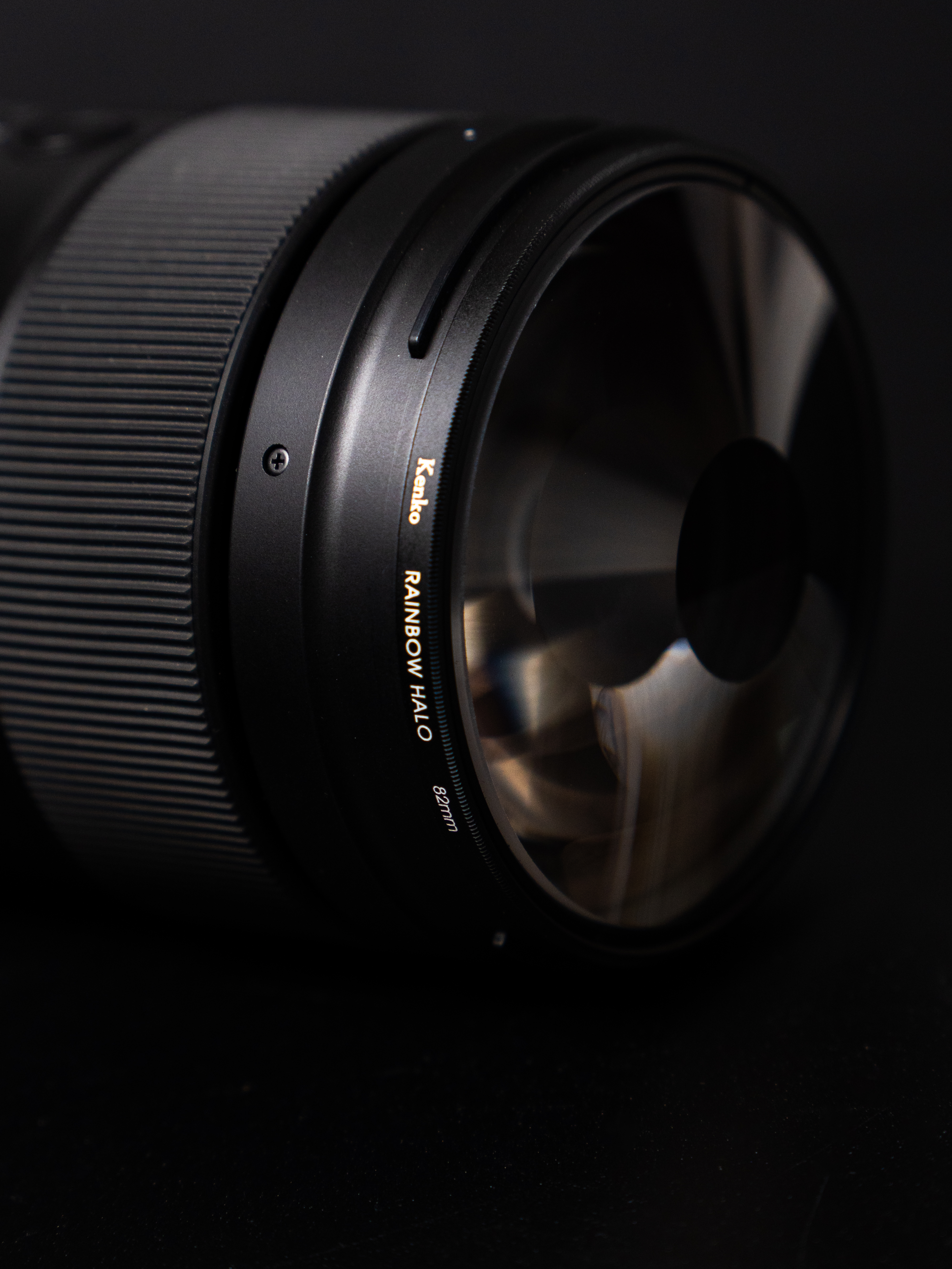 필터가 결합된 렌즈는 탐론 35-150mm F2-2.8 Di III VXD입니다. 측면에서 보면 확연히 솟아오른 것을 볼 수 있습니다. 스텝업 링으로 82mm 미만 구경의 렌즈에도 장착할 수 있지만 그만큼 주변부 헤일로 효과는 손해를 봅니다. 줌렌즈에서는 초점거리에 따라 표현에 차이가 있고요.