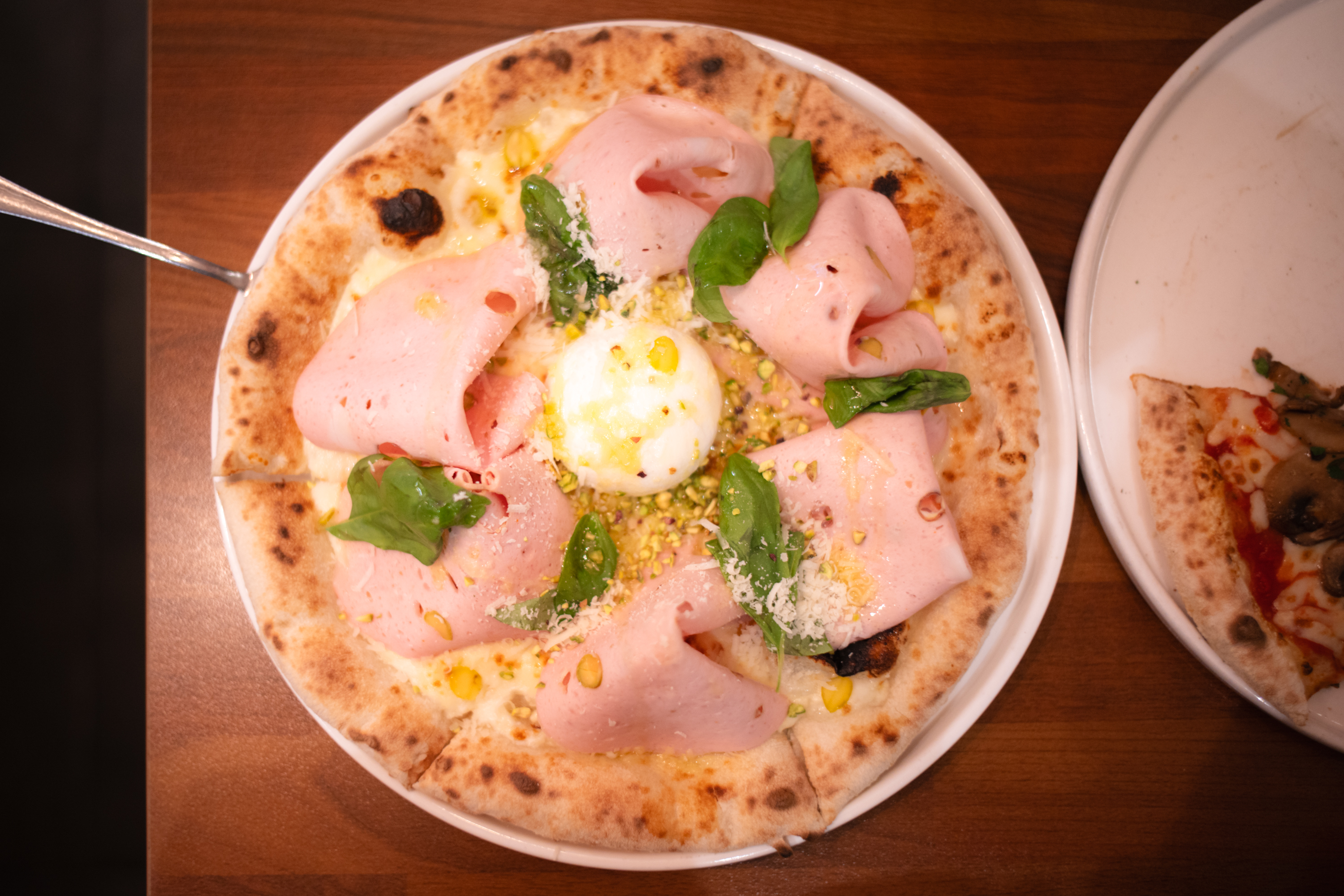 다음은 이날의 메인인 모르따렐라 부라따 피자. 가격은 25000원으로 다른 피자보다 비싼 편입니다. 가운데 올린 부라따 치즈 때문인 것 같아요. 이탈리아에서도 부라따 치즈를 넣은 피자는 다른 피자보다 비쌌습니다. 이 피자는 크림소스 베이스에 모짜렐라 치즈와 피스타치오, 바질을 올렸습니다. 도우와 피스타치오, 크림 소스의 시너지로 고소한 맛이 강한데 위에 올린 생햄과 부라따 치즈가 상큼하고 짭짤한 맛을 더합니다.