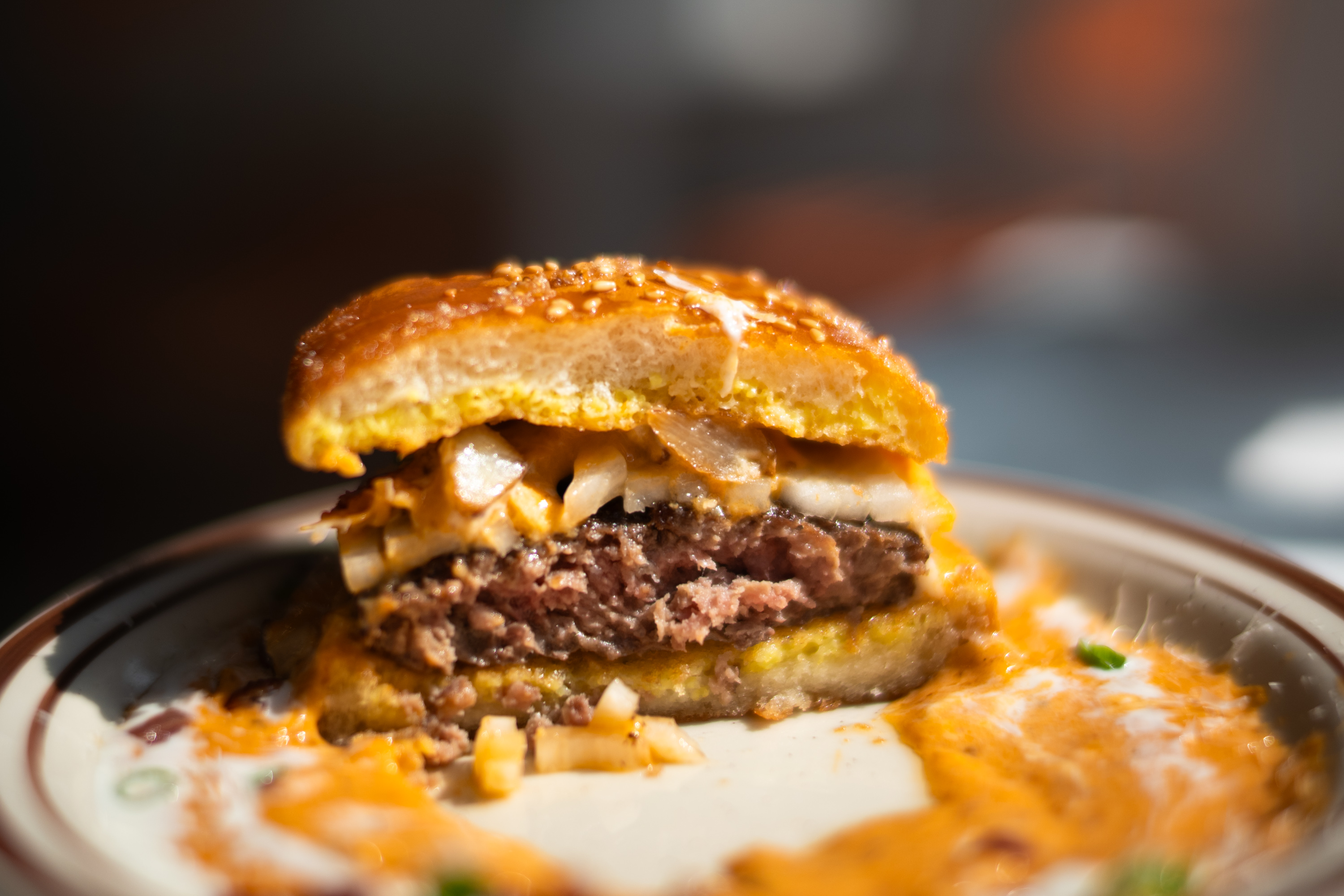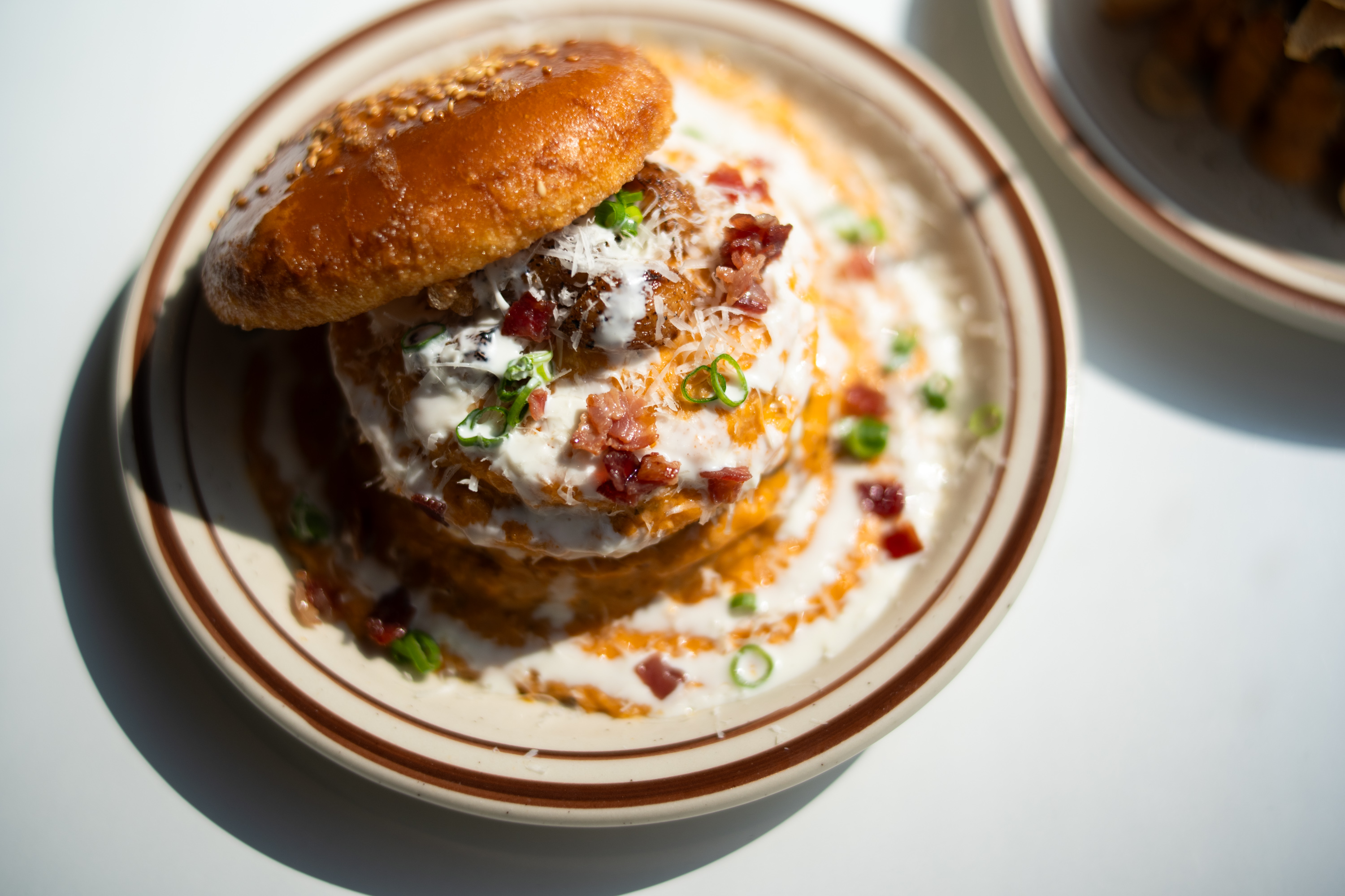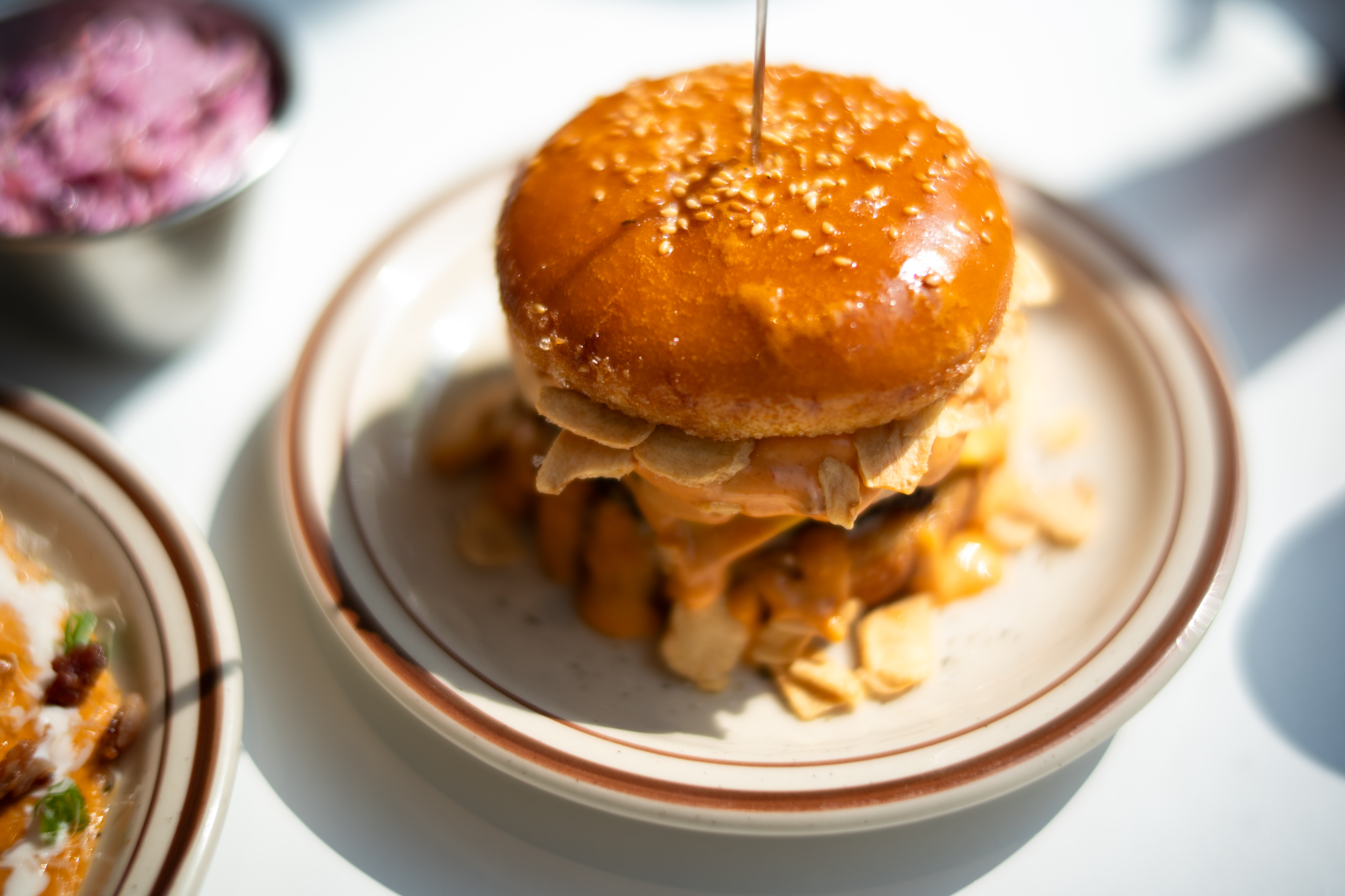 함께 주문한 로제 버거. 예상했던대로 로제 파스타를 연상 시키는 구성입니다. 버거 주변에 로제 소스를 흥건하게 채워 놓았어요. 손으로 먹기는 어려운 버거고 칼로 잘라서 로제 소스를 얹어 먹는 게 좋습니다. 로제 소스의 양은 모두가 아는 그 맛이고 버거에 베이컨 칩이 있는 것이 재미있습니다. 파스타 소스에 빵과 고기를 넣어 먹는 느낌인데 그게 그리 나쁘지 않았습니다.