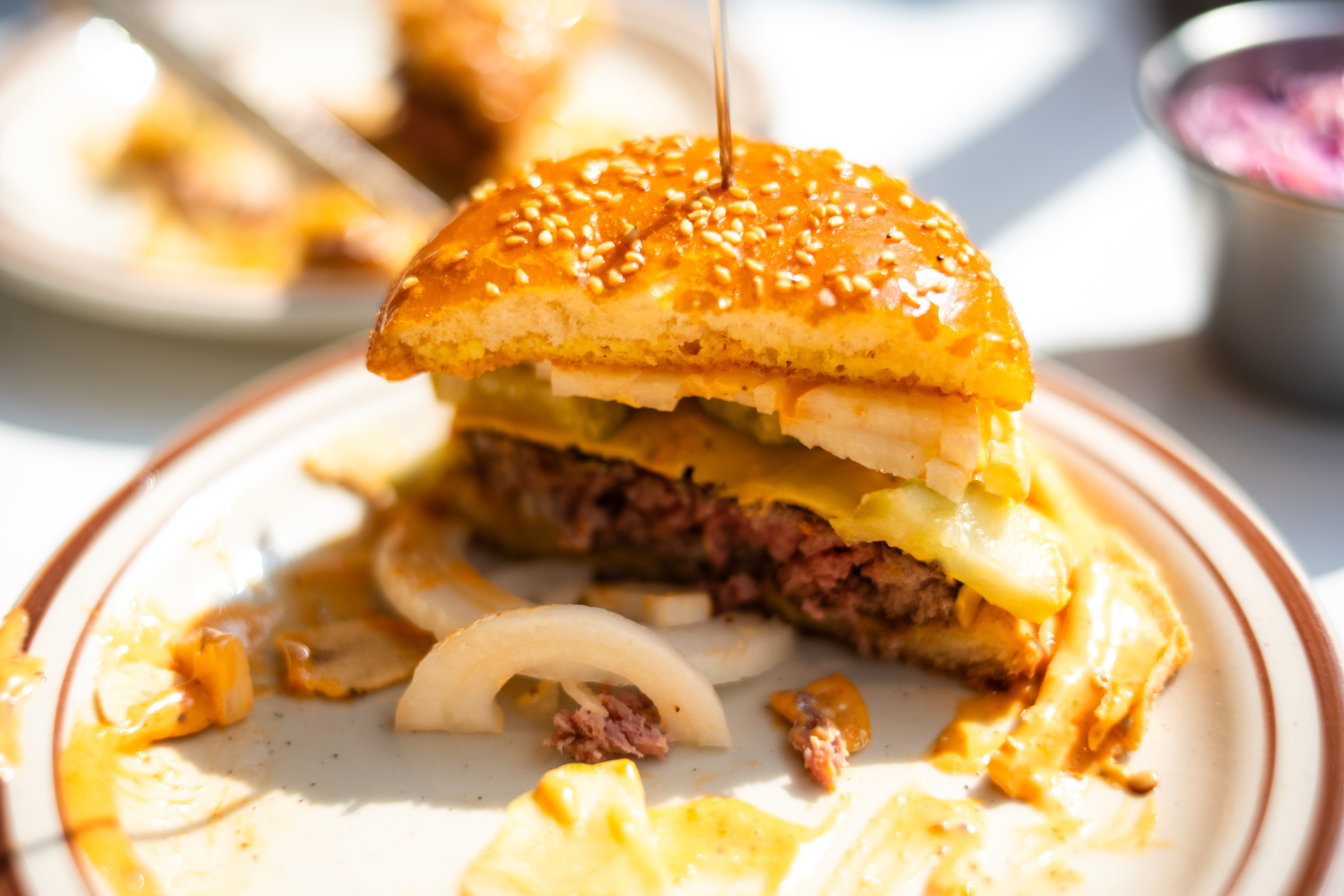 함께 주문한 로제 버거. 예상했던대로 로제 파스타를 연상 시키는 구성입니다. 버거 주변에 로제 소스를 흥건하게 채워 놓았어요. 손으로 먹기는 어려운 버거고 칼로 잘라서 로제 소스를 얹어 먹는 게 좋습니다. 로제 소스의 양은 모두가 아는 그 맛이고 버거에 베이컨 칩이 있는 것이 재미있습니다. 파스타 소스에 빵과 고기를 넣어 먹는 느낌인데 그게 그리 나쁘지 않았습니다.
