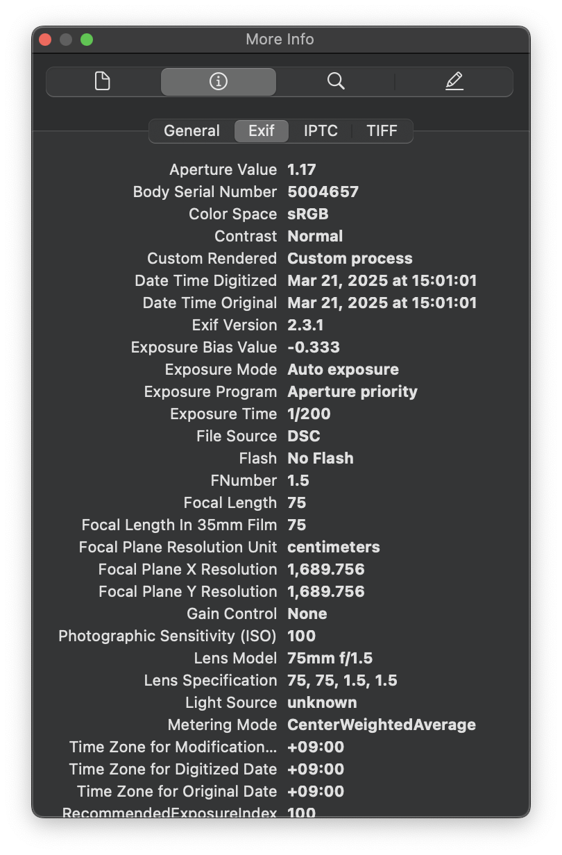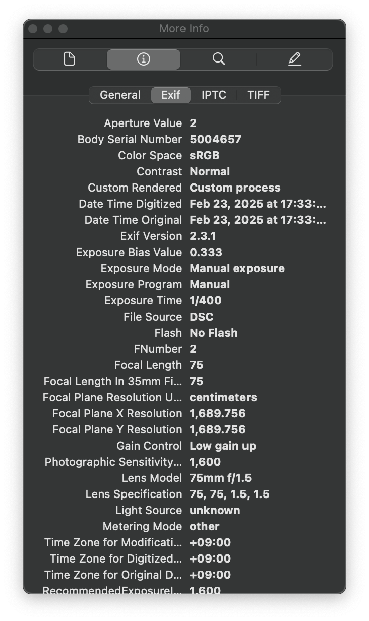 기존에도 렌즈 어댑터를 통해 VM 렌즈들을 니콘 Z 마운트 카메라에 사용했지만 전용으로 출시된 렌즈들의 장점이 있습니다. 촬영 정보가 이미지에 기록된다는 것, 피킹 등 MF 어시스트 기능이 완벽하게 연동된다는 것이 대표적입니다. Exif 정보에 표기된 초점거리와 조리개 값, 렌즈의 제품명은 촬영 데이터 관리에 유용합니다. 특히 여러 렌즈를 사용할 때 구분할 수 있어 좋아요.