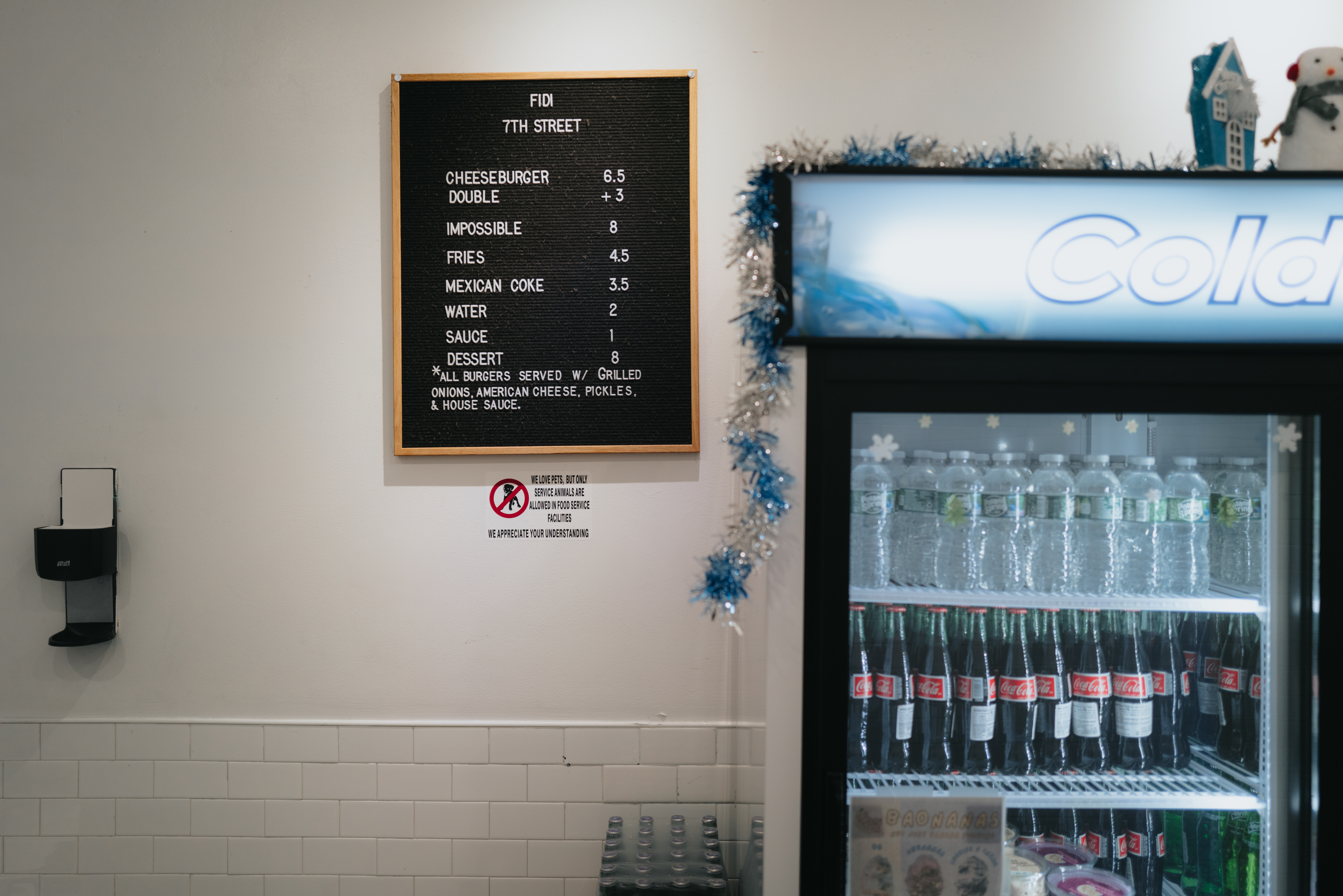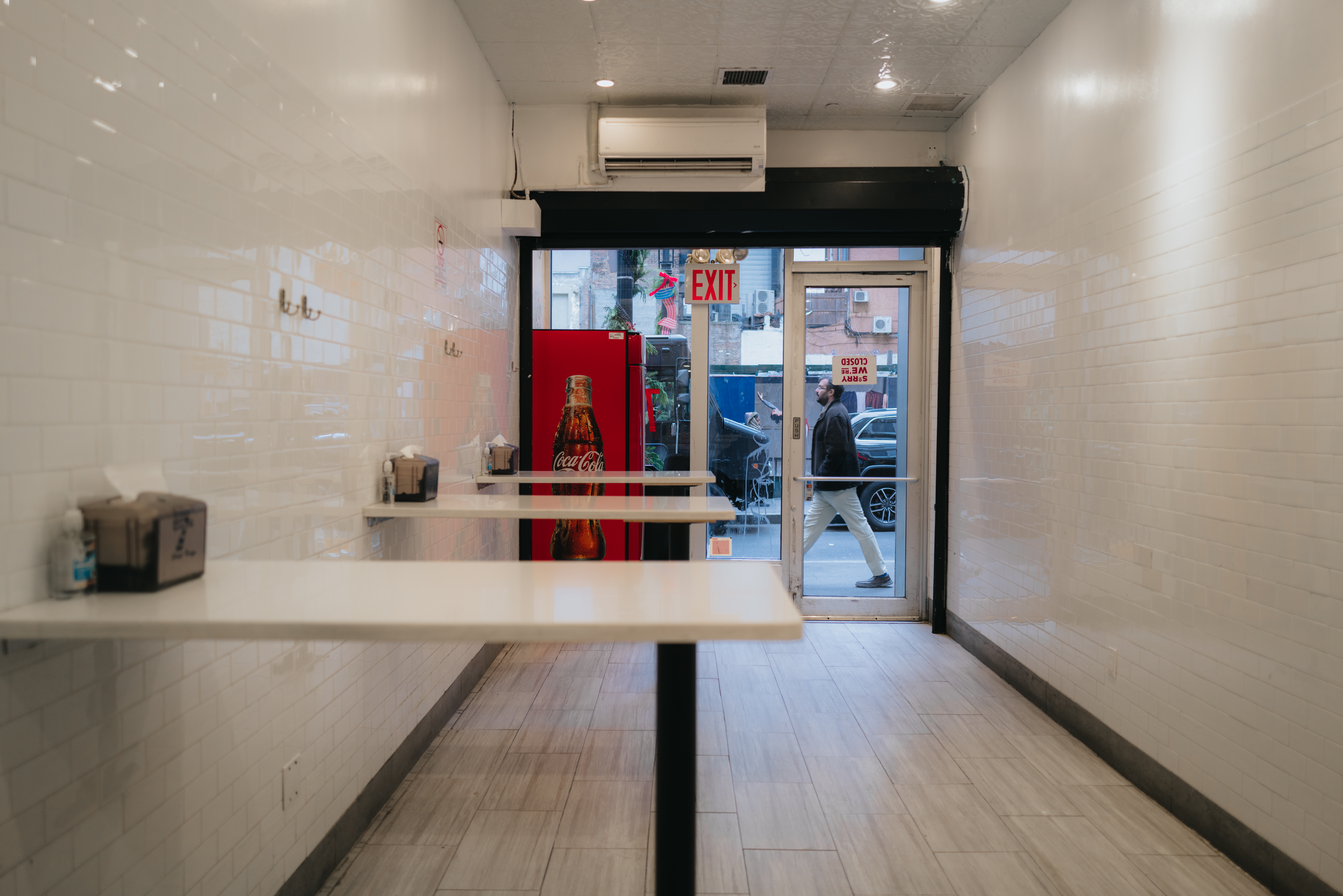 월 스트리트에 있는 Financial District 점과 Downtown Brooklyn 점 두 곳을 방문했습니다. 그 외에도 소호, 타임스퀘어, 윌리엄스버그 등 번화가마다 매장이 있으니 접근성이 무척 좋습니다. 가격이 저렴하니 부담 없이 간식으로 하나 맛보기에도 좋아요. 매장들은 공통적으로 작고 변변한 테이블 없이 창가에 좁은 좌석을 뒀거나 아예 의자 없이 서서 먹도록 했습니다. 주문과 픽업은 카운터에 가서, 음료도 냉장고에서 가져다 먹으면 됩니다. 저렴한 가격을 유지하기 위한 위한 시설과 서비스입니다. 처음으로 방문한 Financial District 점은 의자 하나 없이 스탠딩 테이블 세 개가 전부였어요.