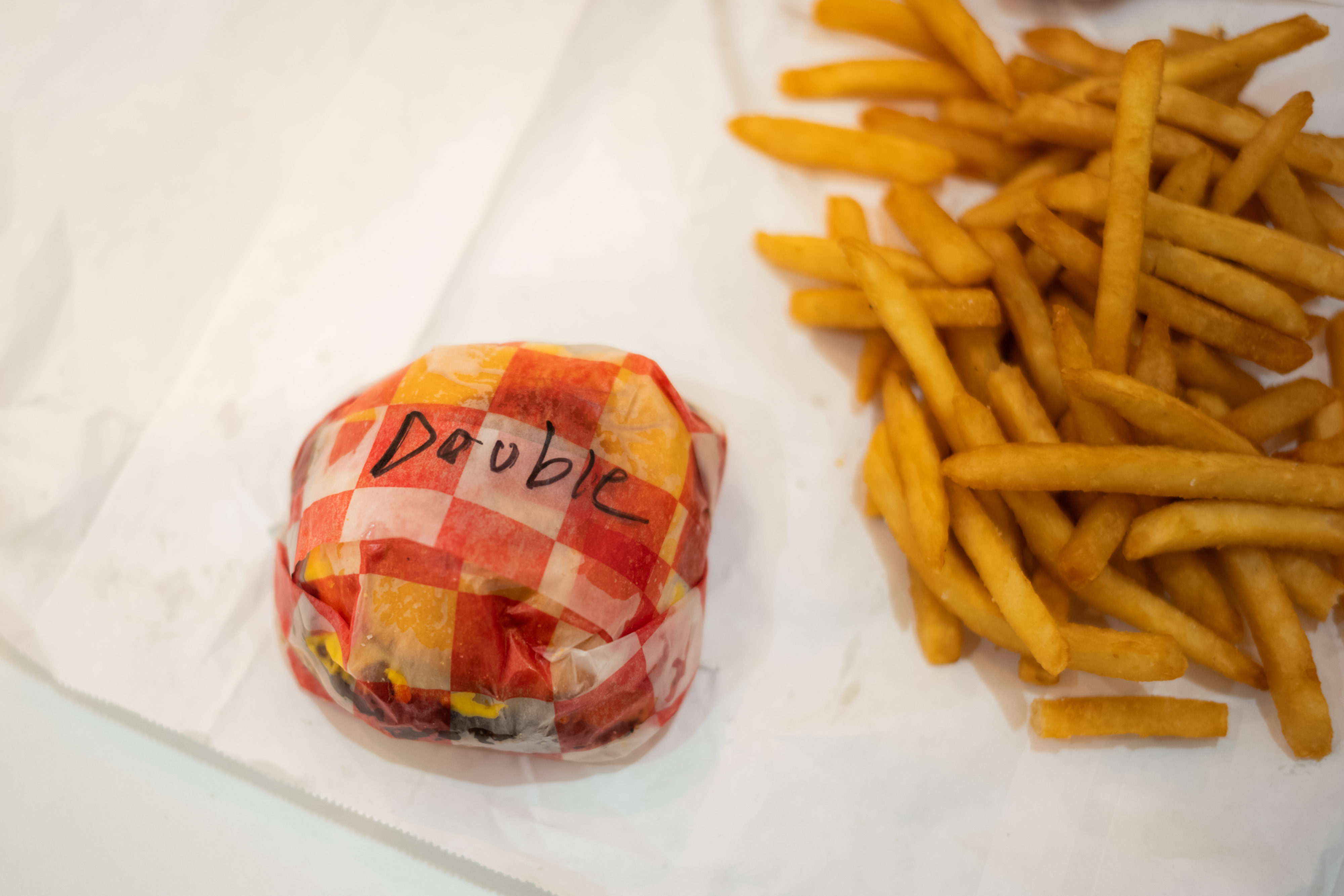 초록색 체크 무늬 종이로 싼 버거와 감자 튀김 그리고 휴지 두세 장이 들어 있습니다. 따로 쟁반이나 접시를 주지 않는 식당이라 이대로 테이블에 가져가서 먹으면 됩니다. 스탠딩 테이블에 서서 허겁지겁 포장지를 뜯고 뉴욕 여행 첫 버거의 자태를 감상했습니다.