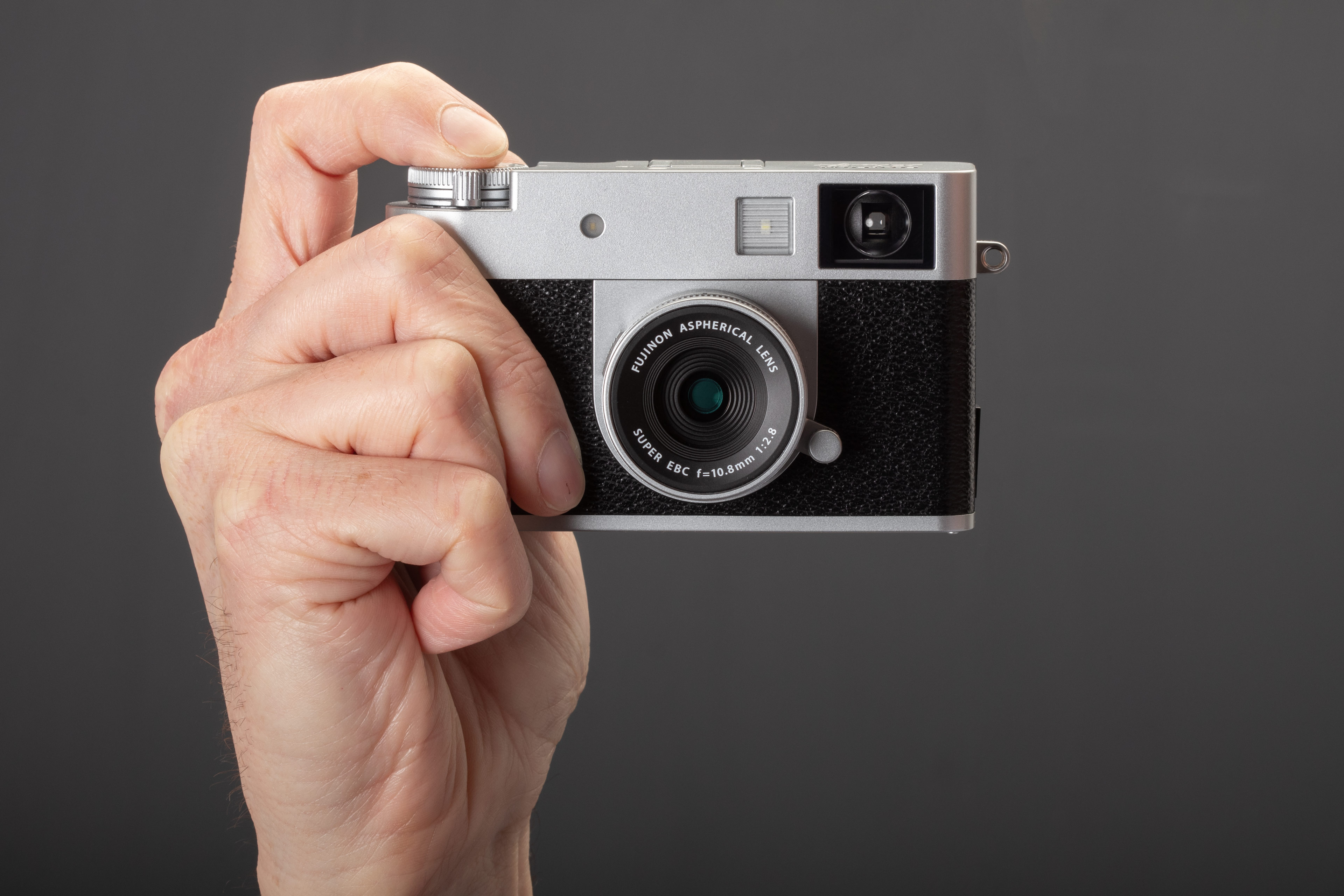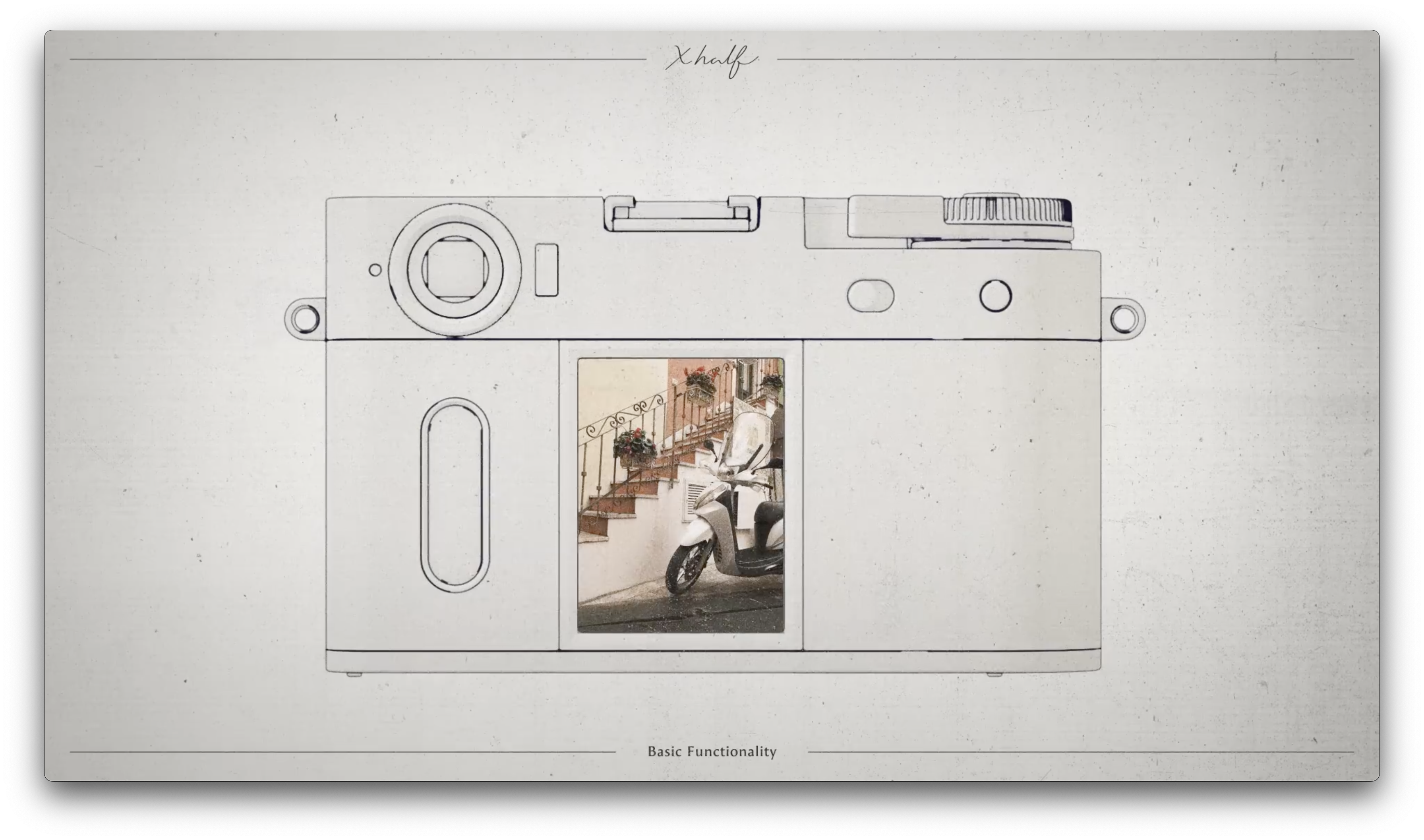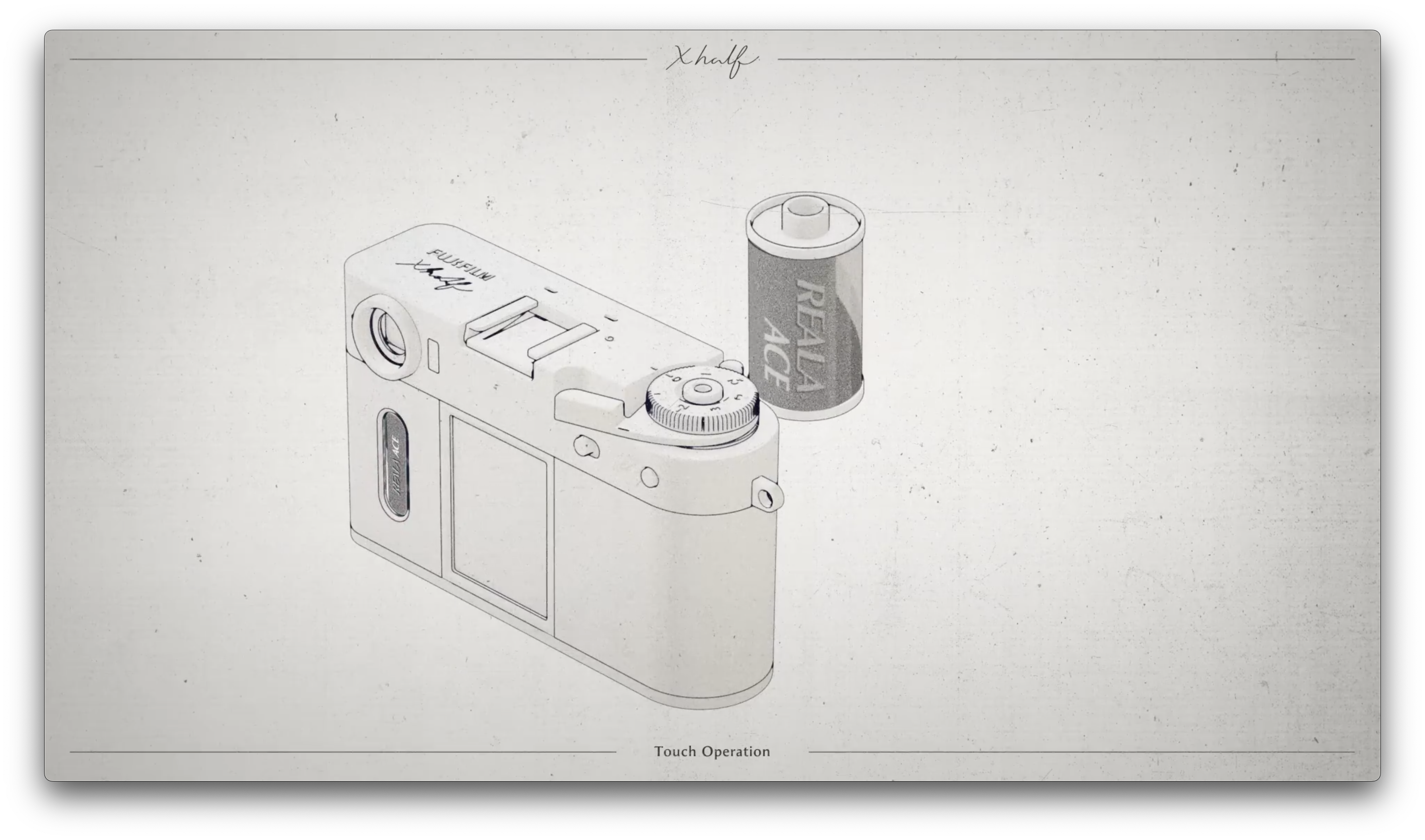 디자인은 X 시리즈 그 중에서도 X100 시리즈의 요소들을 많이 가져왔습니다. 사각형 실루엣에 광학 뷰파인더를 배치했고, 35mm 환산 약 32mm의 렌즈를 탑재했어요. 좌/우를 곡선으로 다듬어 앙증맞은 느낌을 강조했는데 이는 X-T50의 디자인을 떠올리게 합니다. 클래식 디자인의 X 컴팩트 카메라라는 점에서 예전에 출시했던 X10 시리즈와도 공통점이 있습니다만 둘의 컨셉은 크게 다릅니다. X10 시리즈는 작은 포맷이지만 엄연히 프로, 하이 아마추어까지 고려한 하이엔드 시리즈였다면 X 하프는 재미를 최우선으로 한 장난감입니다.