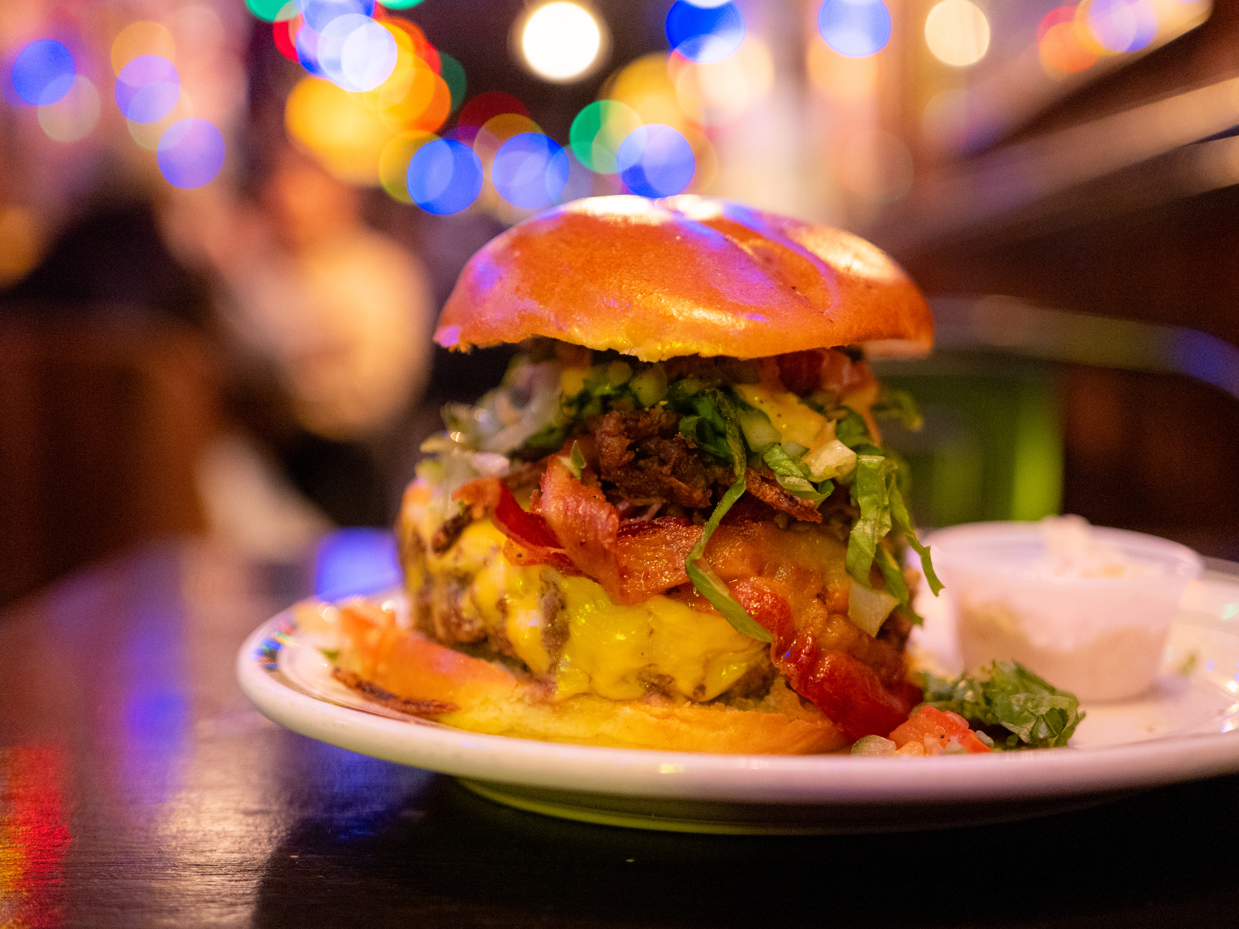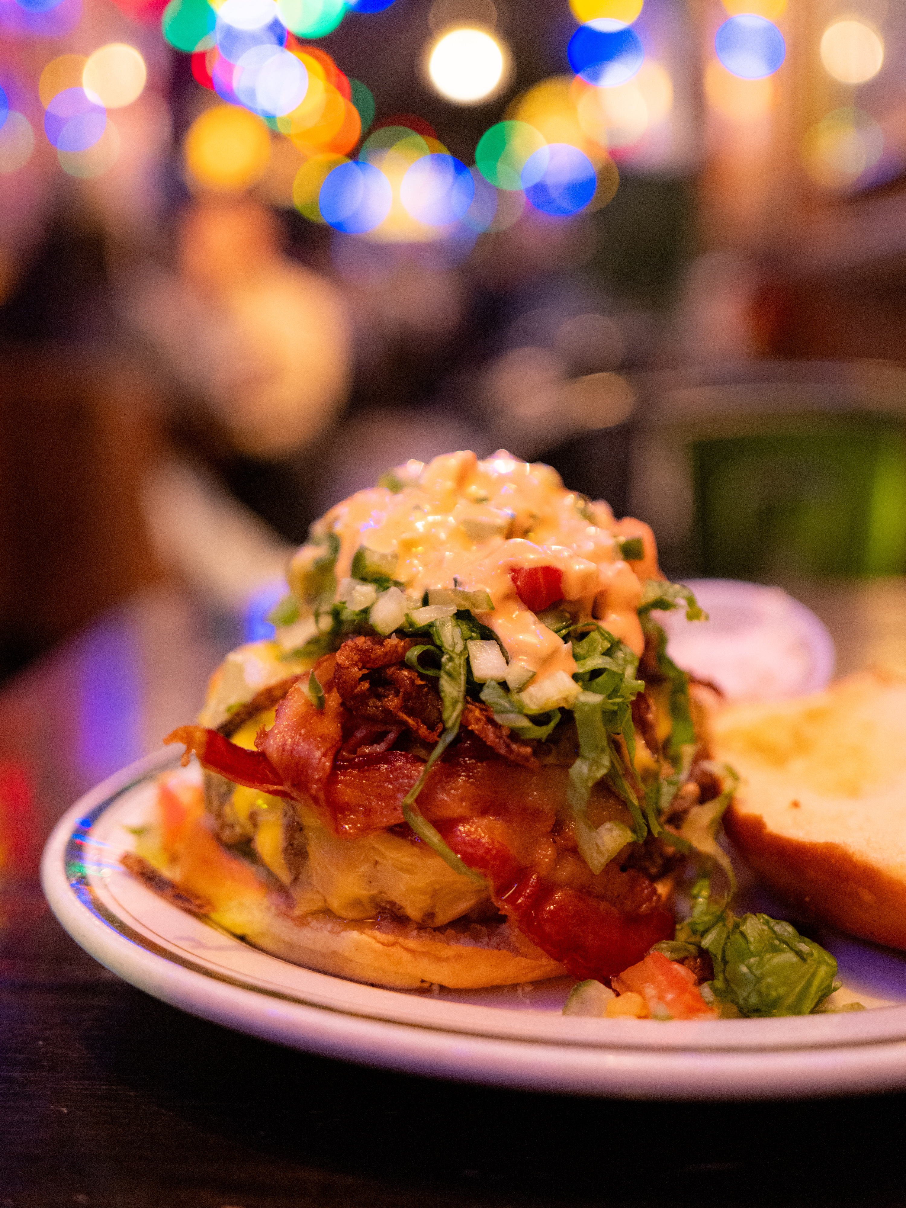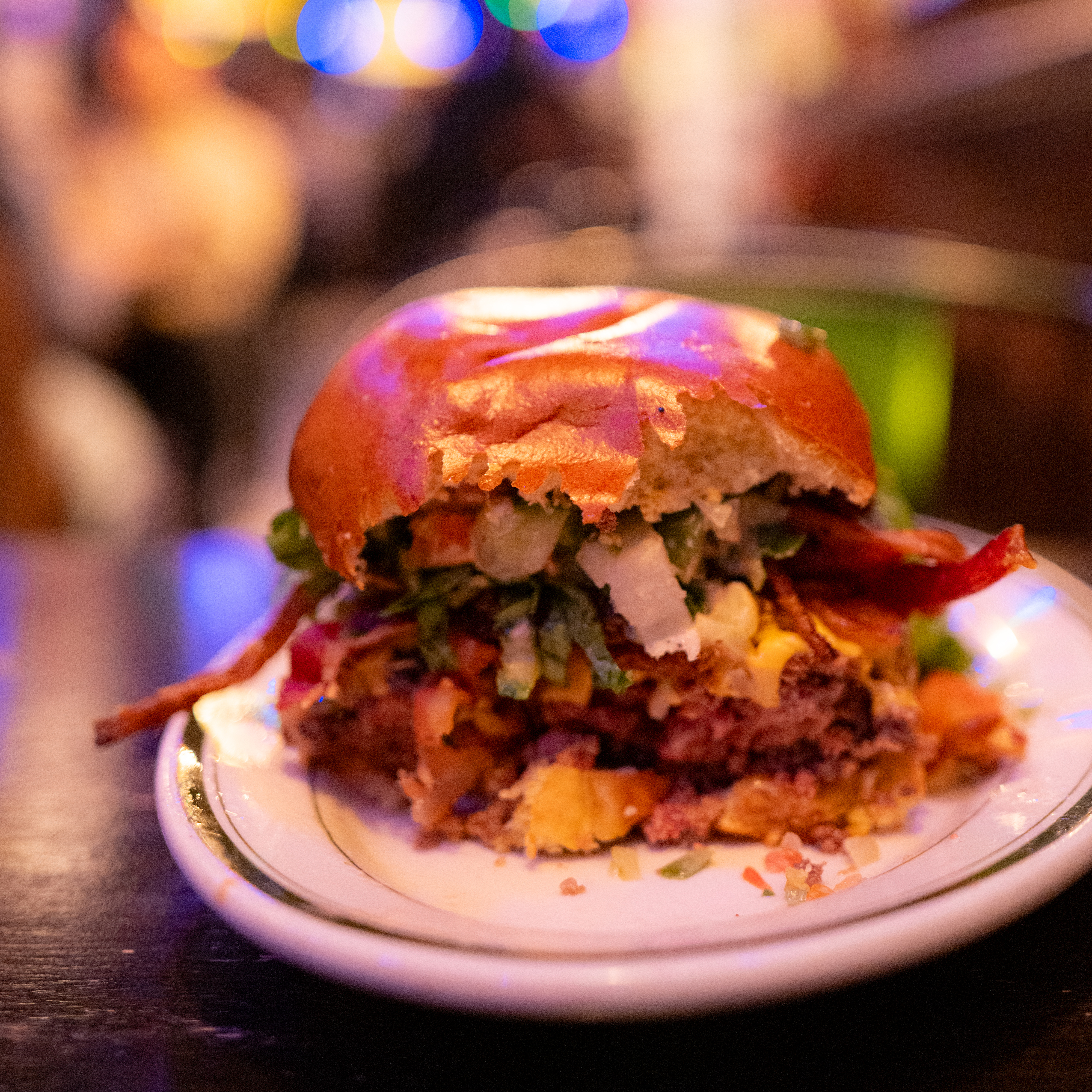 구성은 7온스 하우스 에이징 패티를 중심으로 아메리칸 치즈, 베이컨, 튀기듯 볶은 어니언, 피클, 상추와 토마토입니다. 전형적이지만 디테일에 차이가 있어요. 흔히 쓰는 생양파나 갈색으로 볶은 양파가 아닌 튀김처럼 바삭하게 구운 양파를 올린 것, 채소를 잘게 썰어 올린 것을 꼽을 수 있습니다. 빵은 평범한 화이트 번을 사용했습니다.