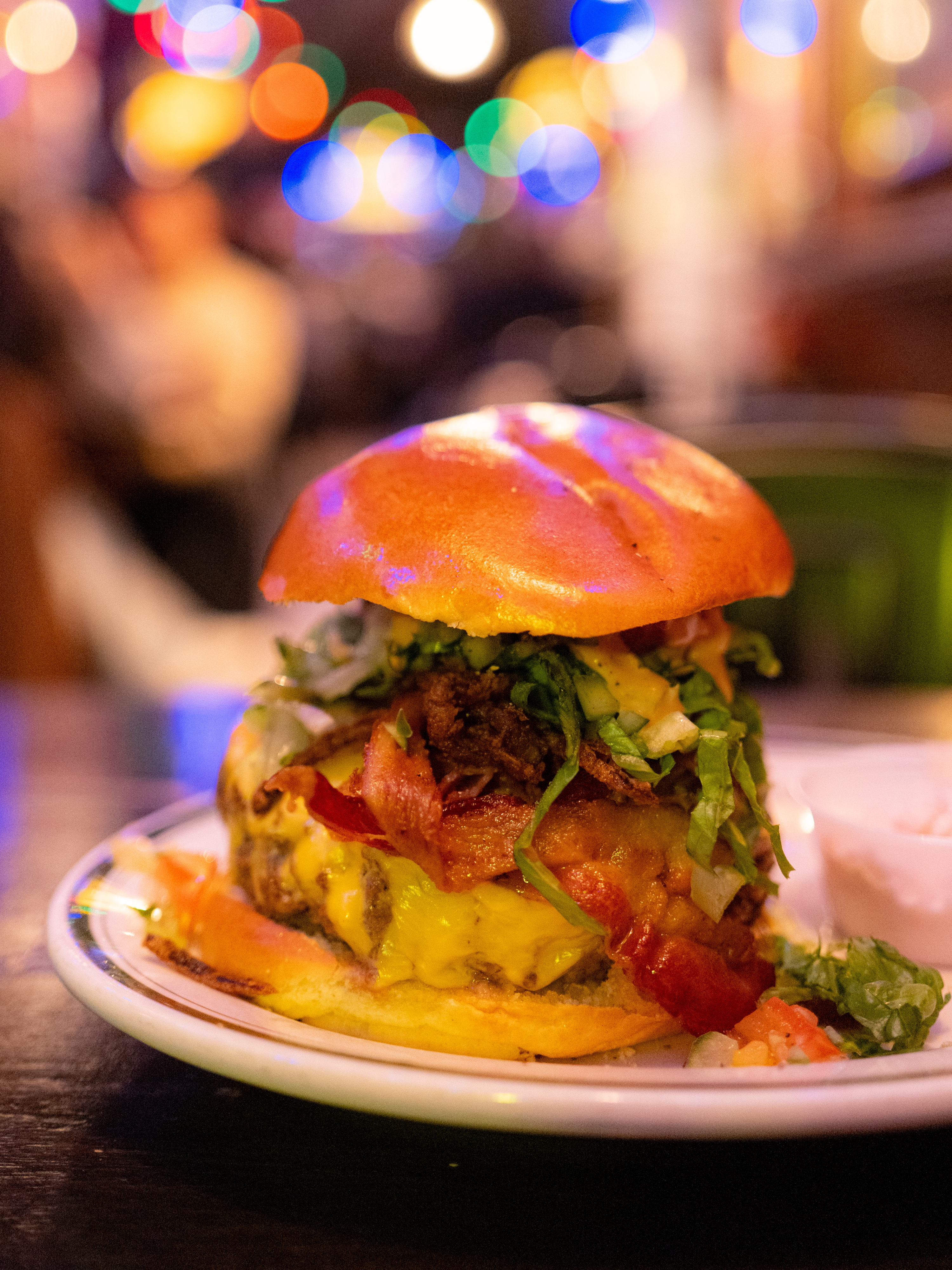 구성은 7온스 하우스 에이징 패티를 중심으로 아메리칸 치즈, 베이컨, 튀기듯 볶은 어니언, 피클, 상추와 토마토입니다. 전형적이지만 디테일에 차이가 있어요. 흔히 쓰는 생양파나 갈색으로 볶은 양파가 아닌 튀김처럼 바삭하게 구운 양파를 올린 것, 채소를 잘게 썰어 올린 것을 꼽을 수 있습니다. 빵은 평범한 화이트 번을 사용했습니다.