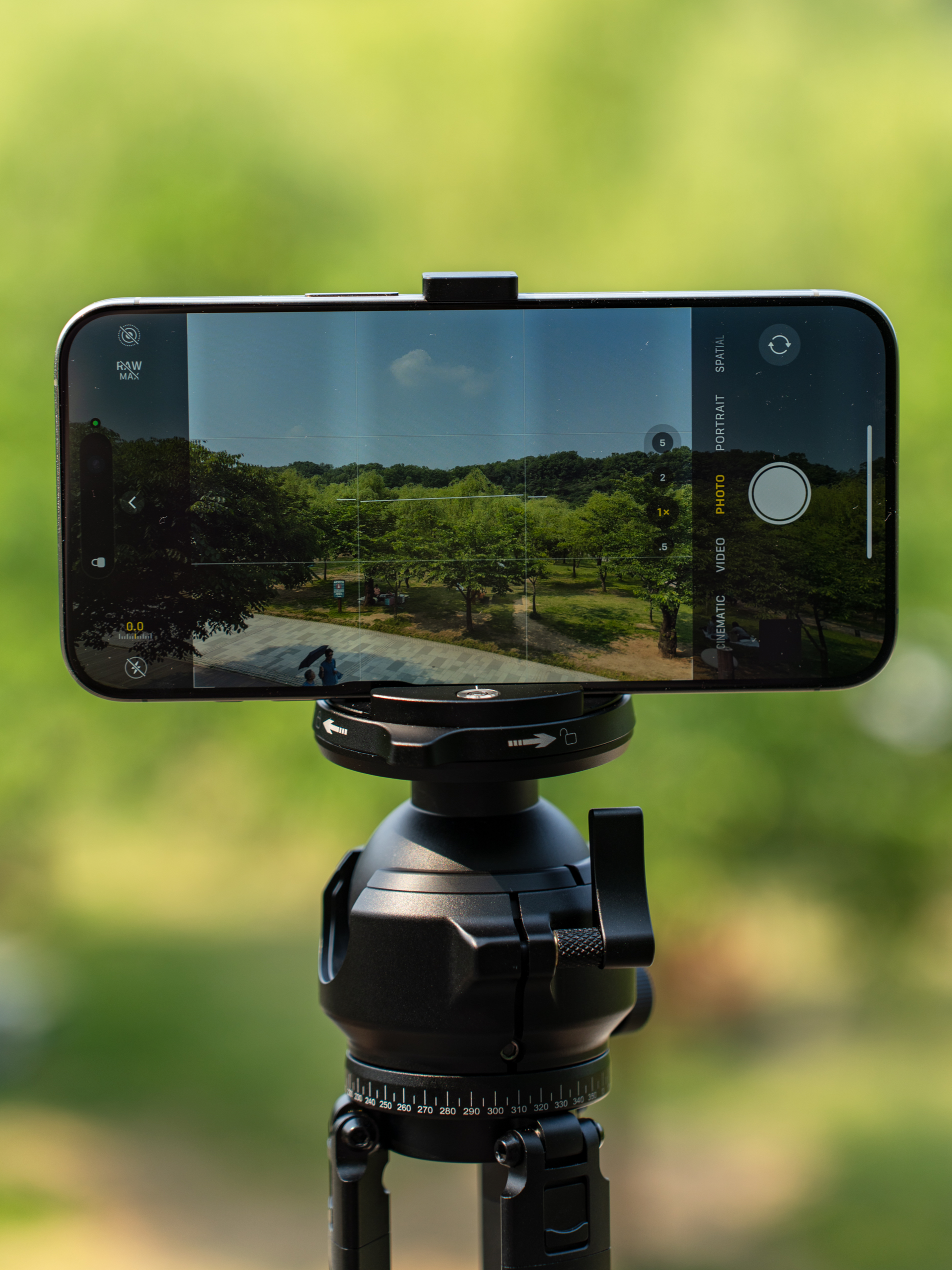 플레이트 결합부에는 마트폰을 마운트 할 수 있는 클램프가 숨어 있습니다. 전용 클램프보다야 여러모로 빈약하지만 급할 때 유용해요. 볼헤드를 세로 방향으로 돌리면 세로 촬영도 할 수 있습니다.
