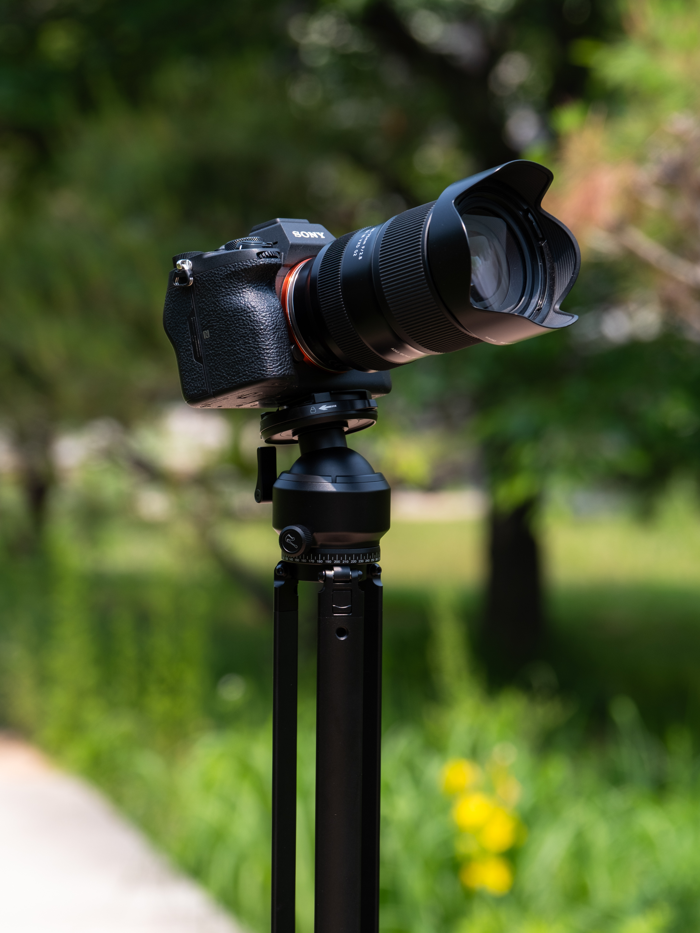 미니 삼각대 역할을 겸하는 센터 컬럼과 메인 삼각대를 통해 높이를 조절할 수 있습니다. 세 갈래로 나뉜 W28S의 센터 컬럼은 전체 지름이 길어서 원기둥 형태의 센터 컬럼보다 보기에 더 단단하게 보여요. 센터 컬럼을 분리하고 볼헤드를 메인 삼각대에 장착하면 삼각대를 22.5cm까지 낮춰서 고정할 수 있습니다. 로우 앵글 사진, 영상 촬영에 주로 사용되는데 개인적으로는 아래 사진처럼 센터 컬럼을 거꾸로 장착하는 방식을 선호합니다. 볼헤드를 분리하는 수고가 없고 카메라를 더 낮게 위치시킬 수 있어서요.