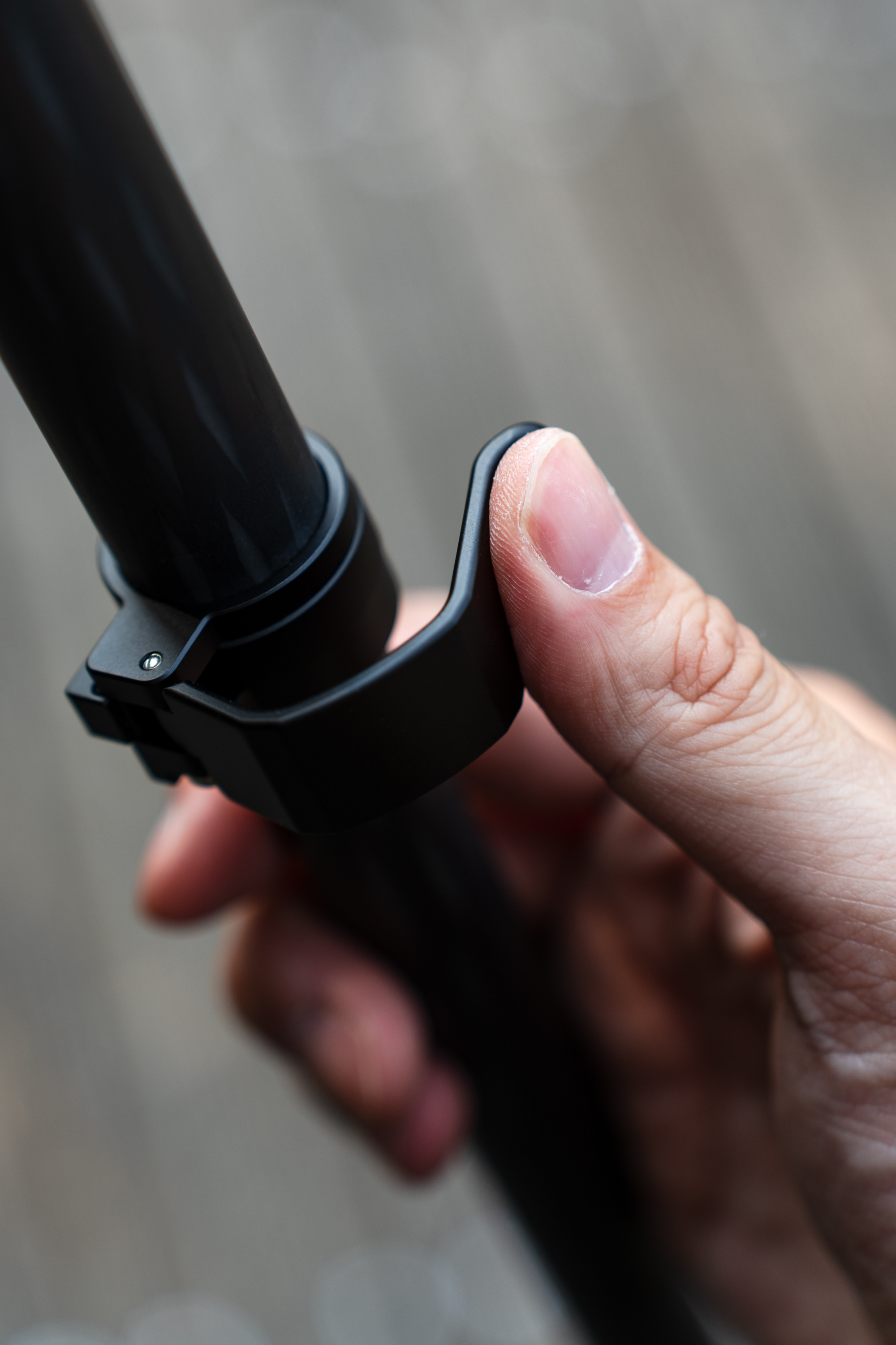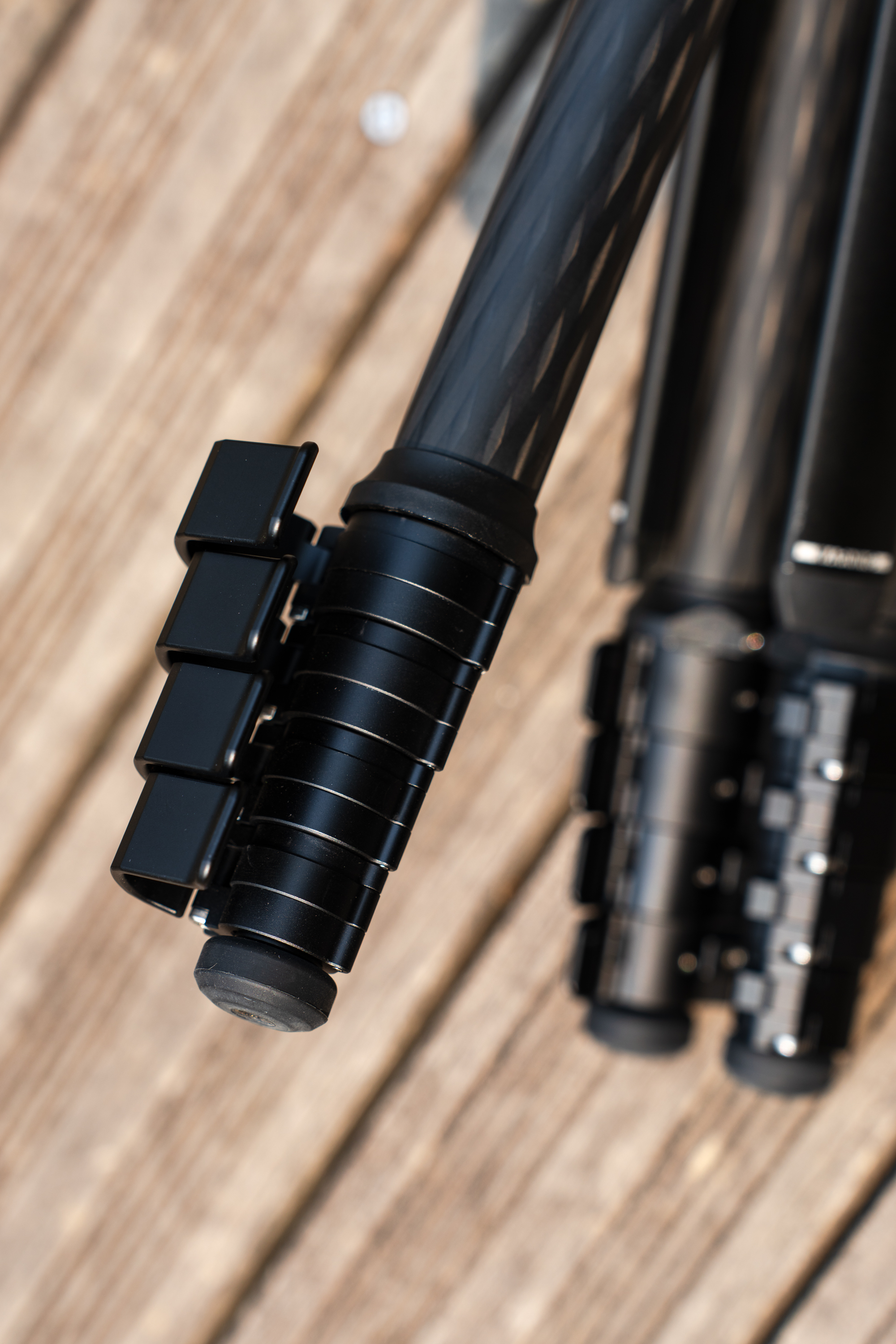 삼각대 높이를 조절하는 레버 역시 디자인이 변경됐습니다. 돌출 없이 매끈한 W28의 레버는 보기엔 좋지만 레버를 분리할 때 힘이 많이 들어갔어요. W28S의 레버는 끝부분이 바깥을 향하는 모양으로 손으로 밀어 레버를 열기 수월해졌습니다. 닫을 때도 움푹 파인 곳을 누르면 크게 힘 들이지 않고 조작이 가능합니다. 삼각대의 높이를 변경할 때 최대 열 두 개의 레버를 열고 닫는 것을 고려하면 반가운 변화입니다.