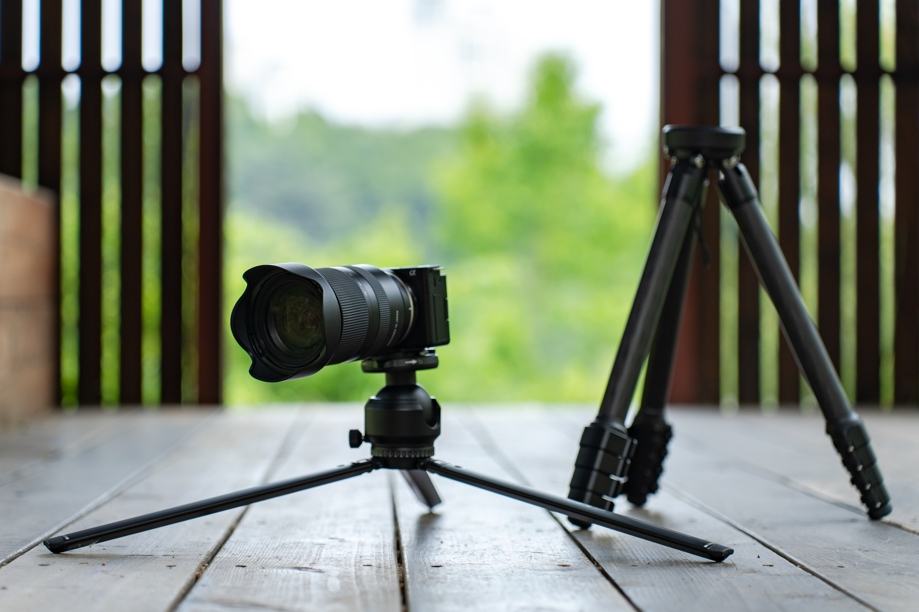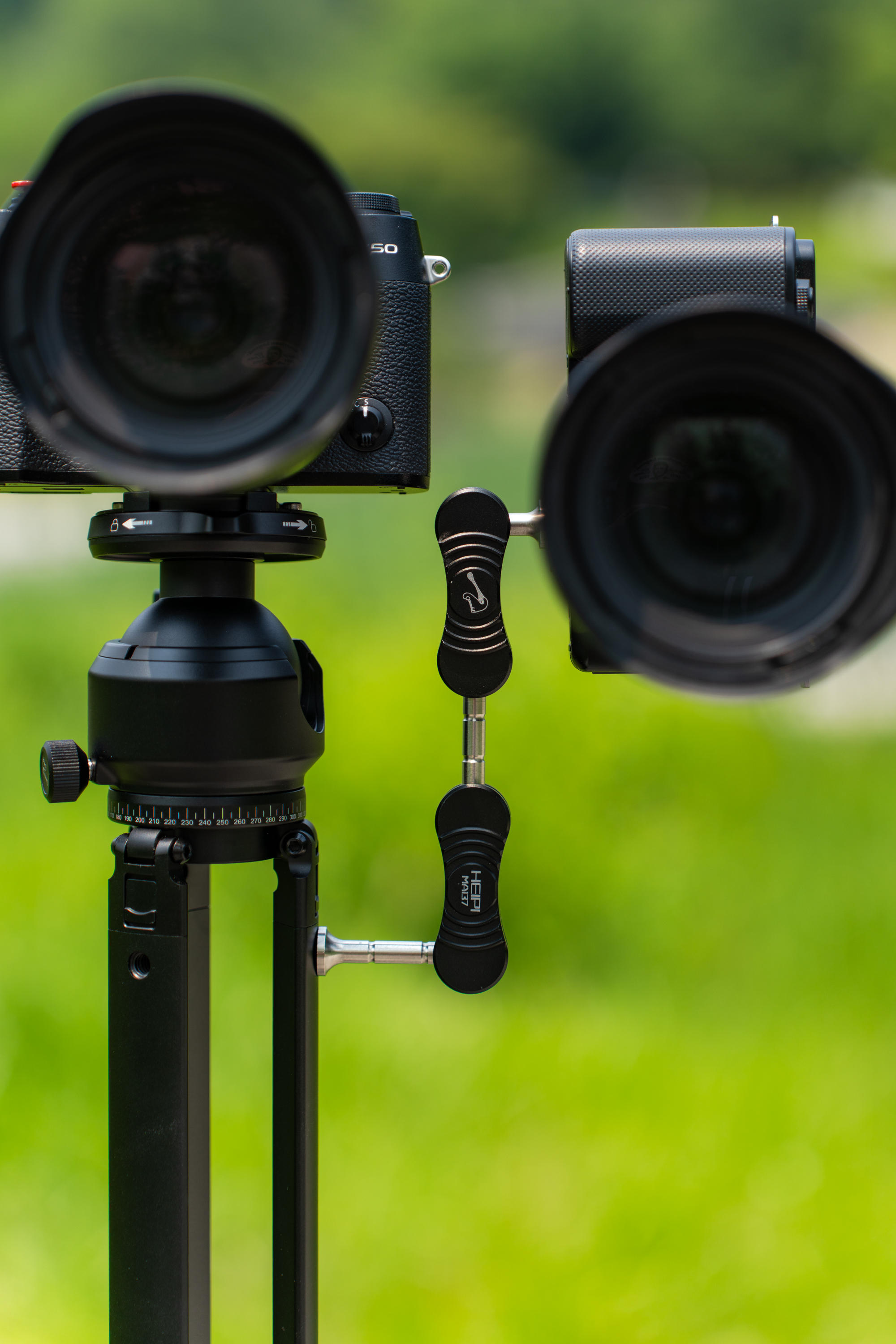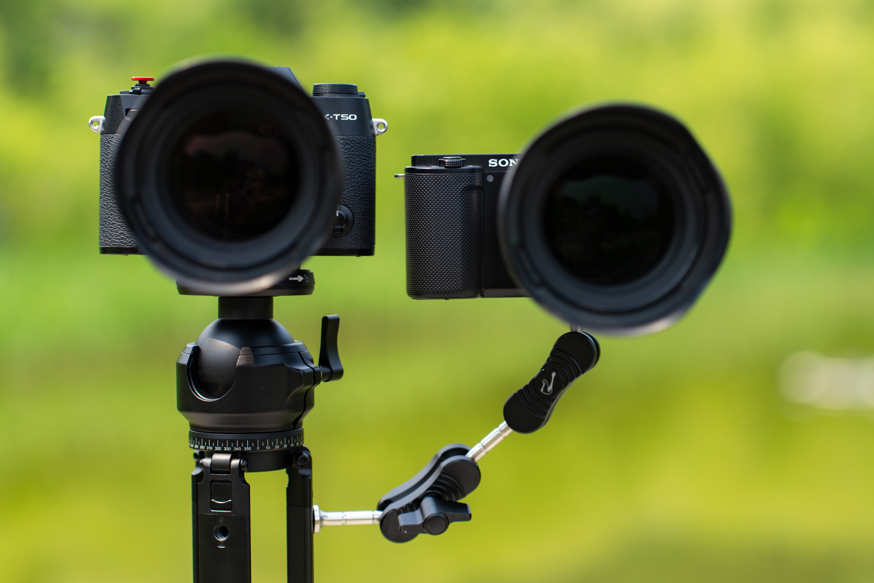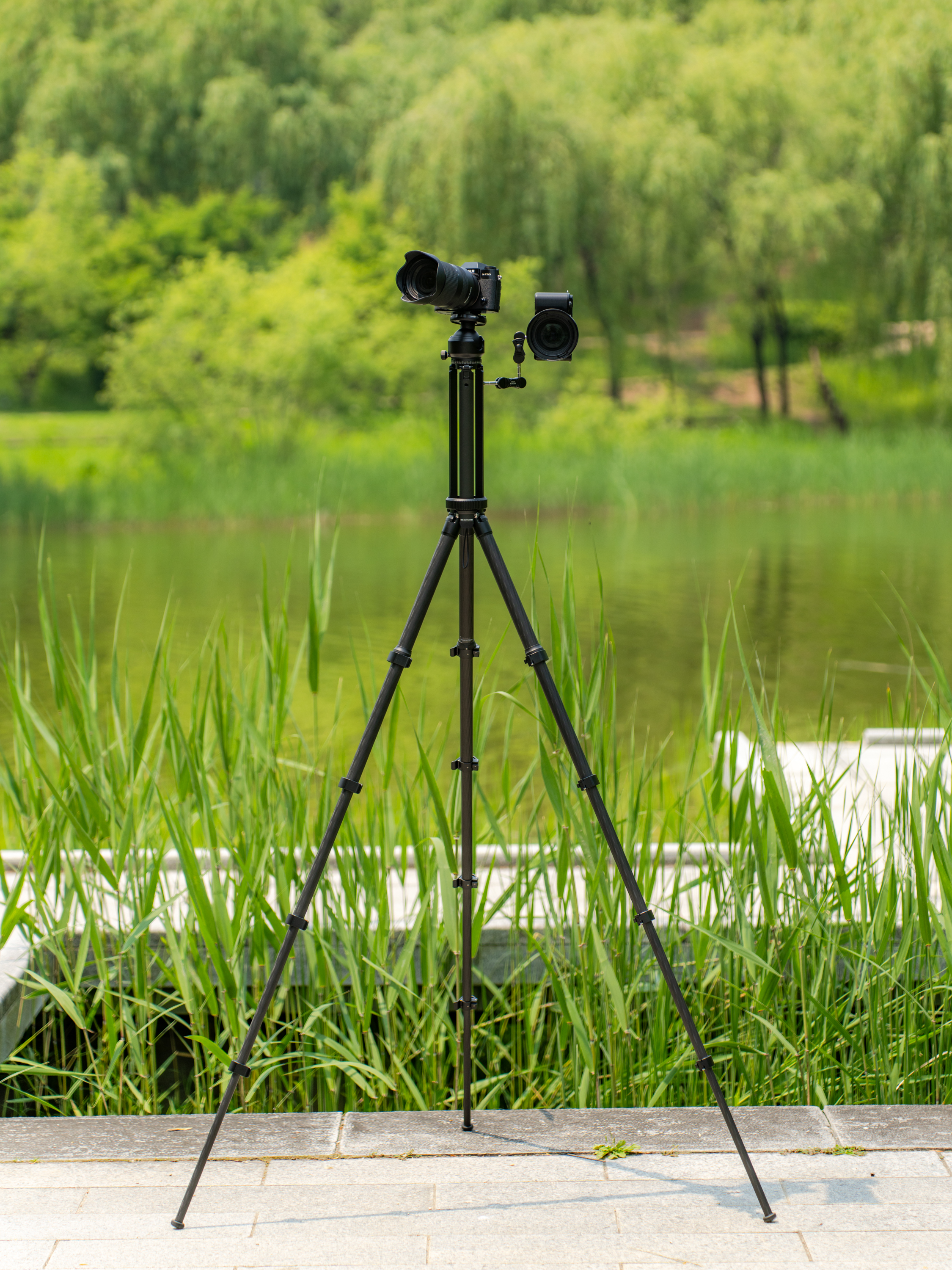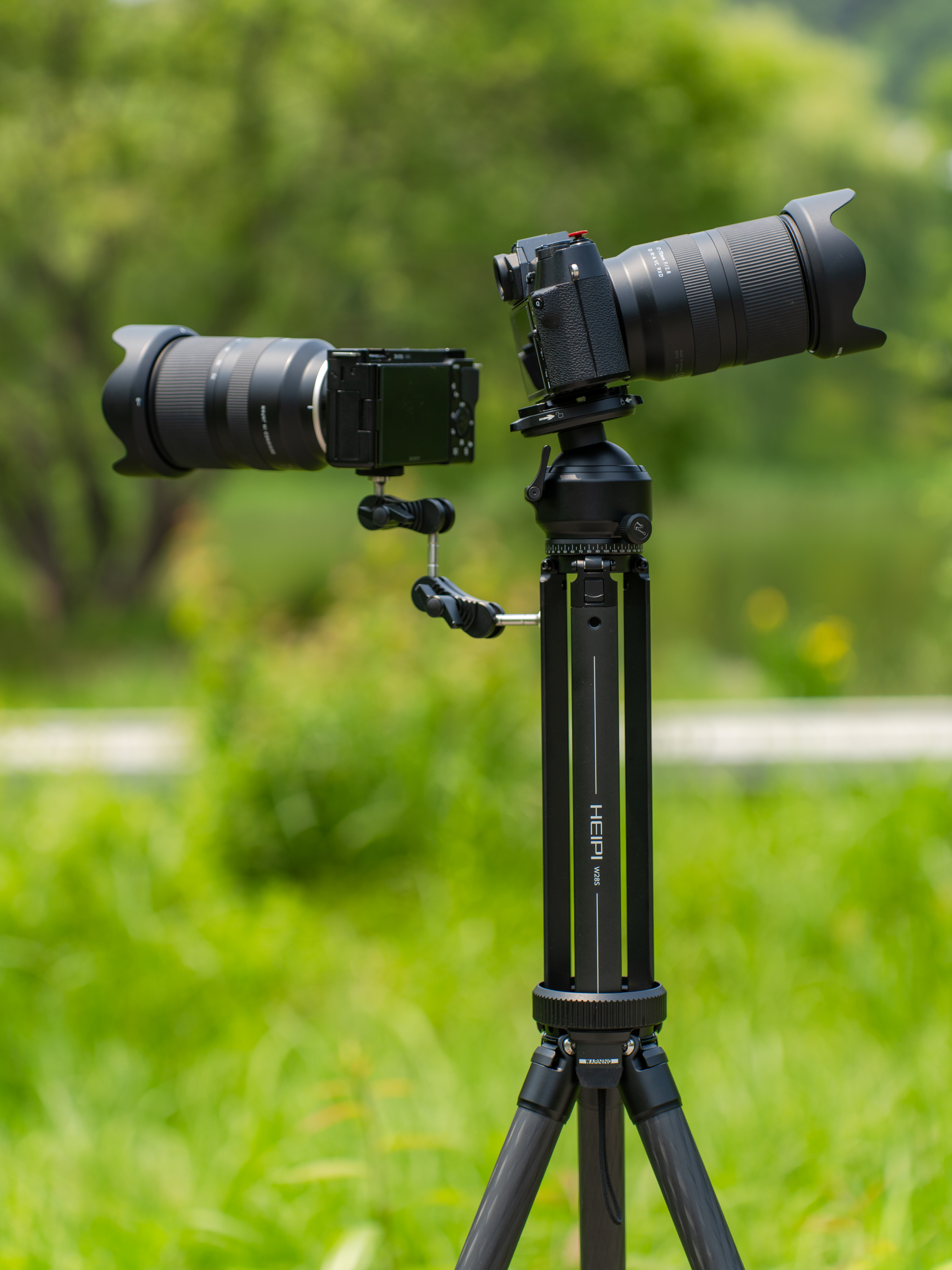 메인 삼각대의 안전 지지 하중은 20kg입니다. 플래그쉽 DSLR/미러리스 카메라에 대구경 망원 렌즈와 스트로보 등을 마운트 해도 여유가 있어요. 소규모 팀 단위의 영상 촬영 장비도 충분히 지탱할 수 있는 성능입니다. 다만 볼헤드와 센터 컬럼의 안전 지지하중이 5kg이라 이를 함께 고려해야 합니다. 제가 사용하고 있는 카메라들은 휴대성 위주라 운용에 전혀 문제가 없었어요. 매직암을 연결해 두 개의 카메라를 올려도 합계가 5kg이 되지 않으니 여행용 삼각대로는 넘치는 성능입니다.