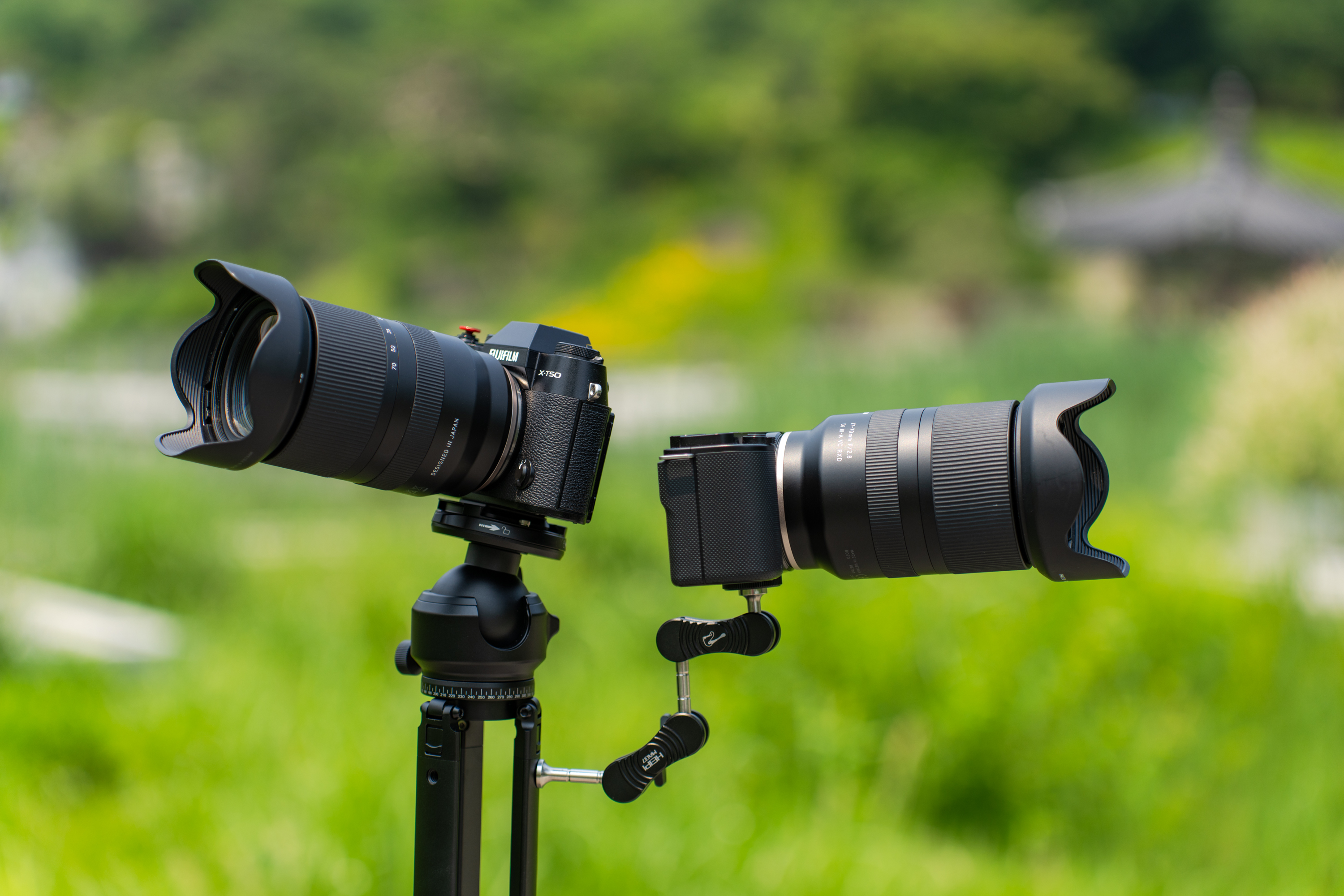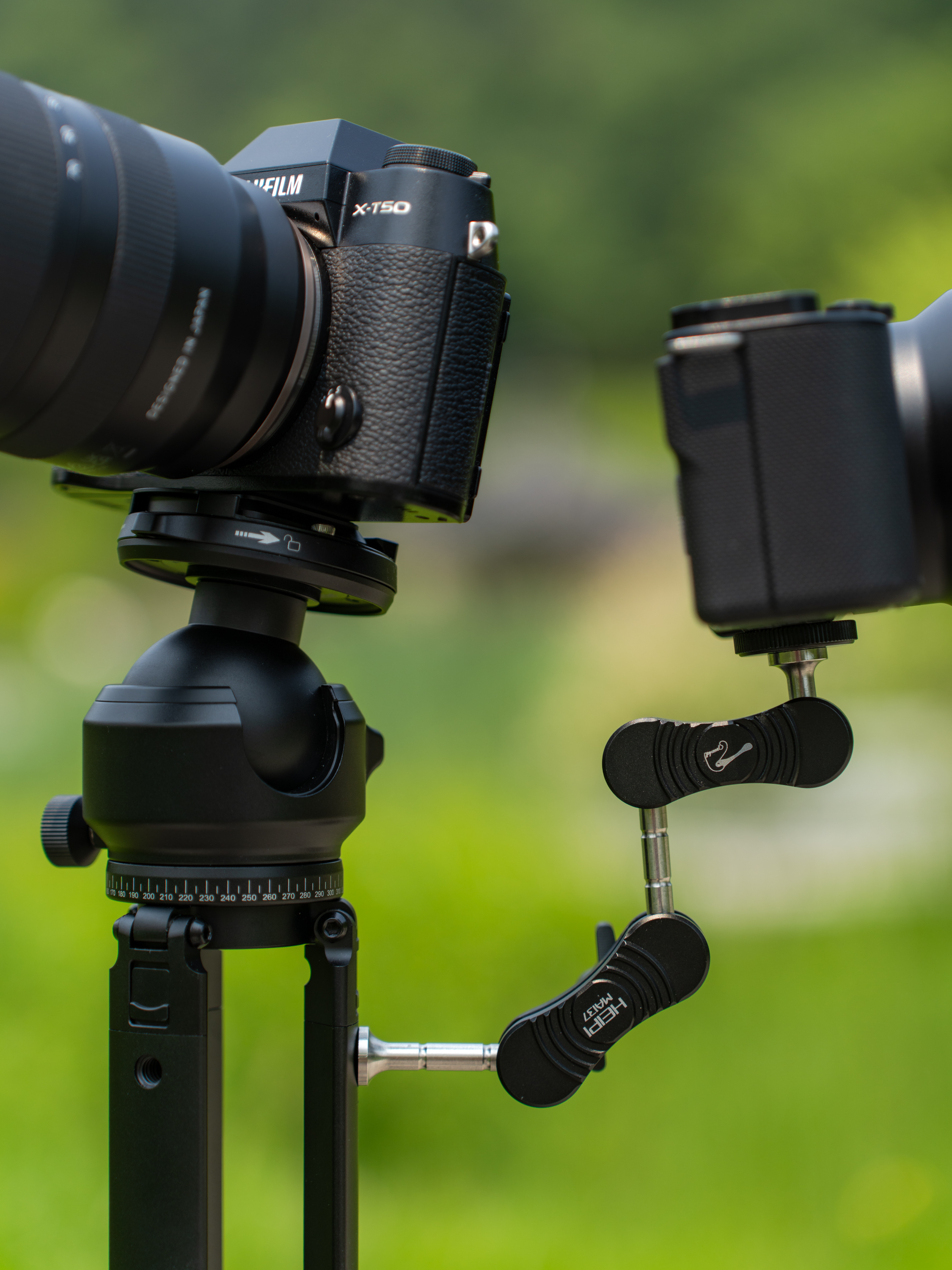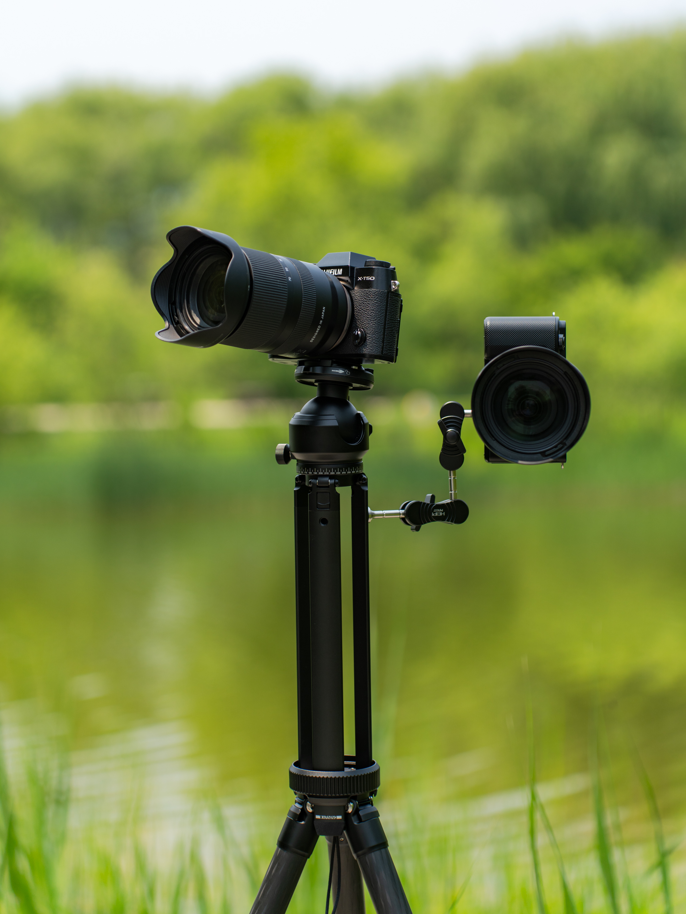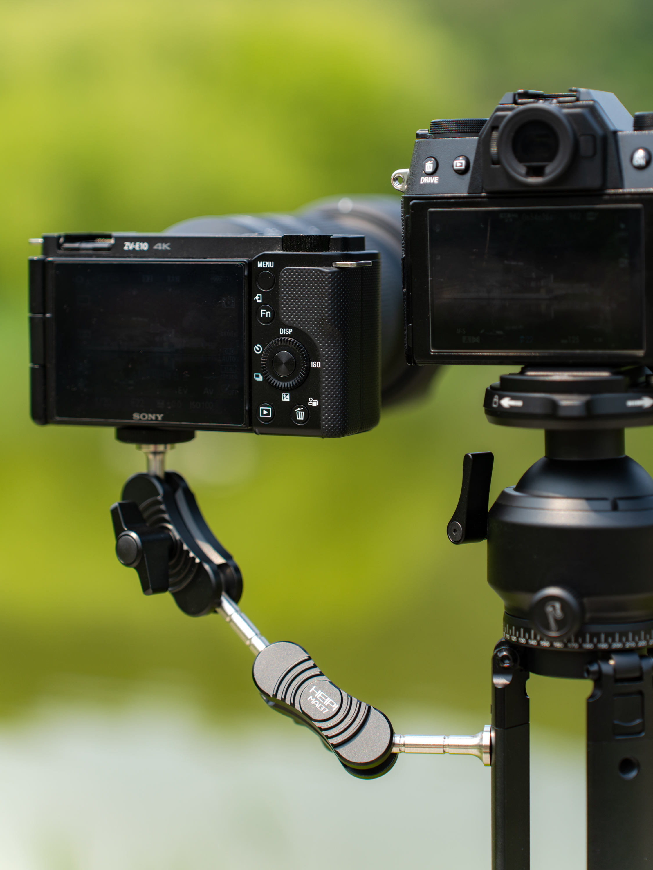 저는 주로 두 개의 카메라를 동시에 촬영하는 용도로 매직암을 사용했습니다. 볼헤드보다 지지하중이 낮은만큼 가장 가벼운 소니 ZV-E10을 매직암에 연결했고 탐론 17-70mm F2.8 Di III-A VC RXD 렌즈 포함 약 900g의 장비를 문제 없이 추가 장착할 수 있었습니다. 각도 조절이 자유로워서 삼각대를 옮기지 않고도 서브 카메라의 방향과 각도를 다양하게 설정할 수 있는 것이 마음에 들었습니다. 두 개의 레버를 모두 잠그면 단단하게 고정됩니다.