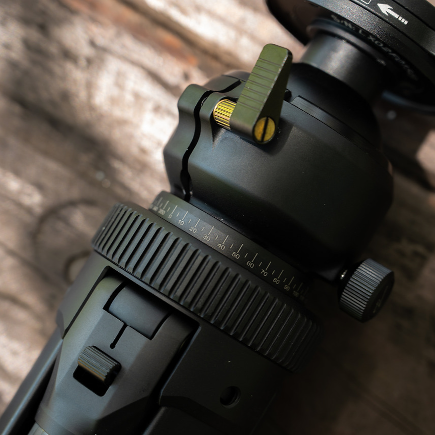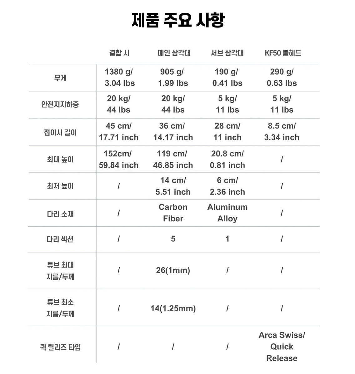 기본 탑재된 KF50 볼헤드의 지름은 50mm입니다. 삼각대 전체 지름 70mm에 육박하는 대구경으로 소형 볼헤드보다 확실히 안정적으로 느껴집니다. 볼헤드의 안전 지지하중은 5kg, 메인 삼각대는 20kg입니다. 범용성 높은 알카 스위스 규격에 원터치로 장착, 해제가 가능한 퀵슈 방식을 추가했습니다. 카메라의 각도는 메인 레버와 패닝 잠금 레버 두 개로 제어합니다. 삼각대 높이 조절, 퀵슈 장착과 볼헤드 조작이 모두 원터치 방식으로 기동성에 확실한 장점이 있습니다.