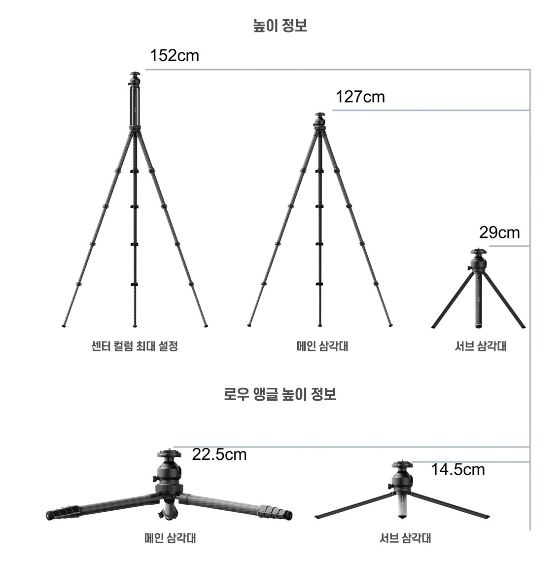 삼각대의 최대 높이는 152cm. 제가 사용한 1kg 대의 여행용 삼각대 중 가장 높습니다. 수 년째 사용 중인 레오포토의 LX-225CT(137cm)보다 약 15cm 더 높아요. 한 뼘도 안 되는 차이지만 이 차이로 눈 높이와 자세가 달라집니다. 카메라를 올리면 제 눈높이와 얼추 맞춰져서 촬영이 한결 편해요. 전망대에서는 난간에 가리느냐 넘어 서느냐에 따라 촬영의 성패가 갈릴 때도 있습니다. 그런 이유로 15cm를 의미있게 받아 들입니다.