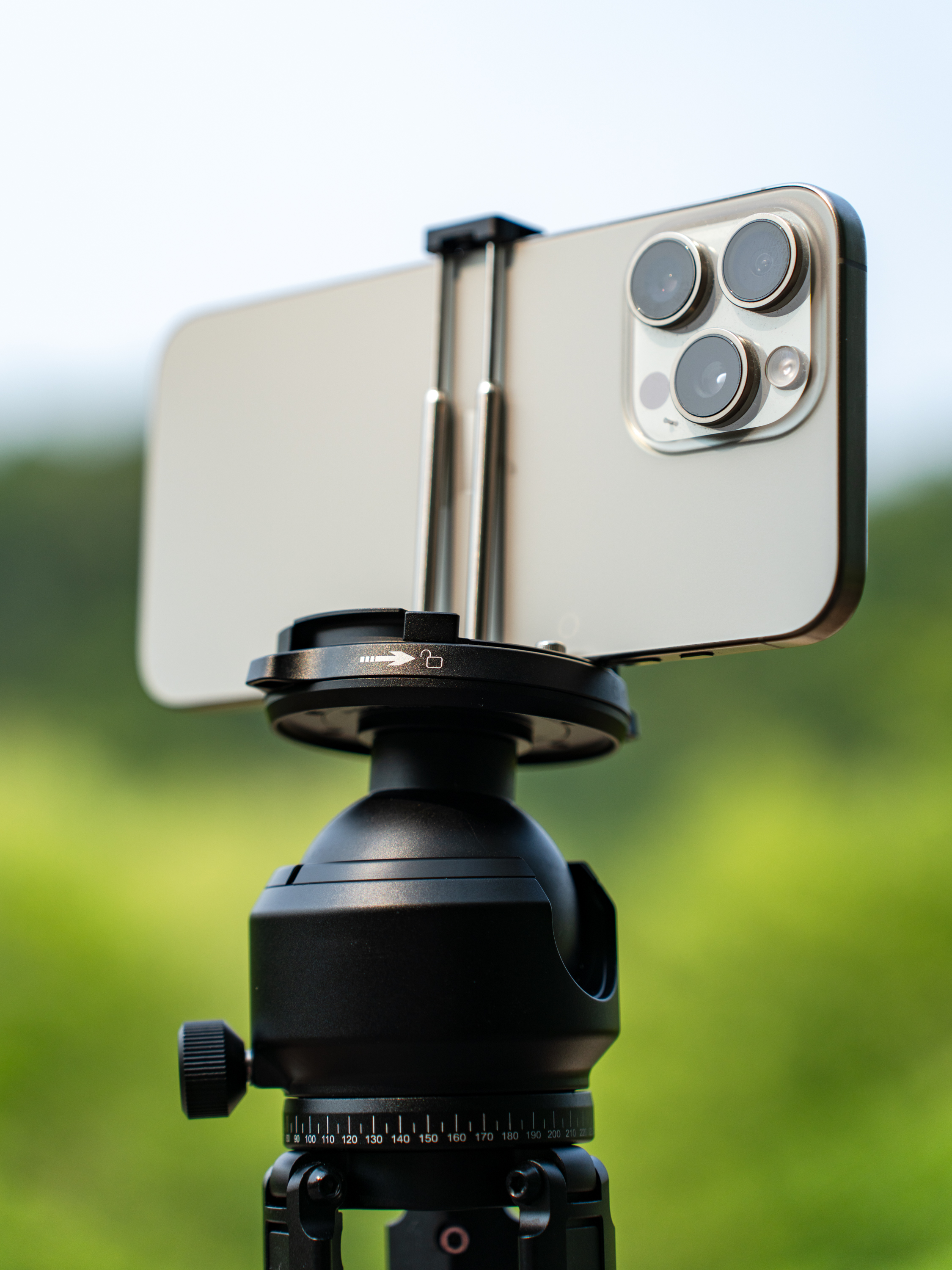 플레이트 결합부에는 마트폰을 마운트 할 수 있는 클램프가 숨어 있습니다. 전용 클램프보다야 여러모로 빈약하지만 급할 때 유용해요. 볼헤드를 세로 방향으로 돌리면 세로 촬영도 할 수 있습니다.