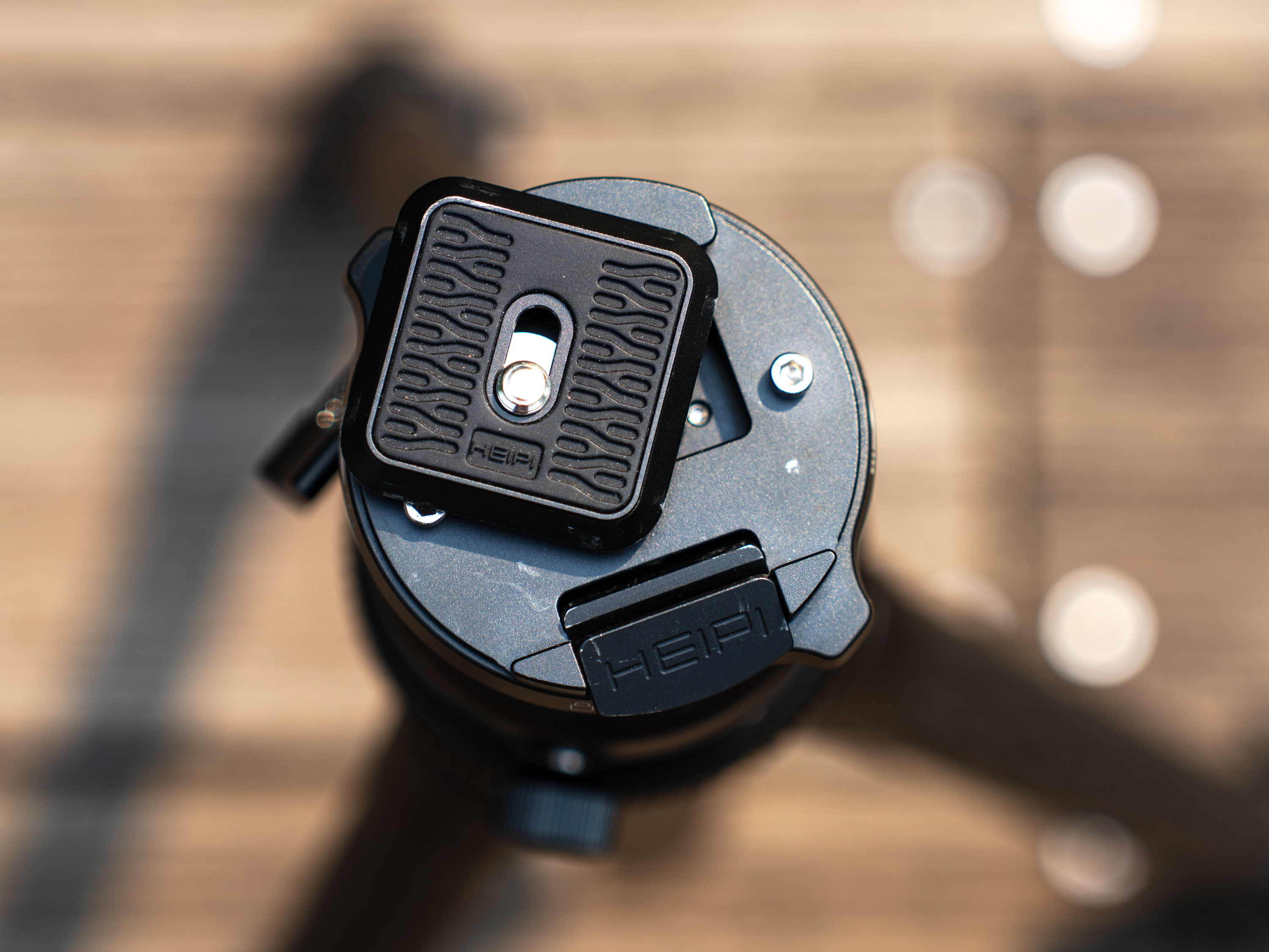 볼헤드의 홈에 플레이트를 맞춘 뒤 누르면 고정되는 방식입니다. 나사를 조이고 푸는 것보다 속도도 빠르고 풀릴 위험도 적습니다. 분리할 때는 플레이트 결합부 주변의 릴리즈 잠금 링을 돌리면 됩니다. 촬영 내내 나사 조이고 풀다 손가락이 욱씬 거리는 경험을 해 봤다면 이 삼각대의 퀵슈 방식이 마음에 드실 거예요.