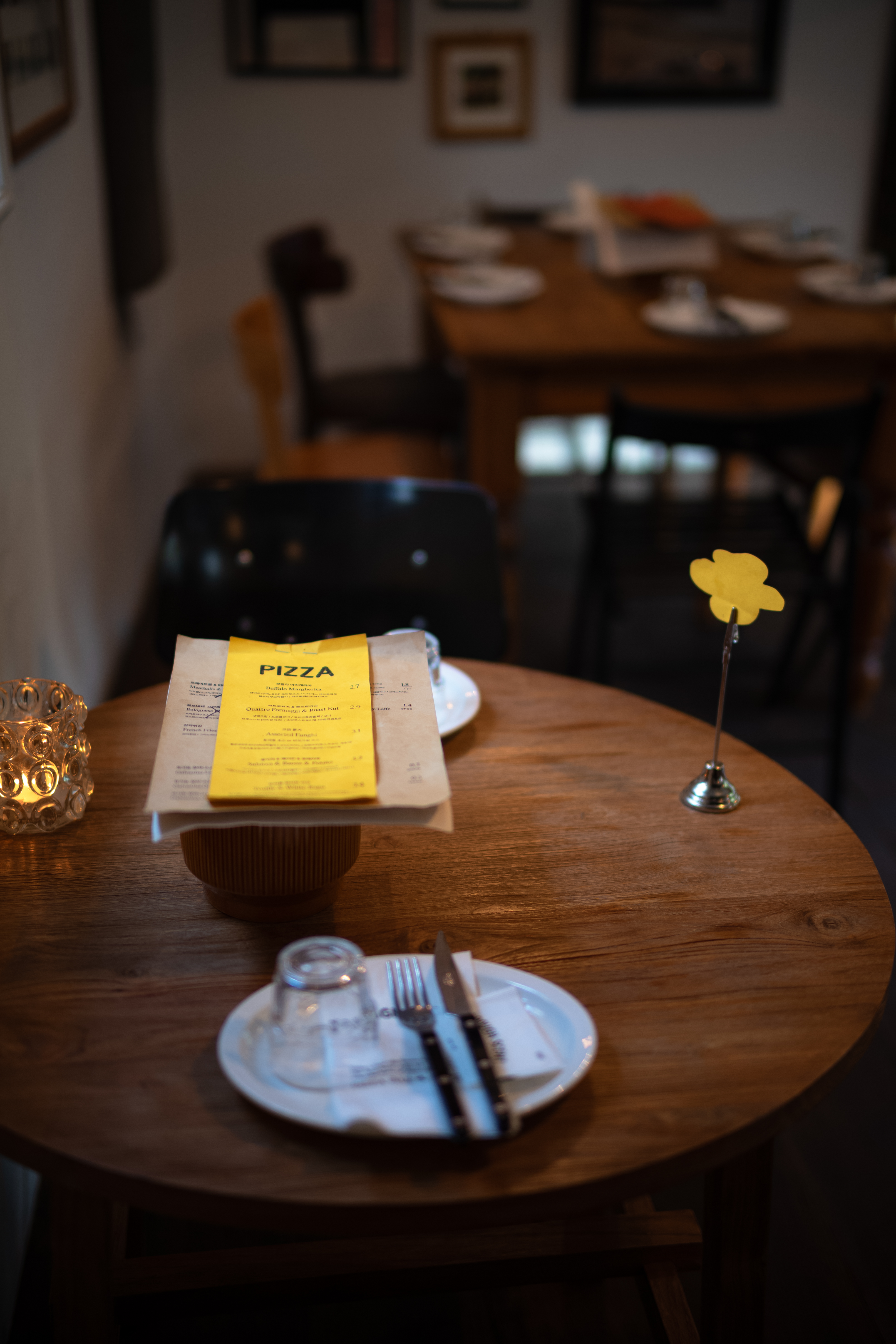 단체석과 바 포함 6-7개의 테이블이 있습니다. 저는 바에 앉았고요. 좀 좁고 불편해도 주방에서 요리가 만들어지는 것을 보는 재미가 있었습니다. 메뉴는 피자가 중심이고 튀김류의 사이드 메뉴가 있습니다. 거기에 피자, 와인. 파스타 메뉴는 없는 피자 전문점입니다.