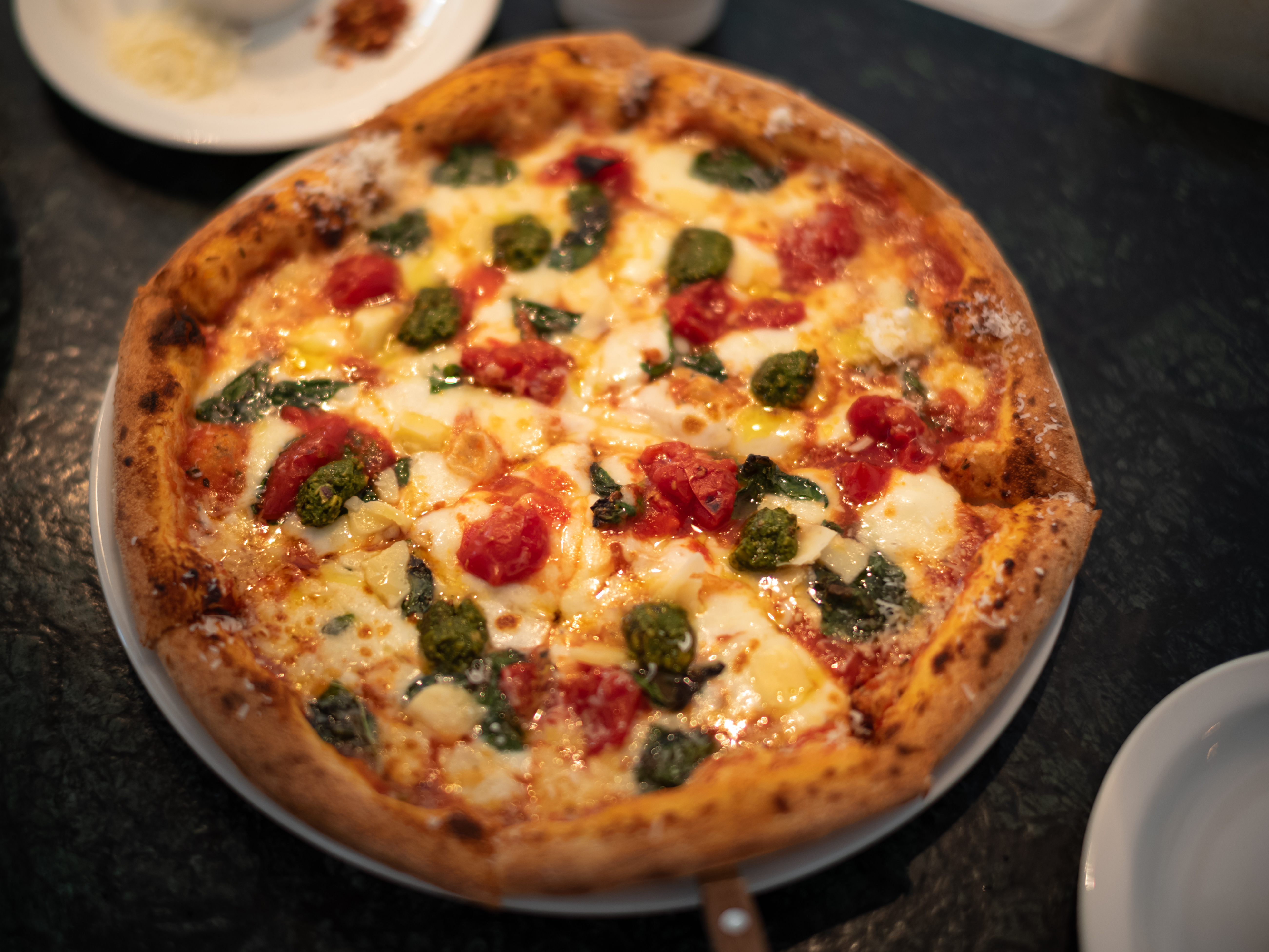 메인 메뉴인 피자. 토핑으로 올라간 체리토마토는 이탈리아 품종으로 단맛이 강하다고 합니다. 거기에 페스토와 치즈, 올리브 오일 등에 대한 정보도 들을 수 있어 좋았어요. 신선한 토마토와 치즈에서 느껴지는 풍미가 좋았고 오일이 더해져 쥬시한 피자였습니다. 기대했던 정통 이탈리안 스타일에 가까워서 만족합니다. 가격 대비 음식의 만족도, 가게 분위기가 마음에 든 곳이었어요. 다음에는 다른 피자를 먹어보려고요.