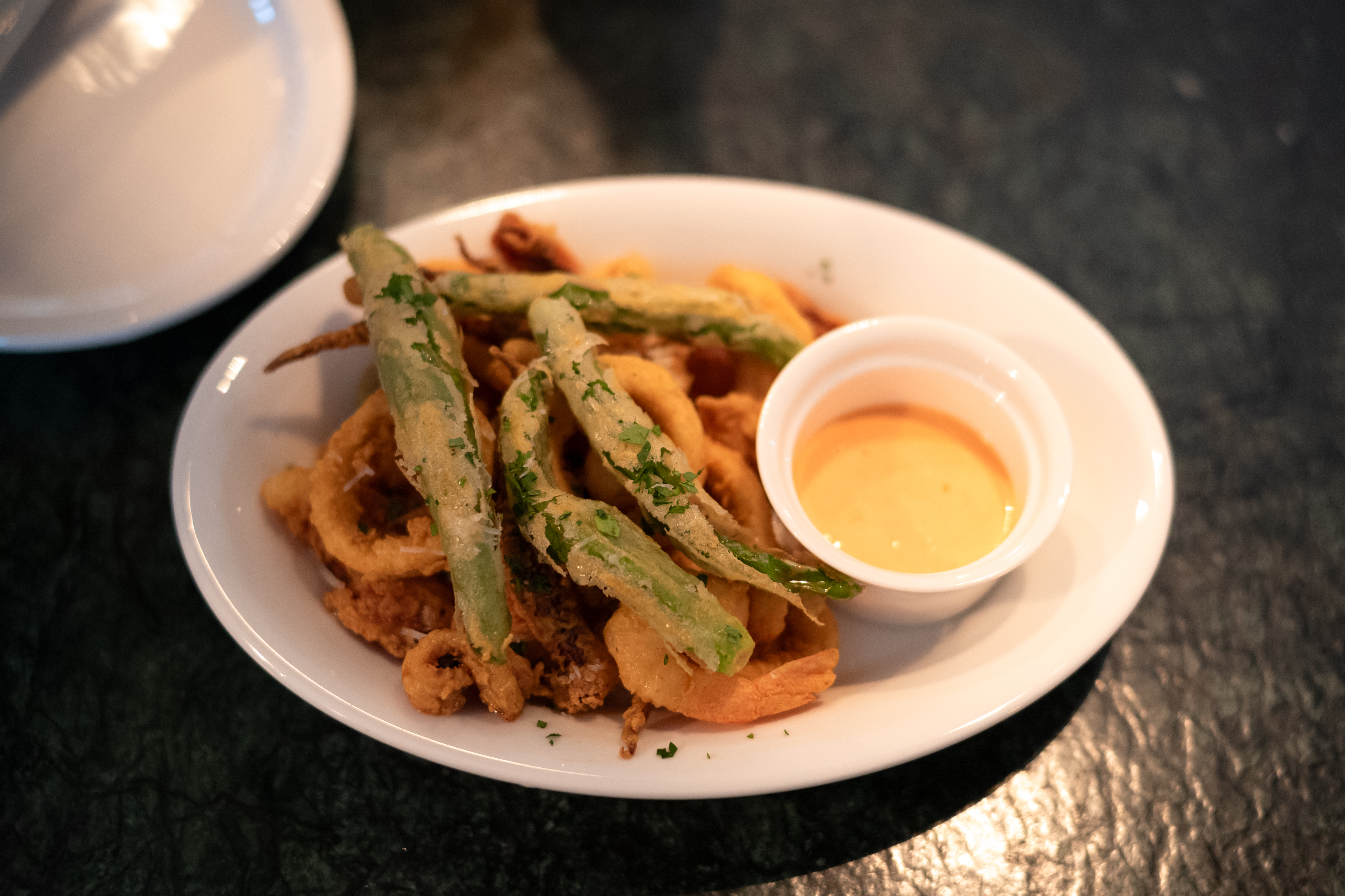 사이드 메뉴 중 인기가 있다는 깔라마리. 오징어와 새우, 꽈리고추, 올리브, 마늘을 튀겼습니다. 시즈닝이 강해서 양념치킨 먹는 느낌이 들기도 했는데 맥주 안주로는 그만이겠더군요.