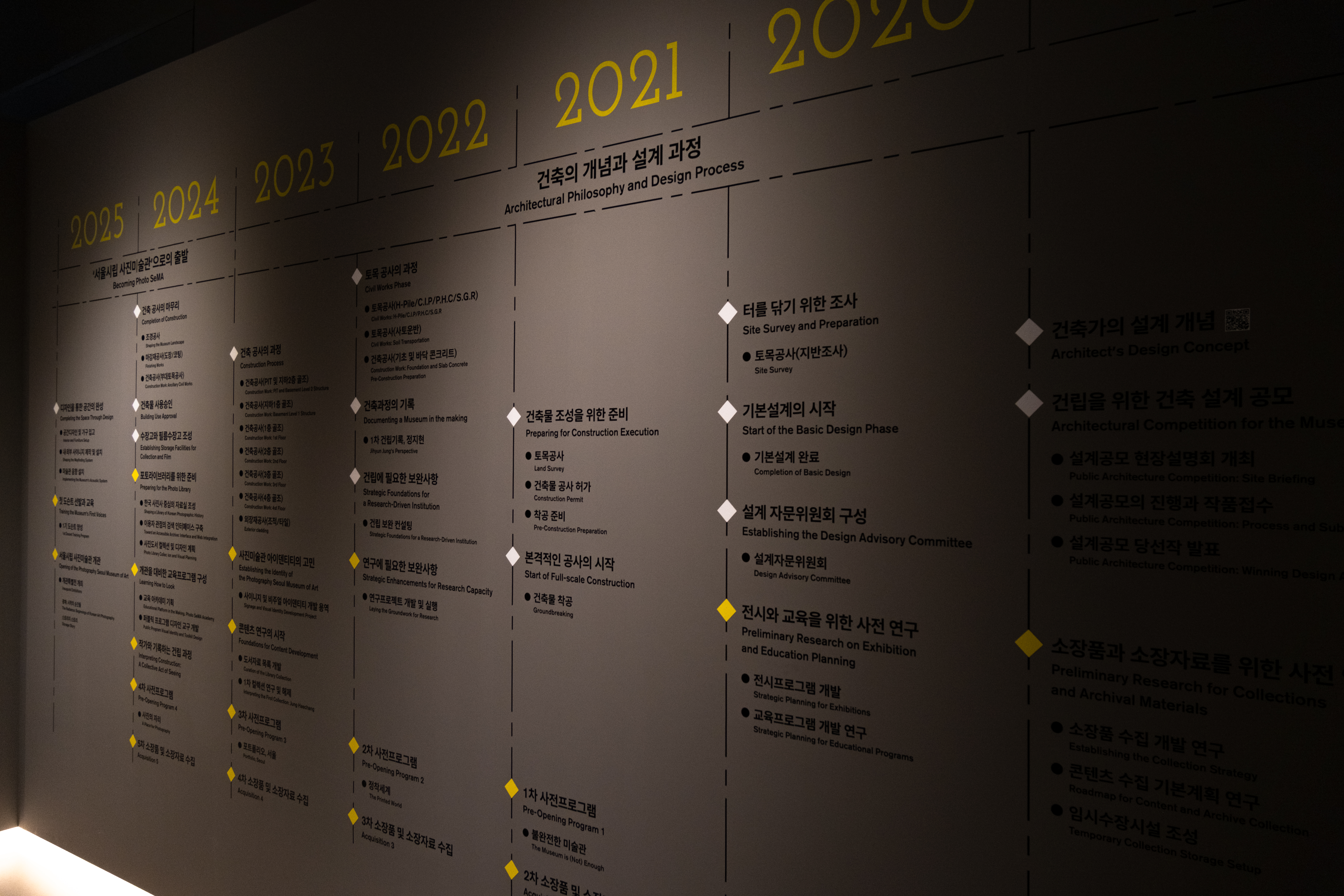 이를 구현하기 위해 사진 매체의 대표 속성을 ‘재료’, ‘기록’, ‘정보’로 정의하고, 여섯 명의 작가와 함께 건설 현장과 자재, 건립 과정에서 수집된 소장품과 자료, 더불어 지역의 역사·문화·지리적 맥락을 탐색하며, 사진미술관의 형성을 하나의 이야기이자 ‘살아 있는 서사’로 풀어냈다. 이 과정은 미술관의 탄생을 단순한 제도적 출발이 아니라, 참여한 사람들의 감각적 경험과 기억, 기술 변화의 층위, 정보 환경의 구조적 변화 속에 이루어진 공동의 창작 행위로 바라보는 관점을 제공하며, 동시에 매체 고유의 기능을 비판적으로 재고하고, 예술에서 사진이 수행하는 복합적인 역할을 탐색하는 시도이다.