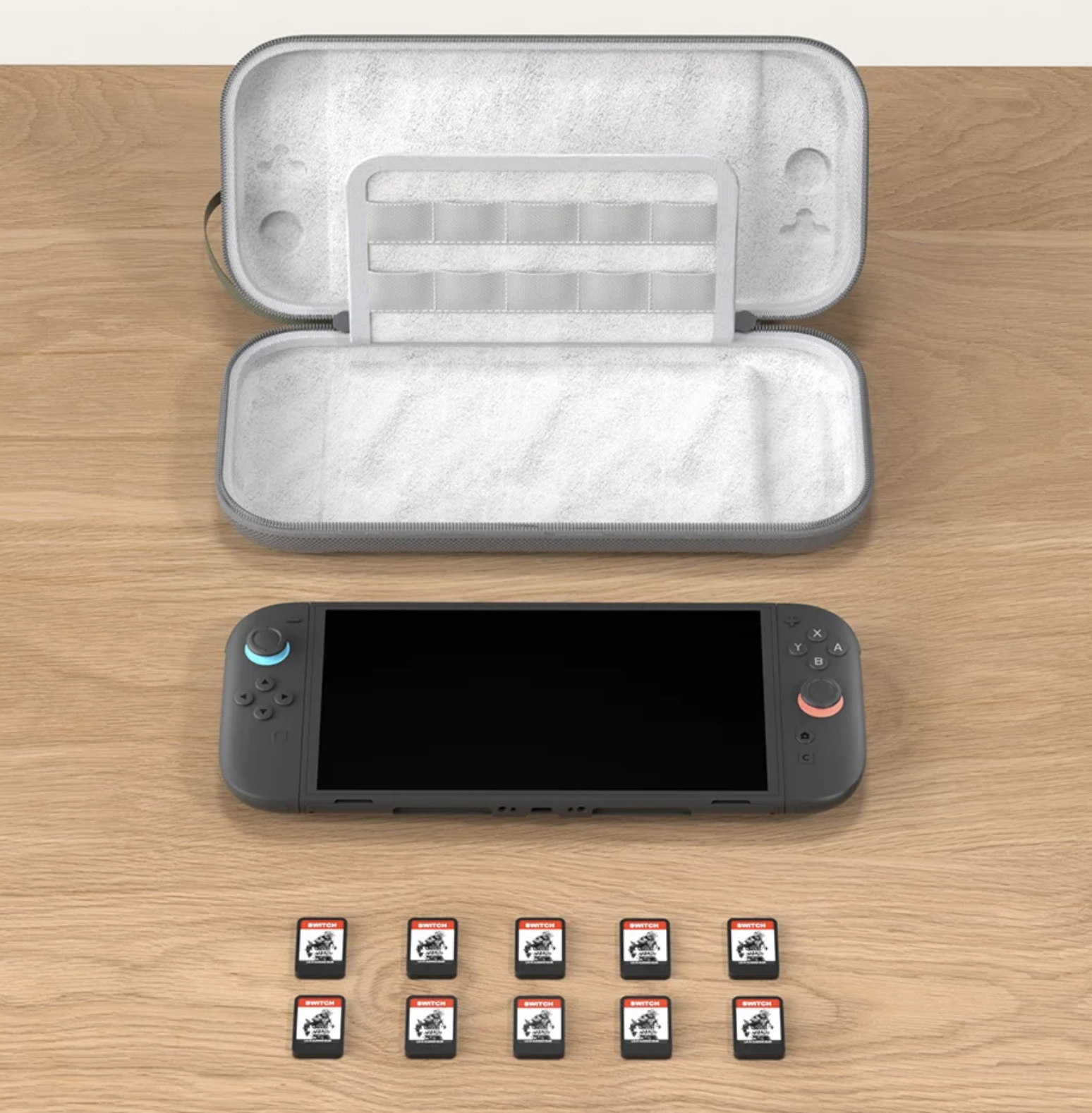 여분의 카트리지를 보관할 수 있는 공간입니다. 보통의 케이스는 이것을 스위치 화면 윗쪽에 둬서 화면을 보호하는 역할을 겸하지만 이 제품은 바닥에 뒀습니다. 스위치를 들어 올렸을 때 열리는 방식입니다. 이쪽이 케이스를 열었을 때 덜렁거리는 곳이 없어서 깔끔하더라고요.