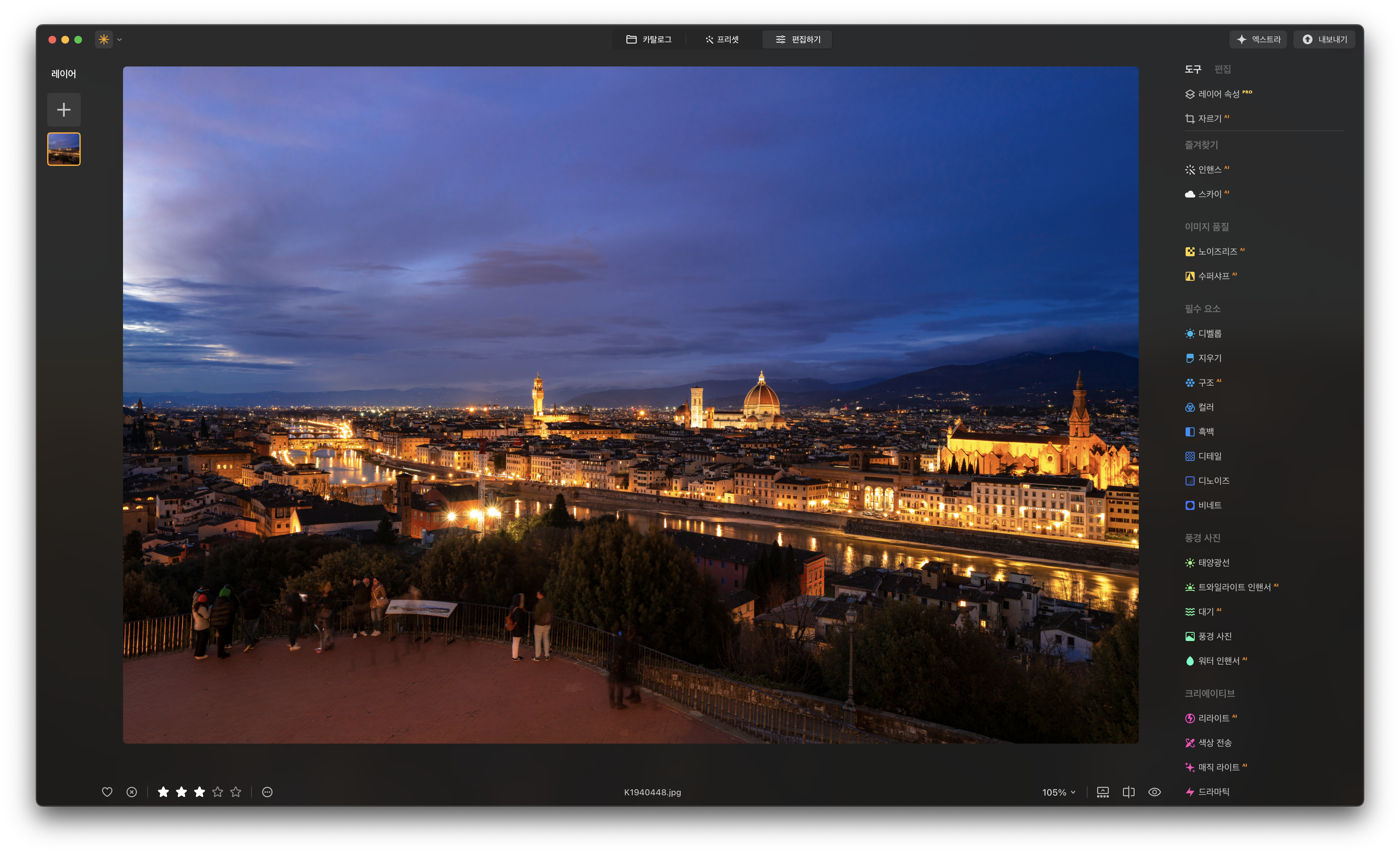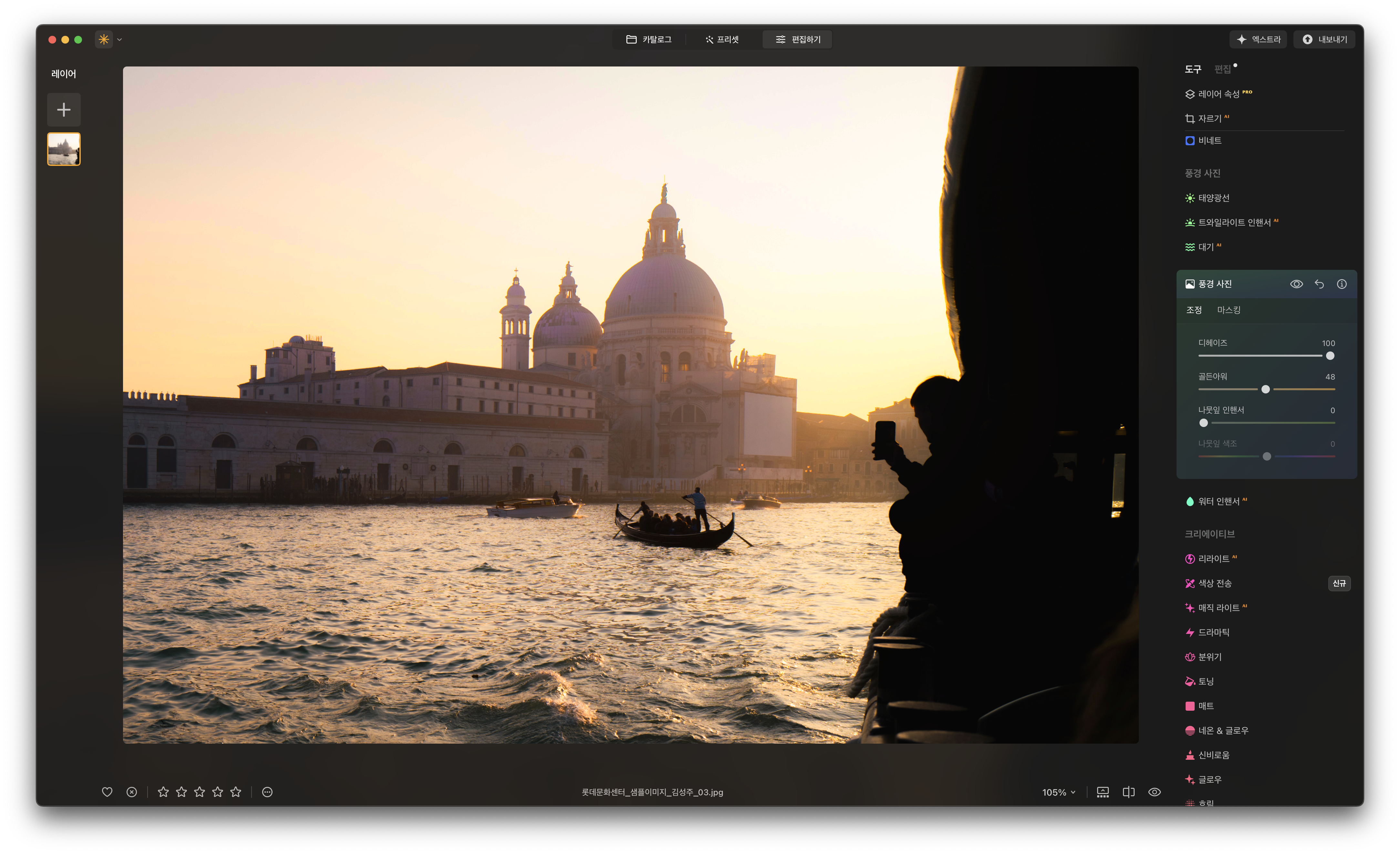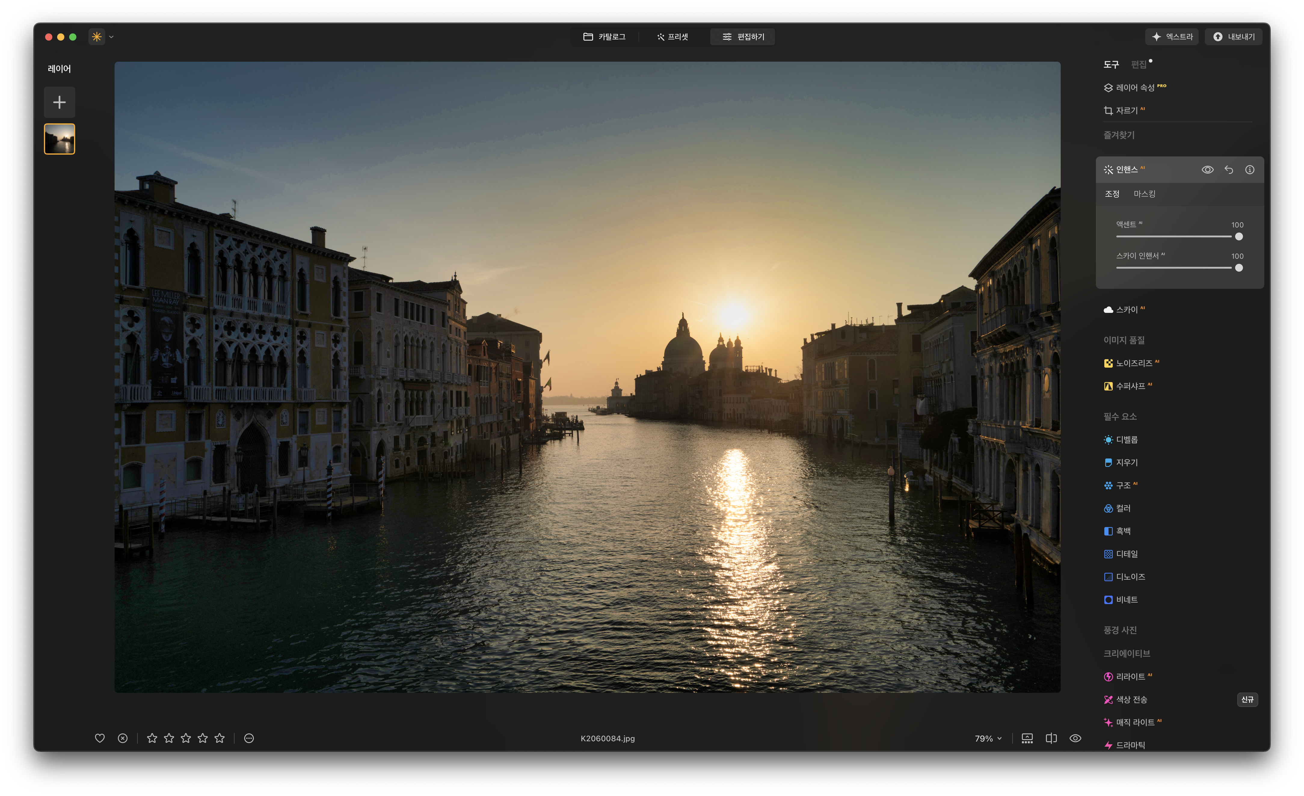 프로그램이 지속적으로 업데이트 되면서 런칭 초반보다 많은 기능들이 생겼습니다. 화면에 표시되는 메뉴들이 너무 많아 처음에는 겁을 먹을 수도 있어요. 하지만 이 프로그램은 간편한 사진 편집을 무엇보다 강조하고 있는 만큼 몇몇 핵심 기능들만 사용해도 충분히 본전은 뽑아 먹을 수 있습니다. 카탈로그에서는 새롭게 추가 된 생성형 기능, 편집하기에서는 인핸스 AI, 스카이 AI 그리고 분위기. 처음엔 이 정도에만 집중해 연습해 봐도 충분할 겁니다.