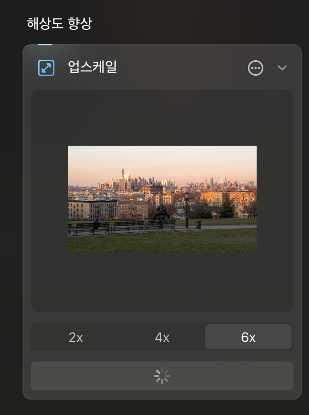 카탈로그 오른쪽 아래 업스케일 메뉴를 선택한 뒤 편집할 이미지를 끌어다 놓으면 됩니다. 해상도는 2,4,6배로 확대할 수 있습니다. 높은 배율로 확대할 수록 선명도가 떨어져 이미지가 뭉개져 보일 수 있으니 필요에 따라 값을 선택하는 것이 좋습니다. 저는 주로 2,4배를 이용합니다.