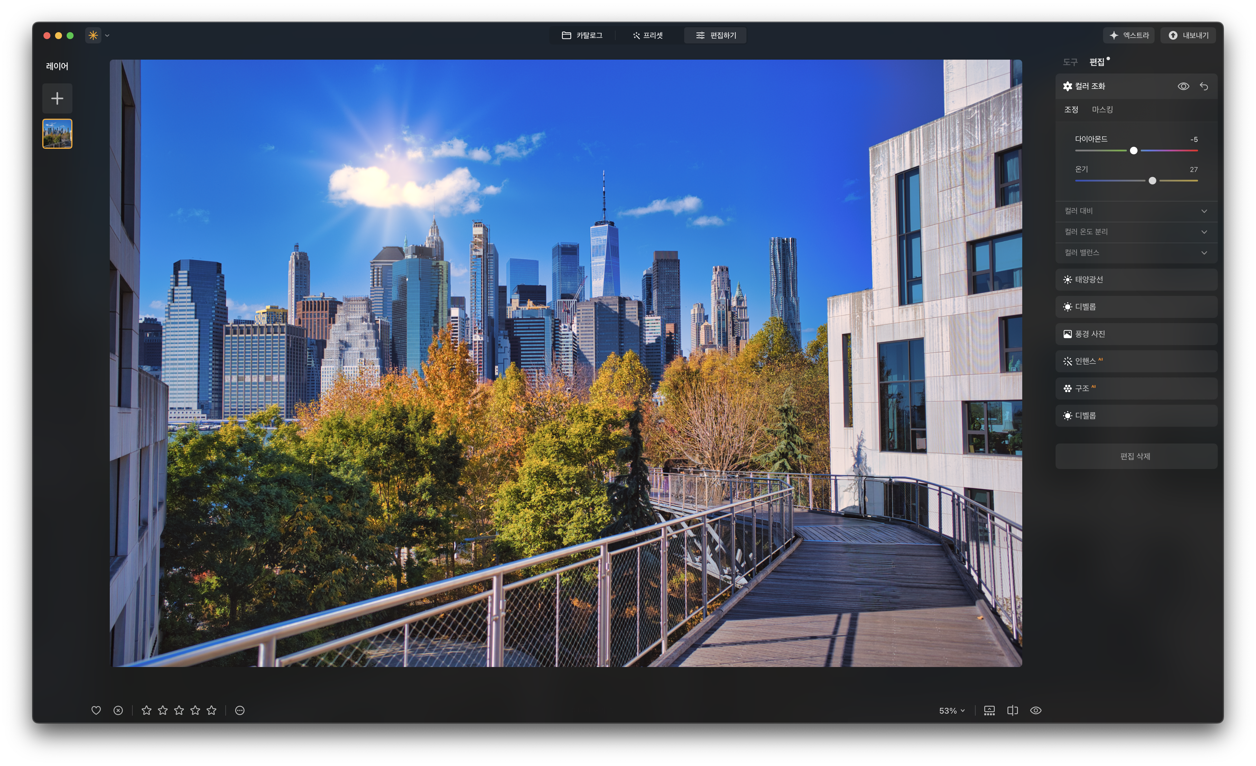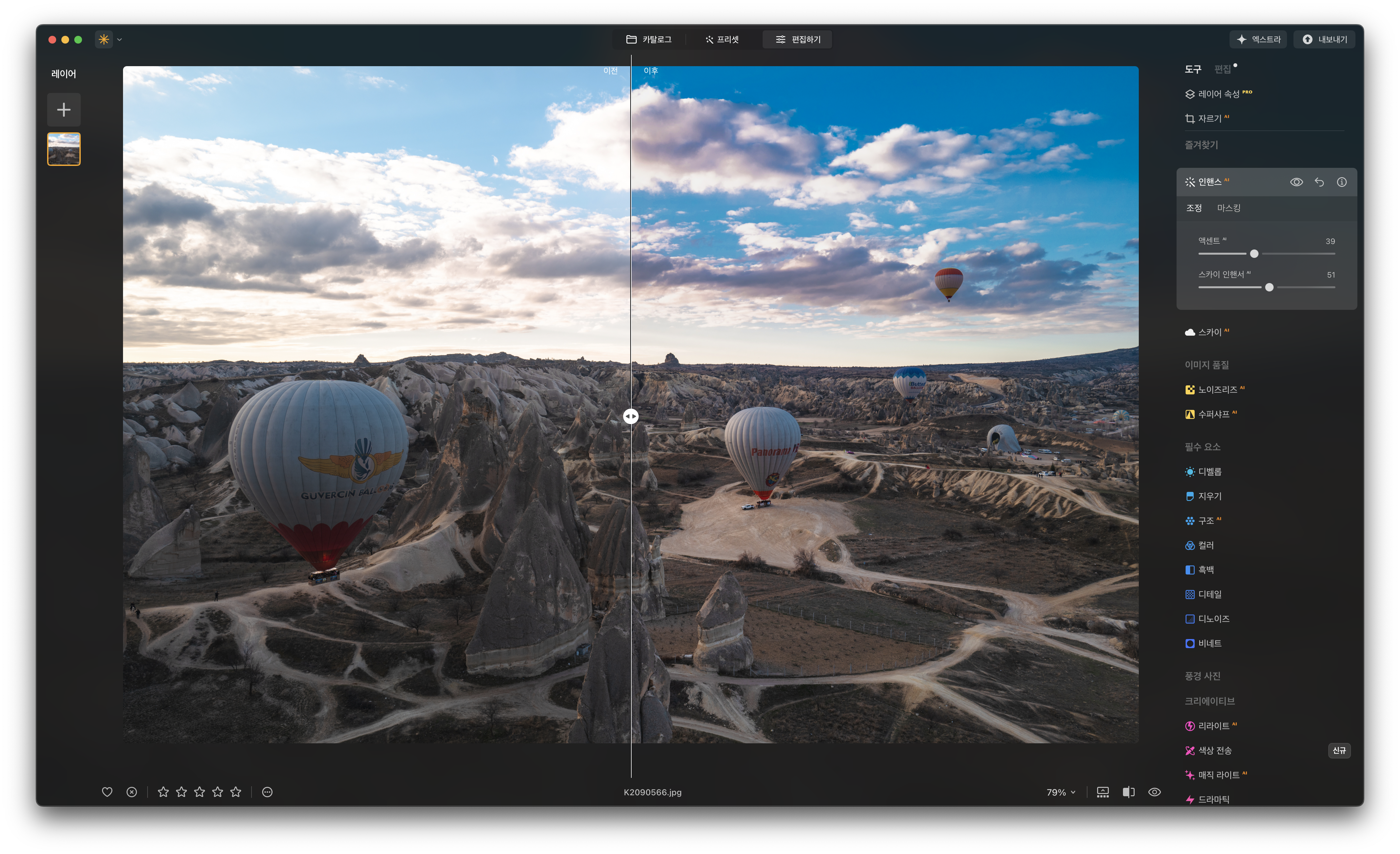 옵션은 액센트 AI와 스카이 인핸서 AI 두 개입니다. 액센트 AI는 이미지의 전체적인 톤을 조절해 줍니다. 명암대비가 심한 풍경에서는 암부 밝기를 올리고 명부는 낮춰 눈으로 보는 것과 비슷해집니다. 전체적인 윤곽이 진해지고 색도 선명해지는 효과도 있습니다. 특히 하늘의 파란색을 강조하는 데 효과적입니다. 직접 이렇게 보정하려면 하이라이트, 그림자, 채도, 색조 등등 여러 옵션을 만져야 하죠. 간편하고 직관적이라는 프로그램의 장점이 잘 표현된 기능입니다.