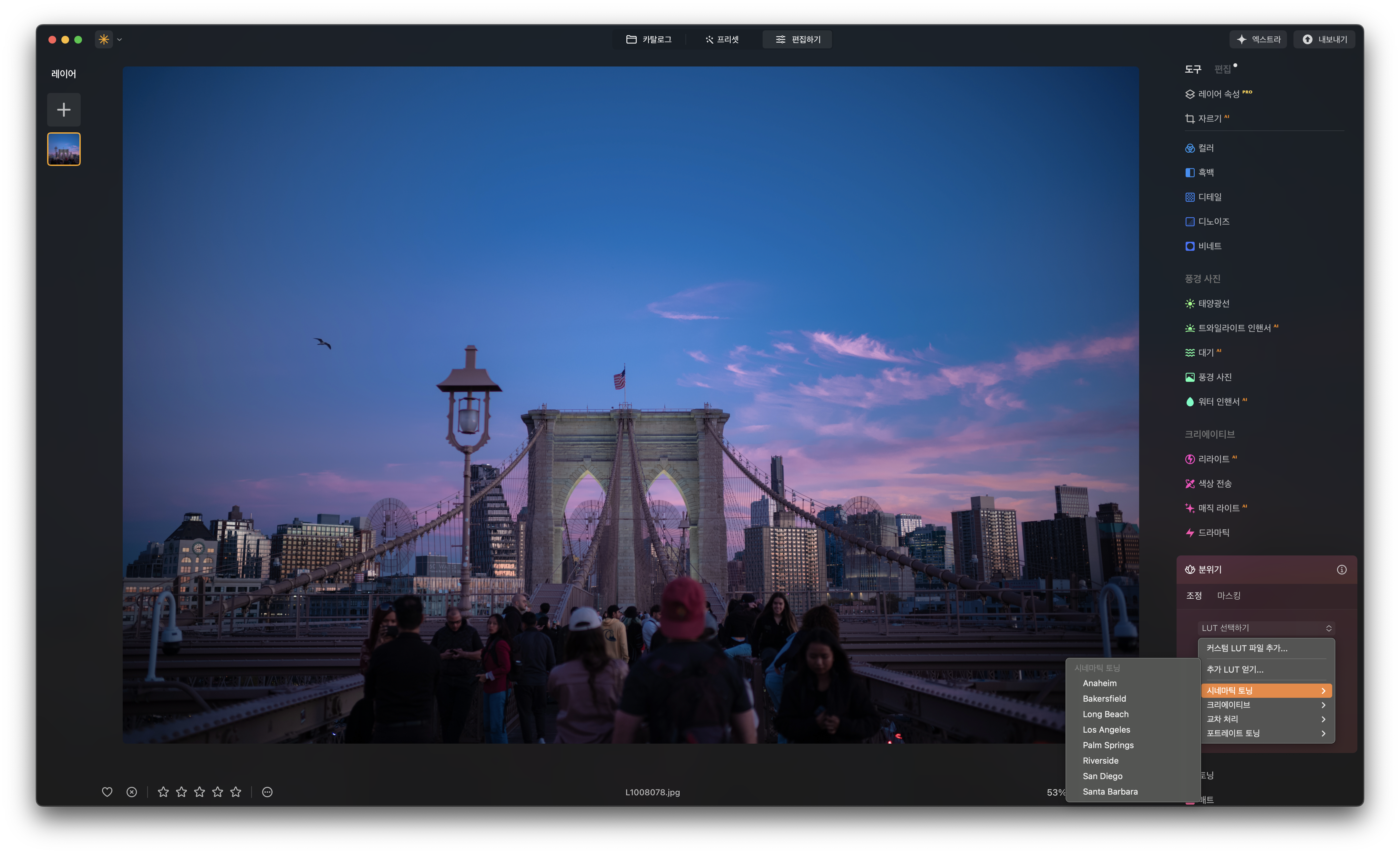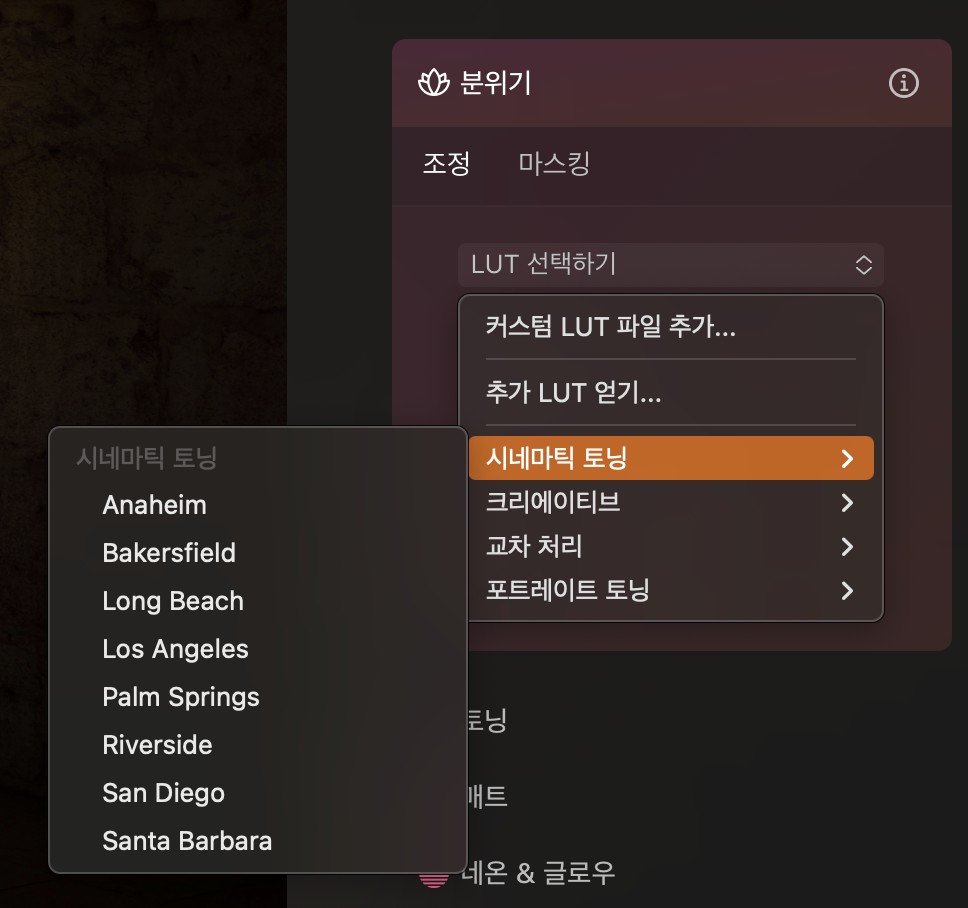 그 외 추천하는 툴을 꼽으라면 분위기 조정 기능이 첫 번째입니다. 요즘 인기 있는 감성 사진, 필름 느낌 보정을 담당하는 기능입니다. 프리셋 형태로 제공되는 LUT을 적용하거나 다운 받아 추가하면 원터치로 편집 작업이 끝나는 것이 매력입니다. 프리셋 메뉴와 비슷하지만 확장성에서 좀 더 높은 점수를 줍니다.