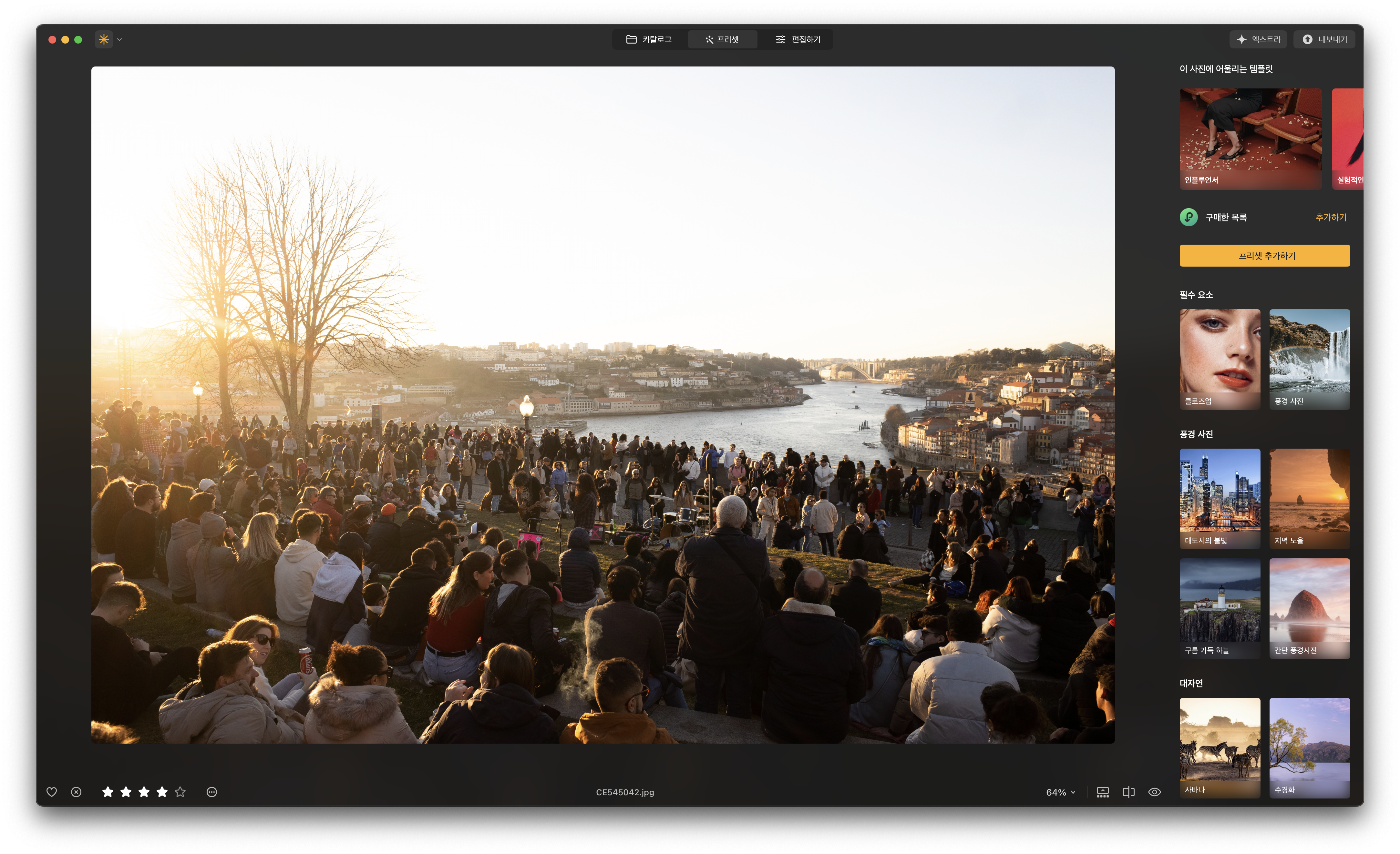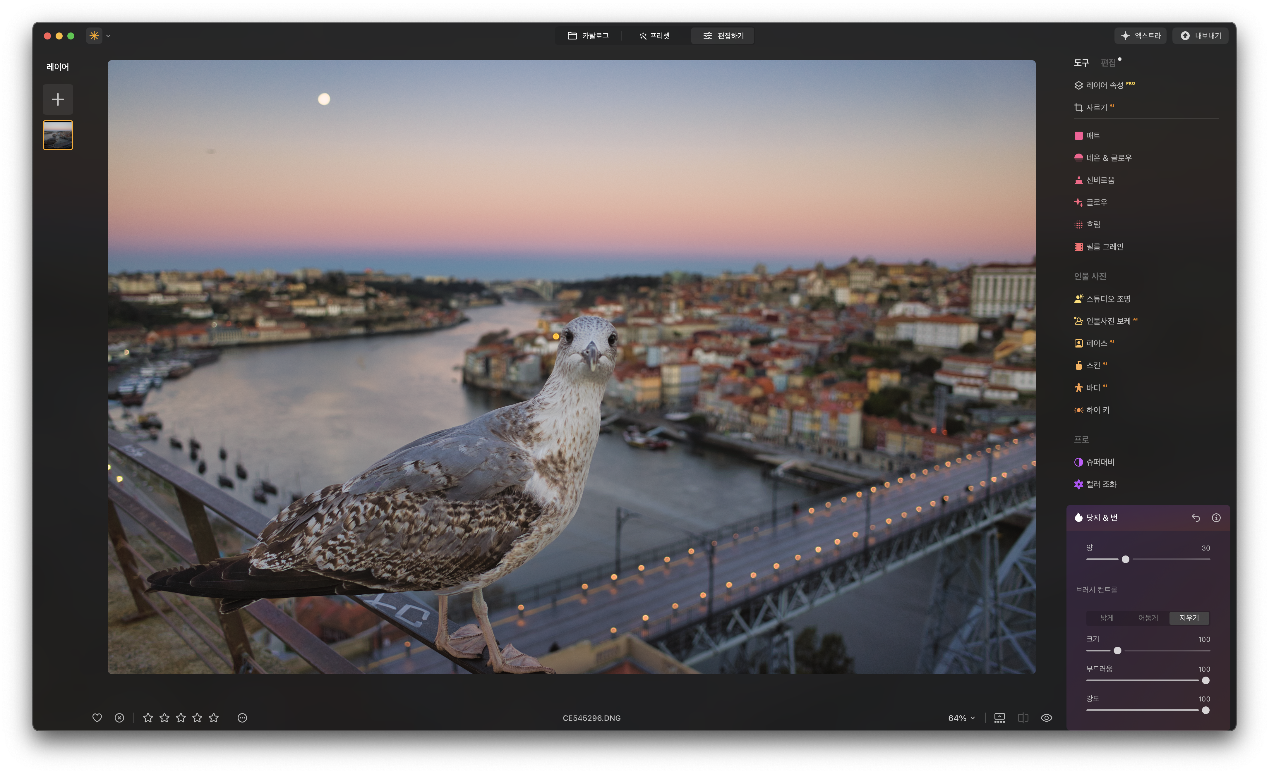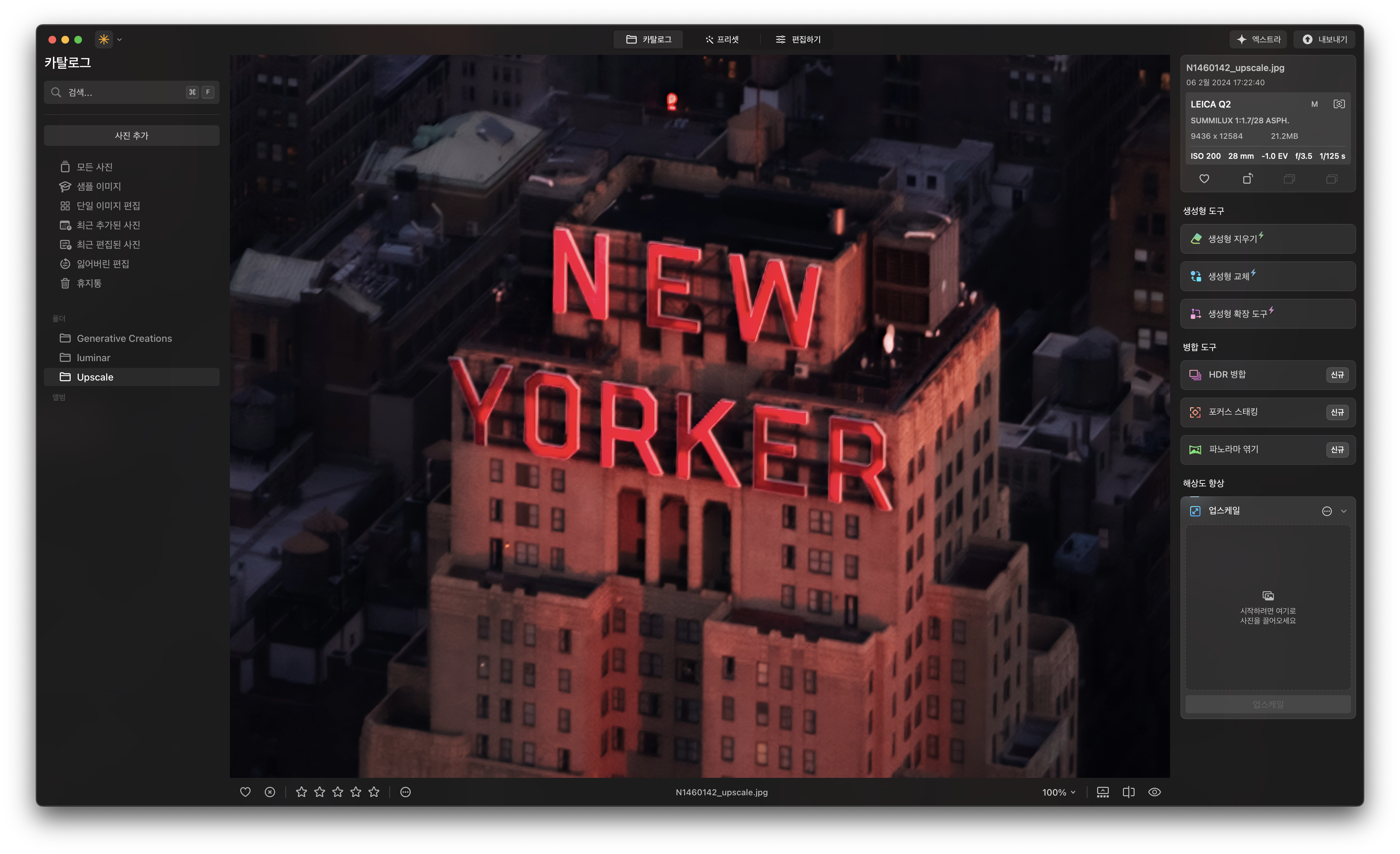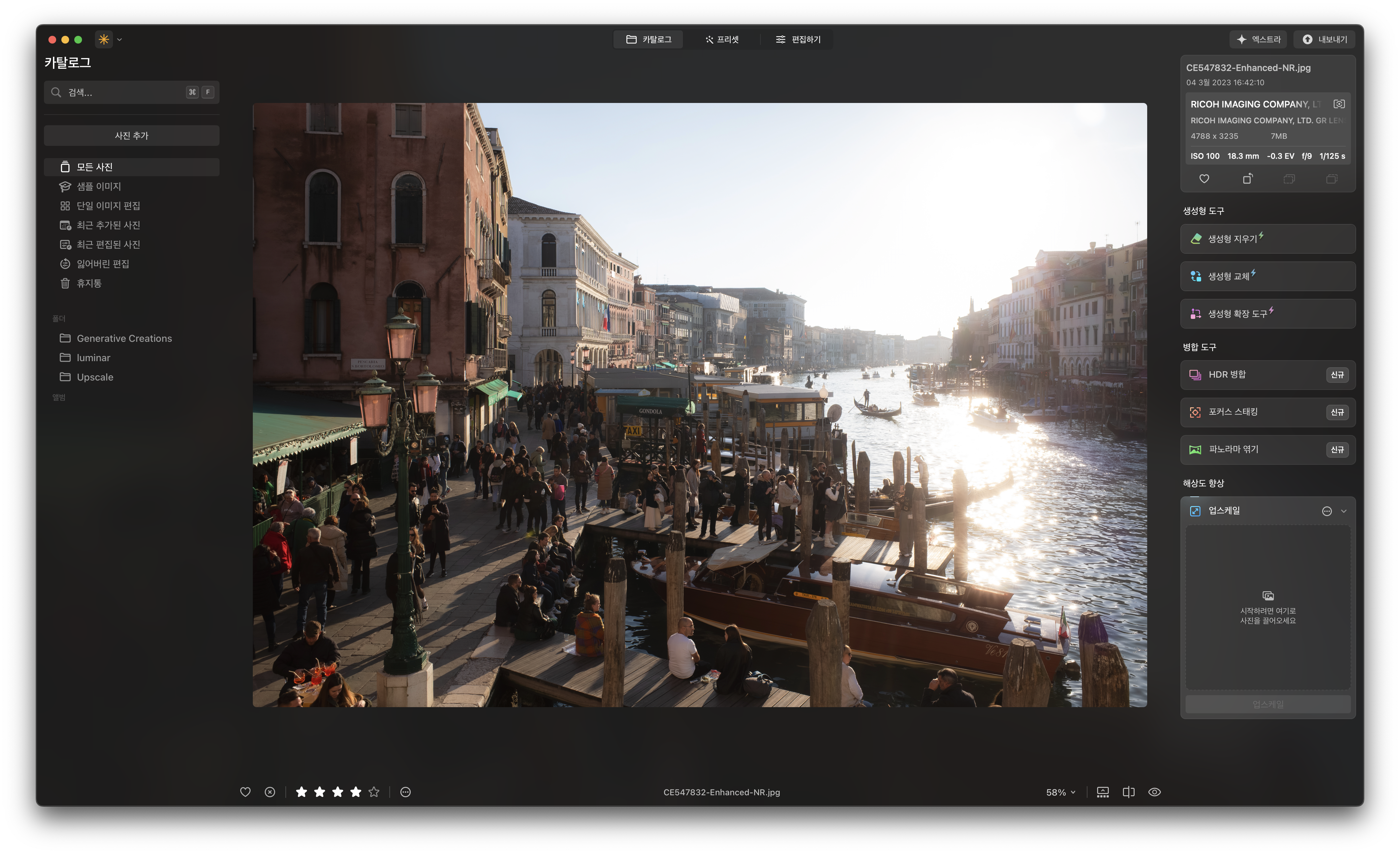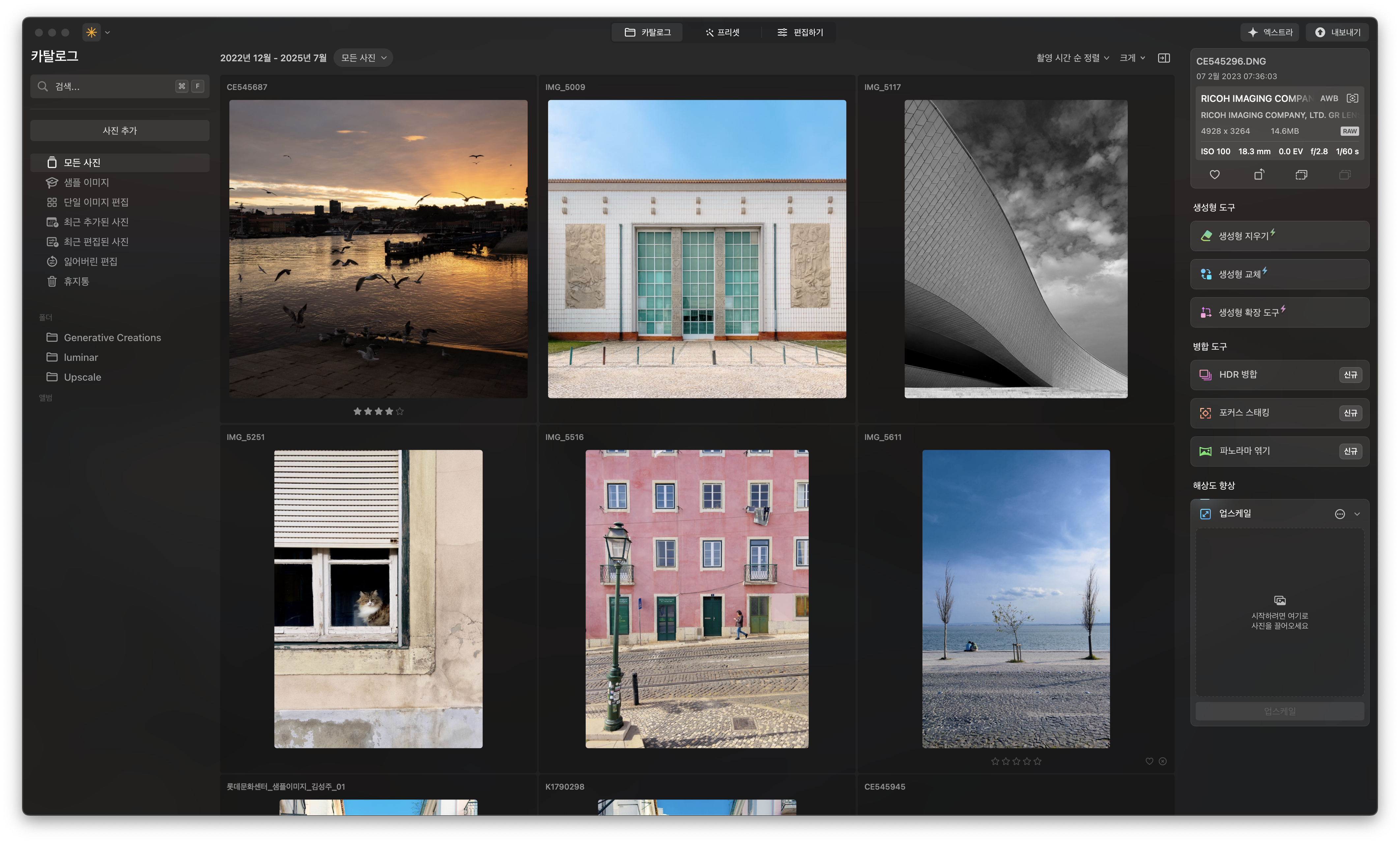 실행 화면 상단에 세 가지 메뉴가 있습니다. 카탈로그는 주로 저장된 사진들을 확인하는 데 사용되지만 최근 업데이트를 통해 생성형 기능들과 병합 도구를 카탈로그 화면에서 사용할 수 있게 됐습니다. 별도로 프리셋/편집 메뉴에 진입할 필요 없이 카탈로그 화면에서 간단한 편집 작업을 즉시 실행할 수 있어 좋습니다.
