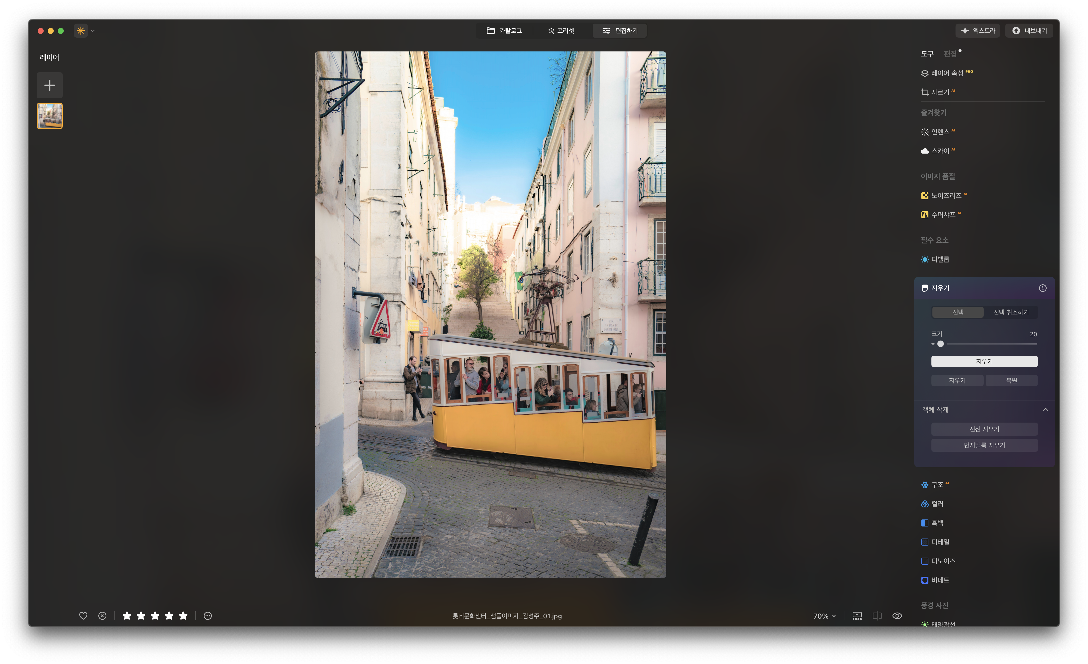 기존 지우기 메뉴는 생성형 지우기와 차이가 꽤 납니다. 삭제한 영역을 주변과 어울리는 것으로 채우지 못할 때가 많거든요. 다만 여전히 활용도가 있는 것이 전선, 먼지 얼룩 지우기입니다. 이 둘은 현역으로 사용해도 좋습니다.