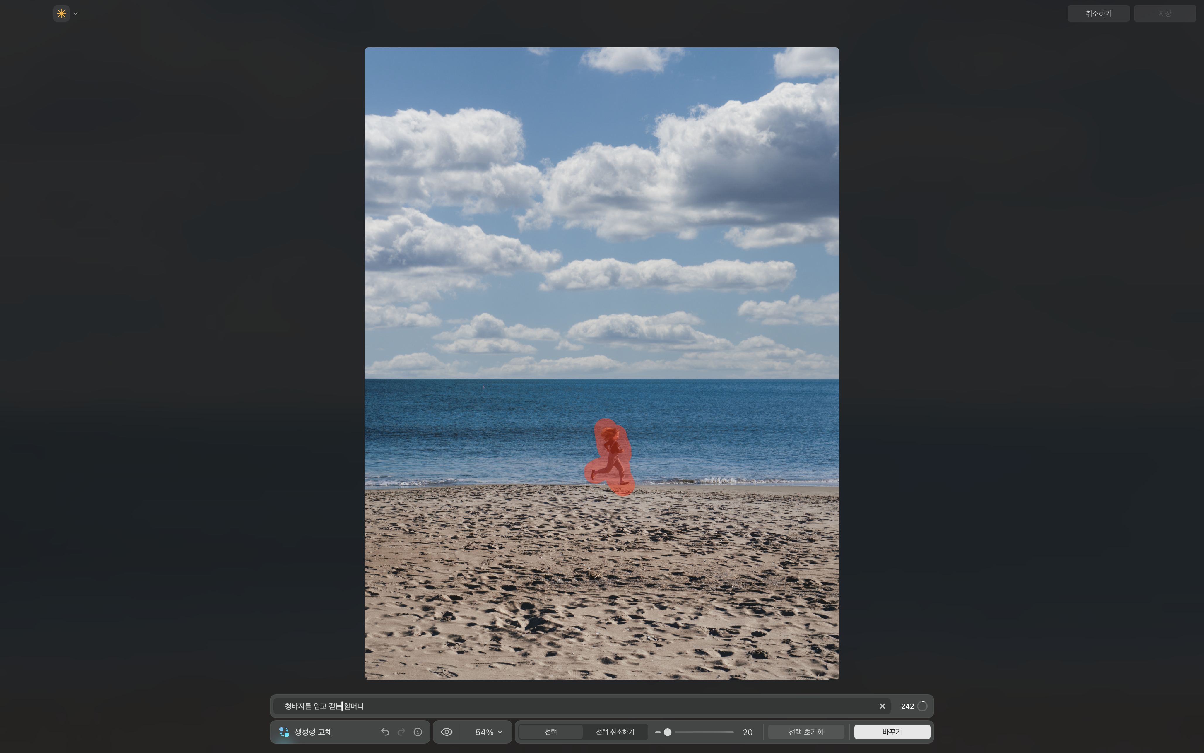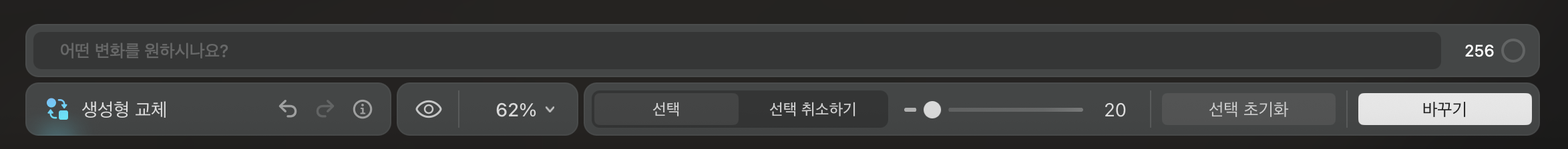변경할 영역을 선택하면 하단 메뉴에 "어떤 변화를 원하시나요?"라는 문구가 표기됩니다. 이 메시지 창에 원하는 피사체의 형태, 특징, 행동 등을 입력한 뒤 [바꾸기] 버튼을 클릭하면 실행됩니다.