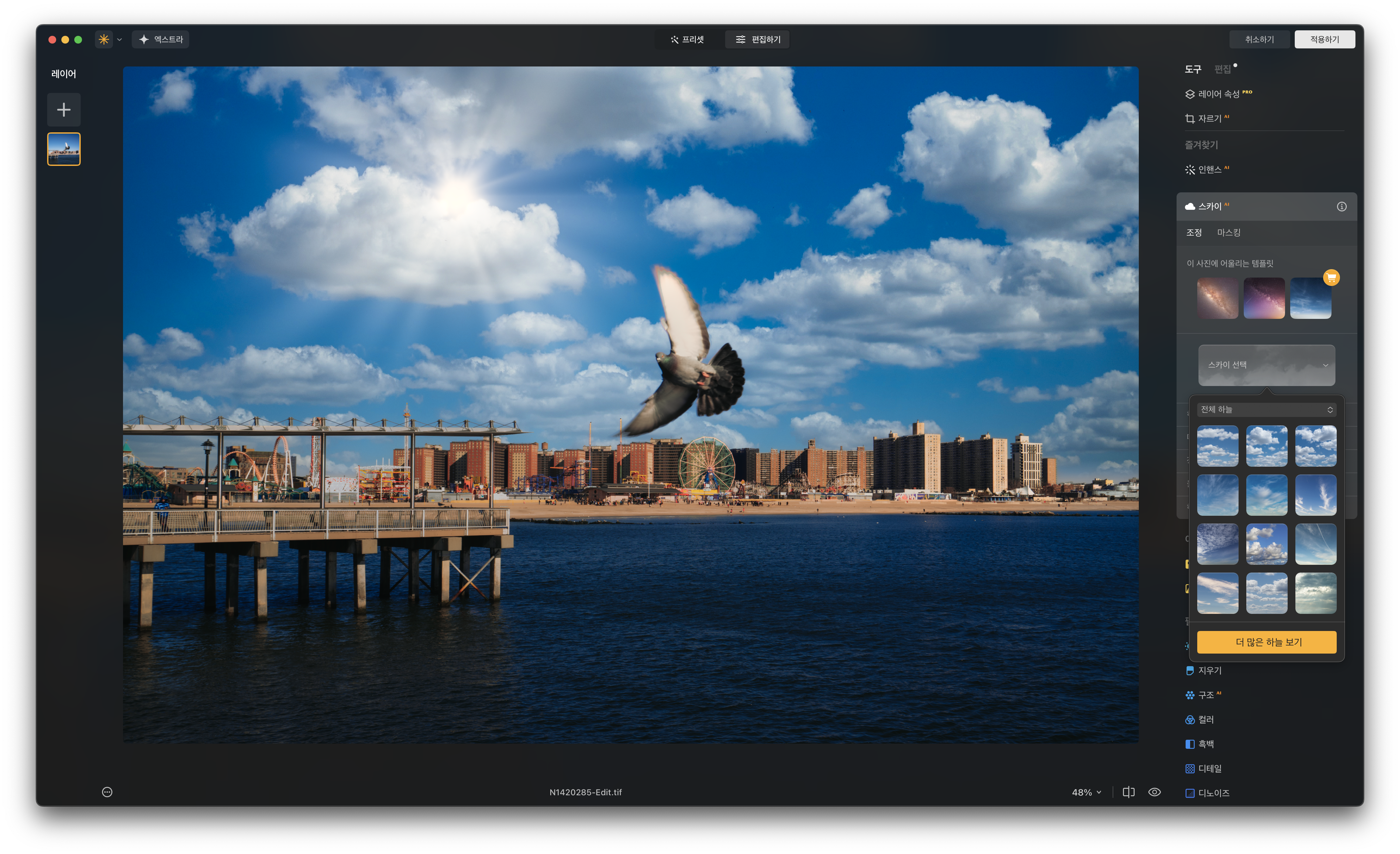 루미나 네오의 대표 기능입니다. AI가 사진 속 하늘 영역을 인식한 뒤 프리셋 형태로 저장된 이미지를 합성하는 기능입니다. 여행지의 날씨가 아쉬울 때, 사진의 분위기를 색다르게 연출해 보고 싶을 때 사용할 수 있습니다. 편집하기 메뉴에서 비교적 상단에 위치해 있습니다. 인핸스 AI와 함께 즐겨찾기에 배치해 놓았는데 그만큼 쉽고 효과가 좋습니다.