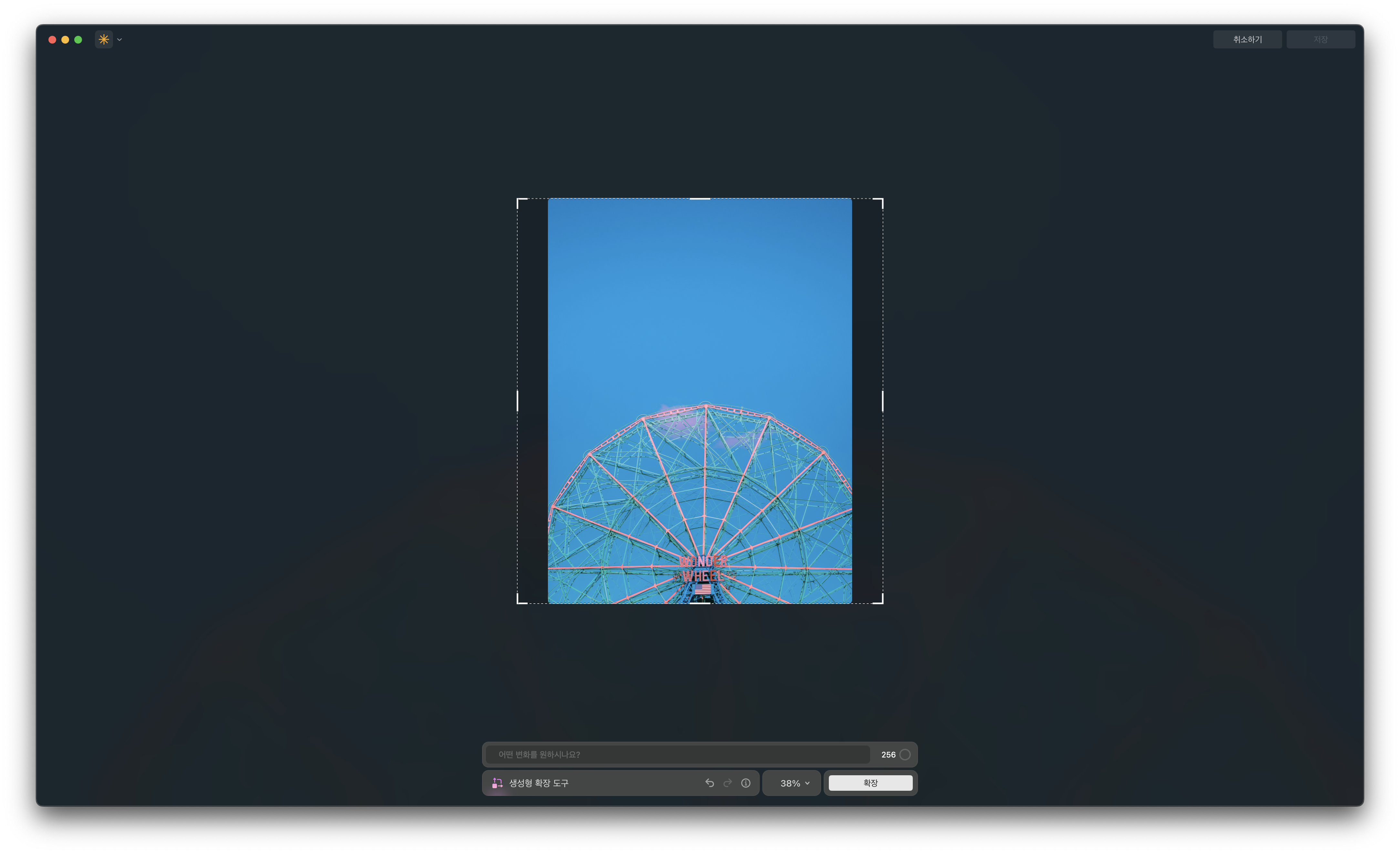 생성형 확장 도구는 말 그대로 이미지 주변부를 확장하는 기능입니다. 사진에 없는 주변부 풍경, 피사체를 AI가 추측해 만들어 줍니다. 세 개의 생성형 기능 중에서는 가장 사용하기가 까다롭지만 앞으로 추가 업데이트가 기대됩니다.