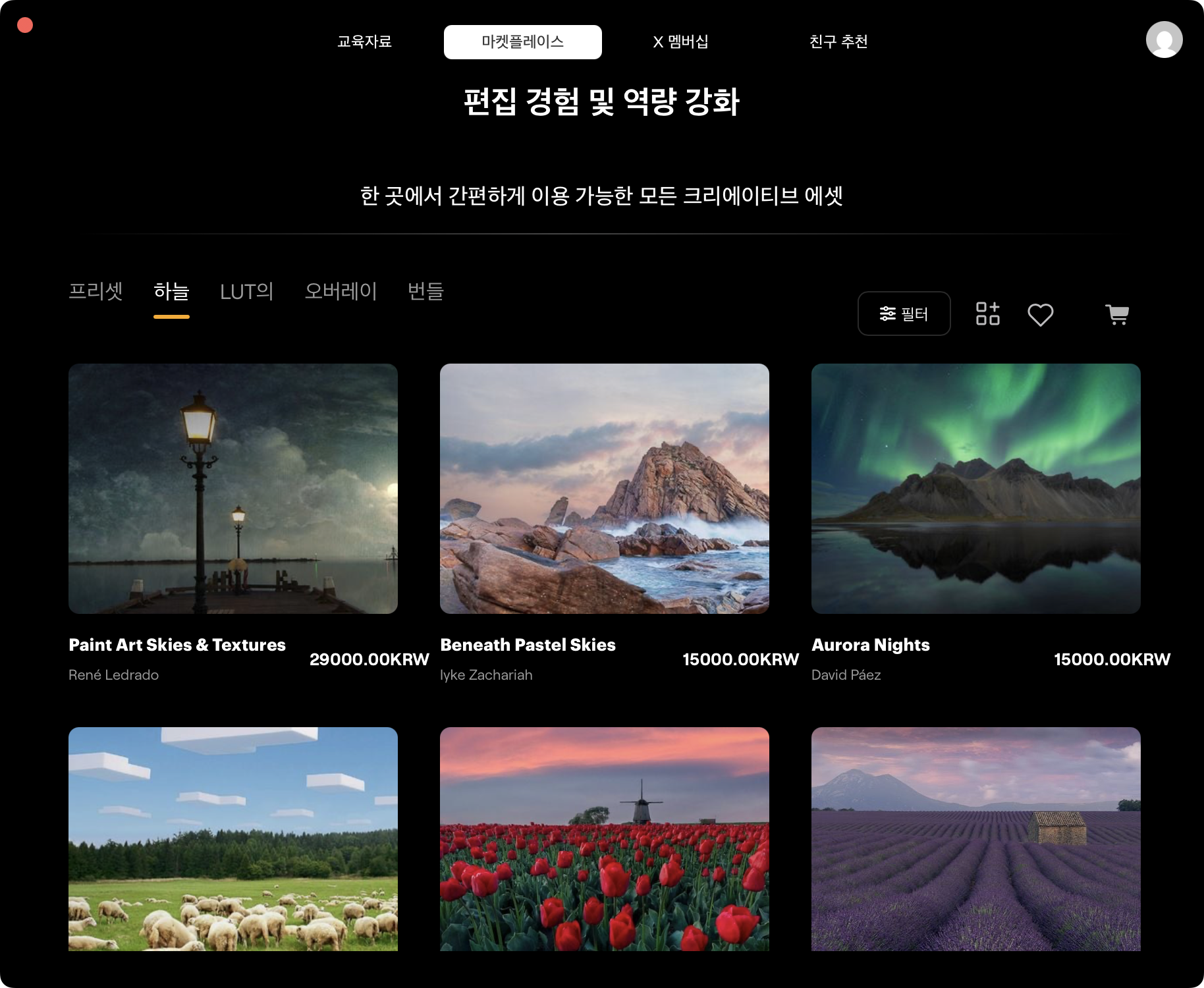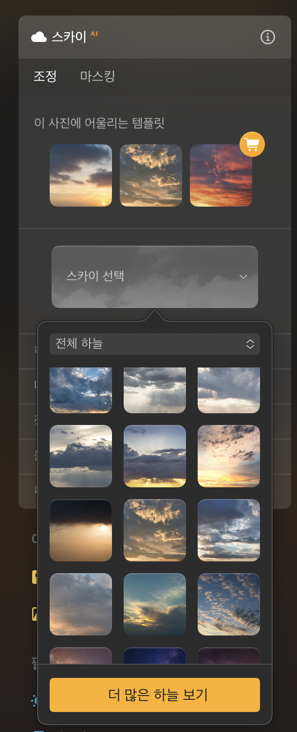 뭉게 구름 떠 있는 파란 하늘부터 노을, 은하수 등 다양한 형태의 하늘 이미지가 있습니다. 사용자는 목록에서 원하는 모양의 하늘을 선택하는 것만으로 손쉽게 풍경을 바꿀 수 있어요. 기본 프리셋도 많지만 가지고 있는 이미지를 추가하거나 마켓플레이스에서 구매하면 더 다양한 형태로 편집이 가능합니다. 저는 주로 흐린 날씨를 보완하거나 노을의 색과 분위기를 강조하기 위해 이 기능을 사용합니다.