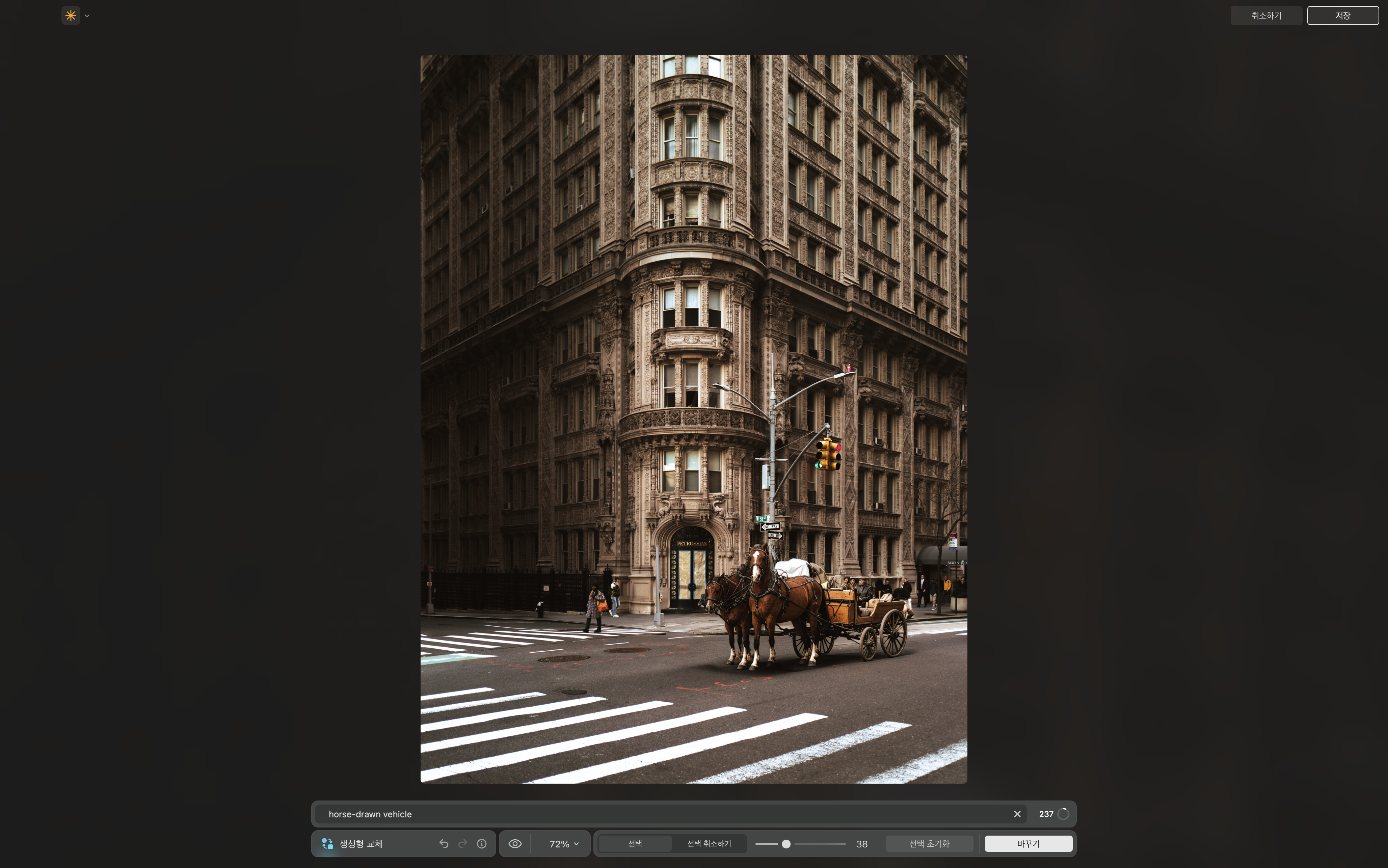 마차를 입력하니 보는 것처럼 택시가 마차로 바뀌었습니다. 제 기대보다 훨씬 그럴듯한 이미지에 원본 사진과도 잘 어울려서 마음에 듭니다.