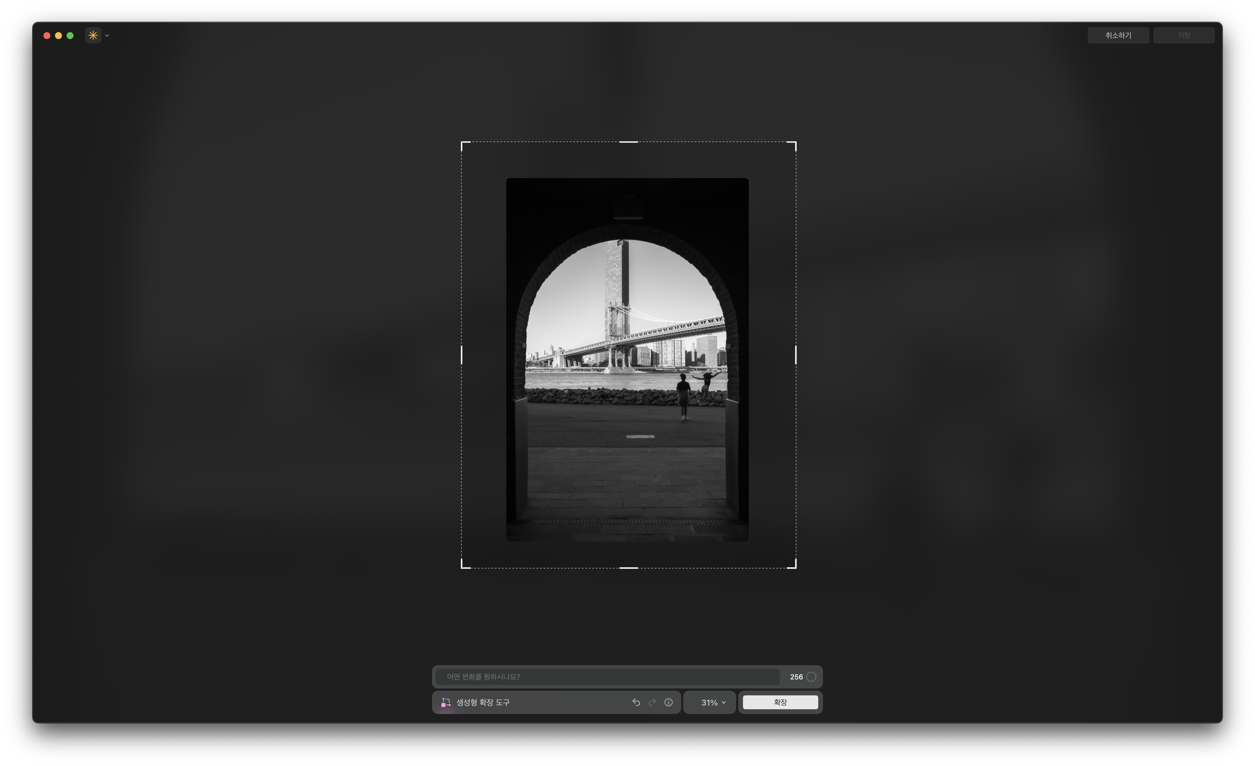 전체 프레임에서 좌/우 여백이 좁아 아쉬웠던 사진은 그럴듯하게 확장이 됐습니다. 주변부가 검정색에 가까운 간결한 사진이라 별다른 스크립트 입력 없이도 자연스러운 결과물을 얻었어요.