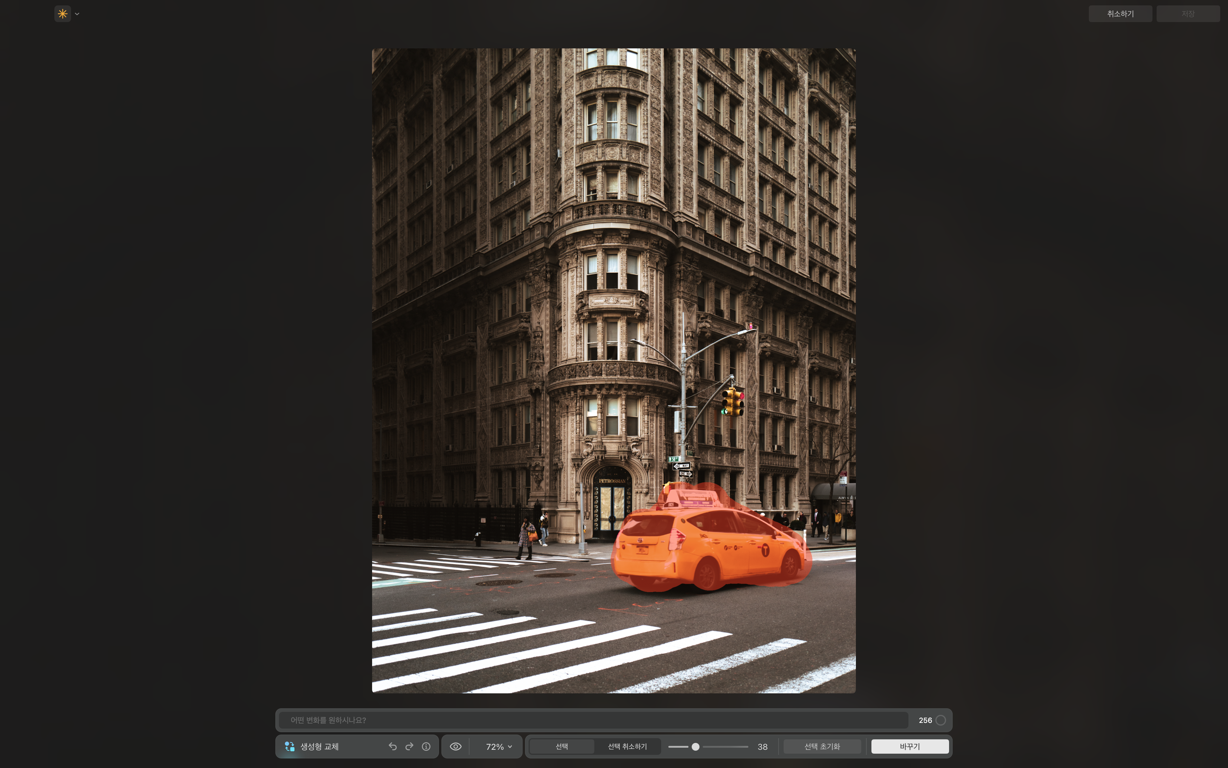 변경할 영역을 선택하면 하단 메뉴에 "어떤 변화를 원하시나요?"라는 문구가 표기됩니다. 이 메시지 창에 원하는 피사체의 형태, 특징, 행동 등을 입력한 뒤 [바꾸기] 버튼을 클릭하면 실행됩니다.