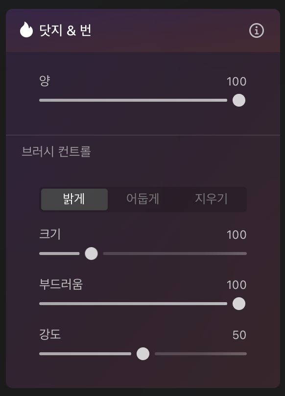 닷지 & 번 기능은 사진 속 일부분의 밝기를 변경할 수 있는 기능입니다. 다른 편집 툴에서는 브러쉬 방식으로 제공되는 기능인데 여기선 보다 쓰기 쉽게 만들어 놓았습니다. 편집하기 화면 하단의 닷지 & 번 메뉴를 선택하면 제어 메뉴가 나옵니다. 브러시의 크기를 선택한 뒤 밝기를 변경할 메뉴를 직접 선택하면 원본보다 밝거나 어둡게 조절할 수 있습니다. 밝기값의 강도는 가장 위에 있는 '양' 옵션으로 제어합니다.